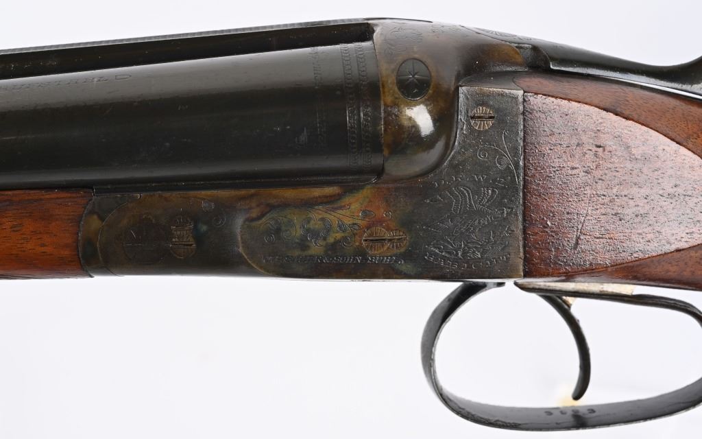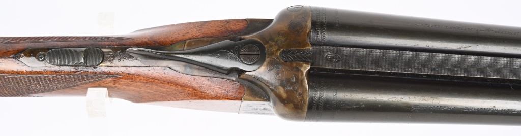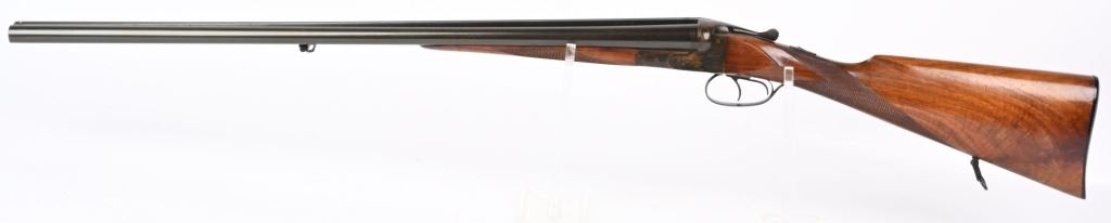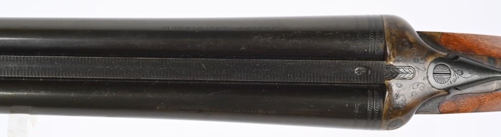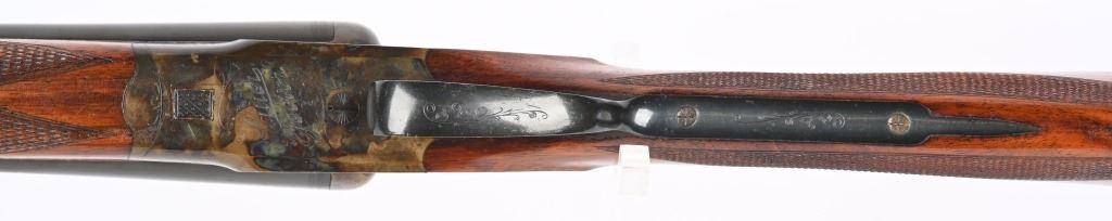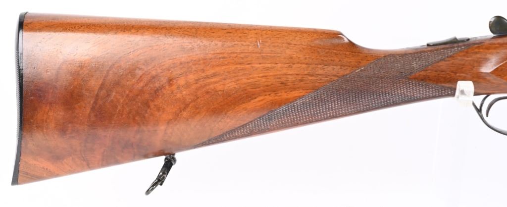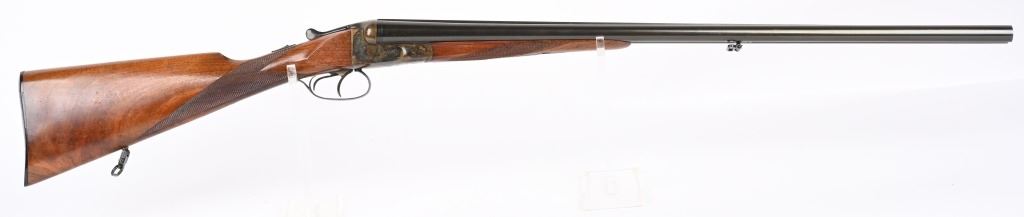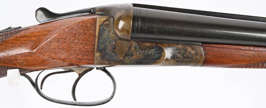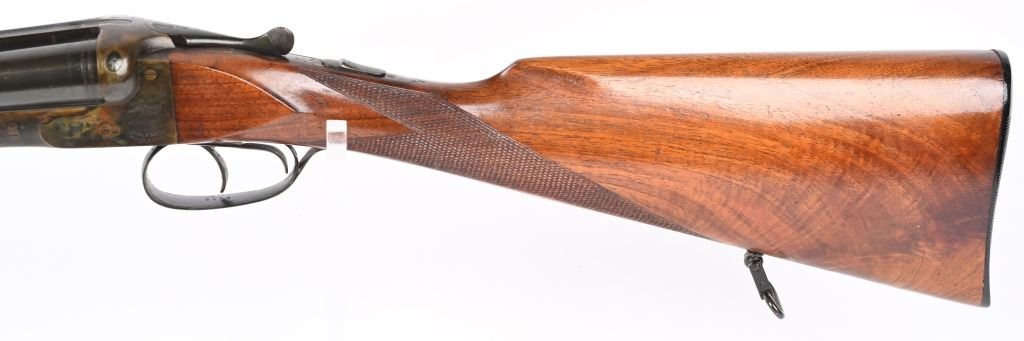 SERIAL NUMBER 343993 BARRELS 27 1/2" CALIBER GAUGE 16 MANUFACTURED 1944. Produced in WW2 Germany with date code 11/44. J.P. Sauer 16 Ga, double shotgun with double triggers and lifter extractors. Straight non-pistol grip stock checkered at wrist with matching splinter fore arm. Box lock frame with blue finished barrels and trigger guard with case colored frame. Plastic S&S monogrammed butt plate. 7/8" sling swivels. LOP, 14 1/4" Drop at heel 2 1/2" drop at comb 2" chamber 2 3/4" choked Improved modified and improved Modified. CONDITION, Very good with stocks being excellent with a few period of use impressions. All metal has been coated with a protective varnish or lacquer. Retains most all case colors and most all blue finish with brilliant bright bores with no dents or distress. Action operates properly however sluggish due to protective coating. C&R
