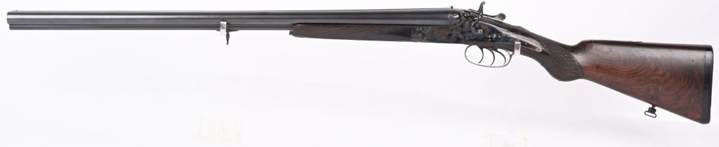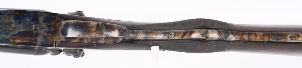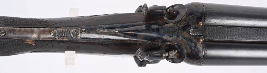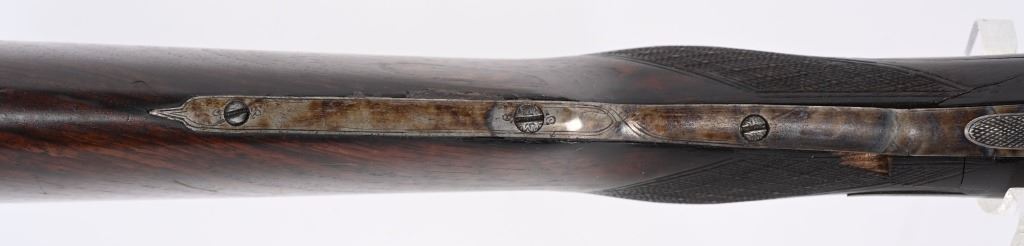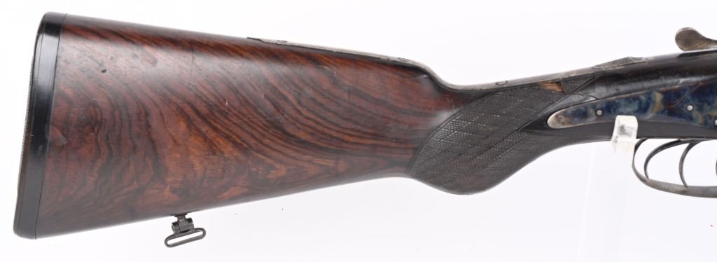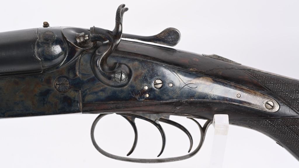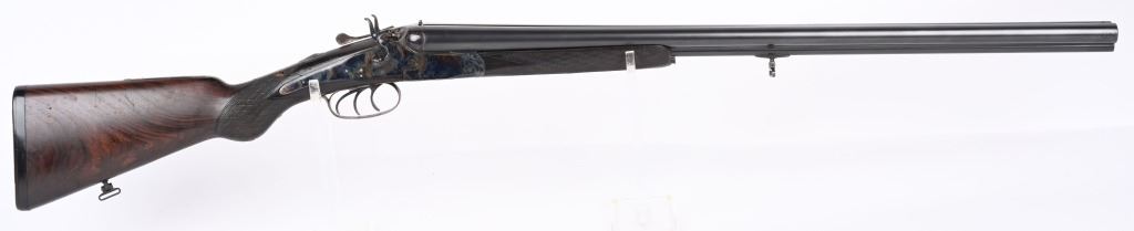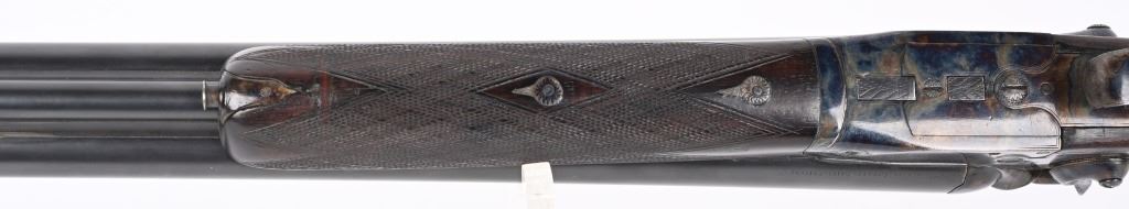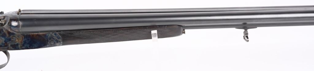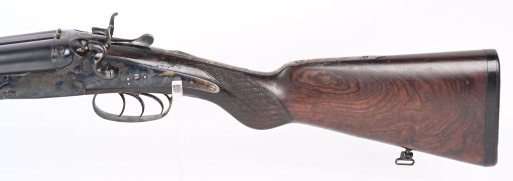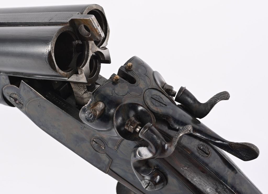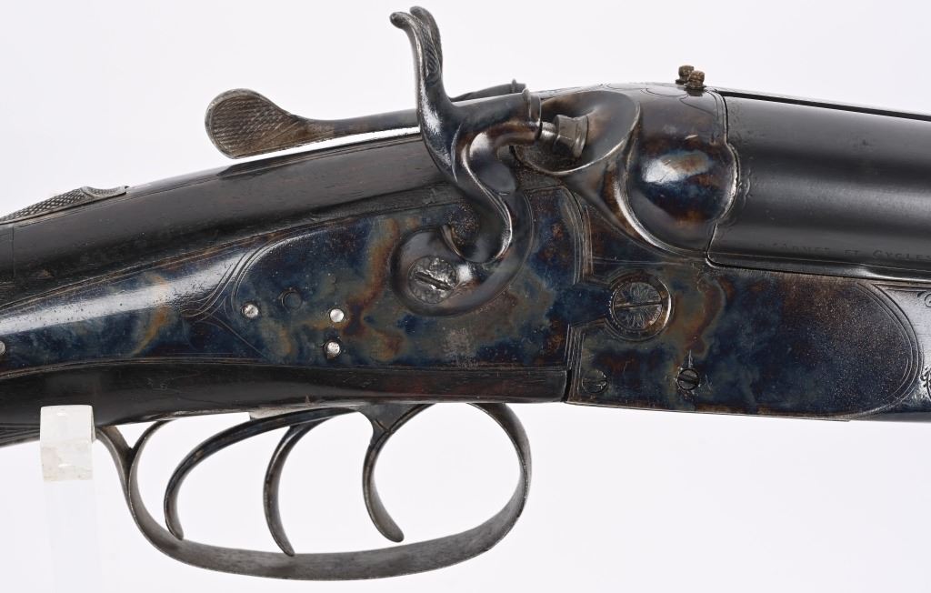 SERIAL NUMBER 2804 BARREL 27 1/2" CALIBERS 40-82 WINCHESTER / 12 GAUGE MANUFACTURED 1932. Pre-WW2 manufactured 3 barrel Drilling combination gun with checkered walnut pistol grips stock. Rust blue finish barrels with case colored side lock actions. Breech marked "D' ARMES ET CYCLES SAINT ETIENNE" French proofs and no retailers markings. Fitted with 7/8" sling swivels , horn butt plate. LOP 14 1/2" Drop at heel 2 1/2" drop at Comb 2 1/4" Chambers 2 3/4" choked Full & Modified. 3 triggers, cocking indicators, CONDITION, Good as refinished with excellent bright bores and properly functioning action. Butt stock has an older repaired crack at wrist with some material loss and is slightly loose. Fore arm shows moderate wear. C&R