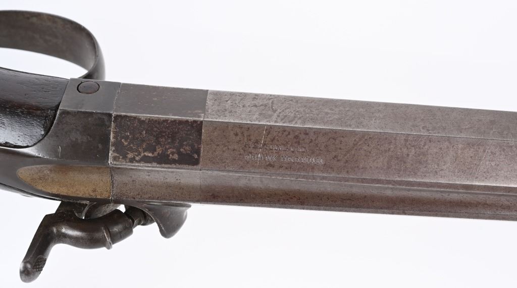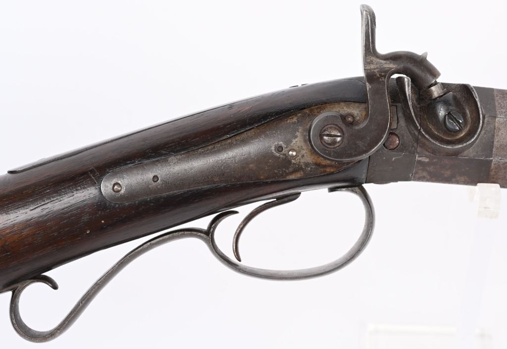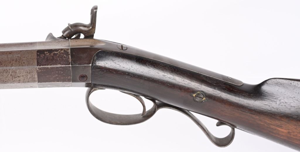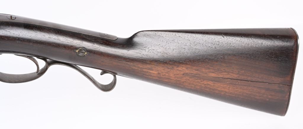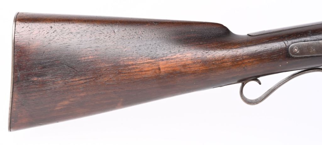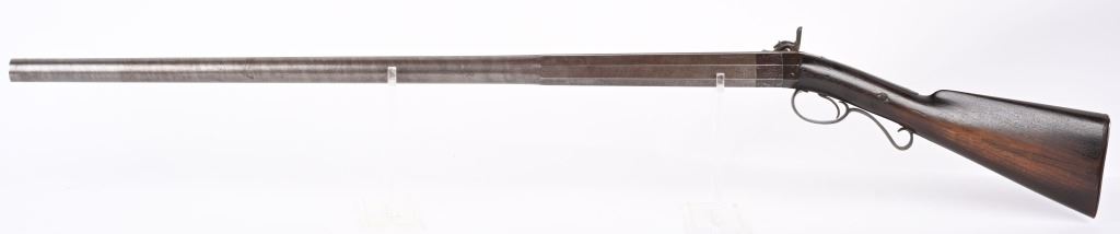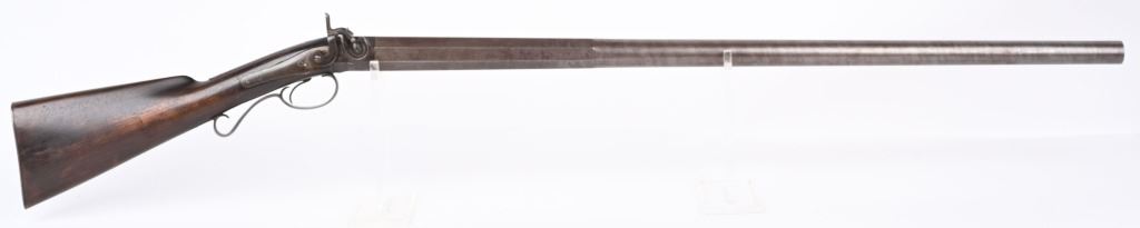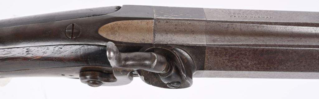 SERIAL NUMBER N/A BARREL 36" CALIBER 8 BORE PERCUSSION MANUFACTURED CIRCA 1870'S. Produced by commercial gunsmith Frank Herman of Michigan as a single barrel Market Hunting Fowler with part octagon "REMINGTON" barrel , back action lock and smooth walnut oil finished stock with smooth steel butt plate. Fluted sight channel with bead front sight. These Market Hunting single shots were used extensively until banned due to the decrease in waterfowl populations by over hunting. Remington produced the barrels as a gunsmith utilized component until the early 1880's. CONDITION. Very good with the bore being lightly frosted . Exterior is a smooth dove grey from exposure to the elements during commercial hunting use. The stock has a spliced repair on right side and damage was probably caused by wood expansion due to moisture , Action operates properly. A very attractive and fine condition market gun. ANTIQUE