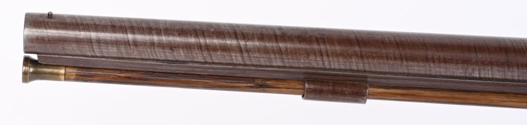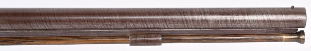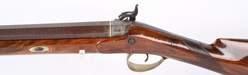 SERIAL NUMBER N/A BARREL 37" CALIBER 8 GAUGE MANUFACTURED CIRCA 1970. Birmingham English proofs with no makers marking and probably intended for the American commercial market. 37 inch vivid Damascus barrel with part octagon part round with wedding band confluence configuration. Brightly case colored breech and back action percussion lock with waterfowl engraved scenes with chiseled borders. Varnish one piece nicely figured English walnut stock with dual barrel retaining wedges with nickel silver escutcheons and fore end tip. German silver trigger guard and butt plate with traditional continental scrolls and chiseled border engraving. These Commercial Market hunting guns were typically hard used and have a very low survival rate. They were discontinued due to being banned from use due to the depletion of the the waterfowl population from over hunting. CONDITION, Exceptionally fine with little or no use being evident. The bore and action are near new while the stock has several small imperfections from period of use storage. The finest condition marked hunting 8 bore observed. ANTIQUE