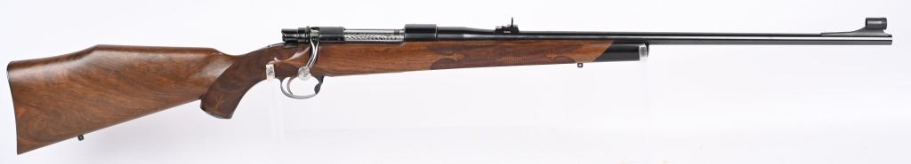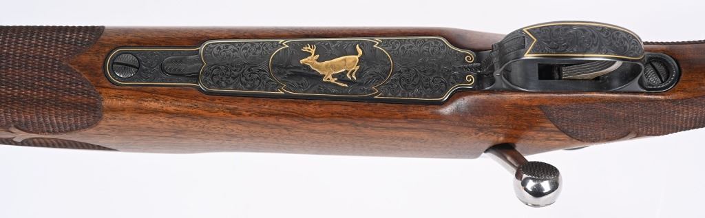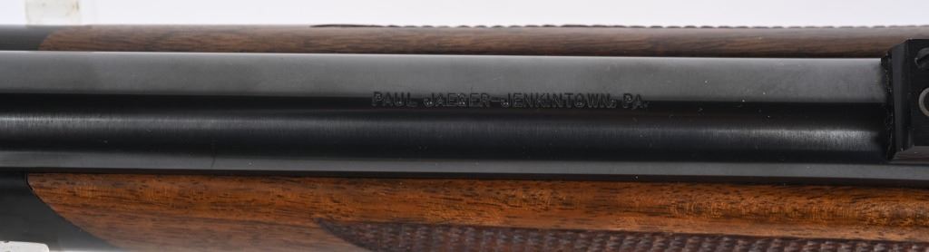 SERIAL NUMBER 5960 BARREL 24 1/2" CALIBER 270 WINCHESTER MANUFACTURED 1964. Custom built and engraved by Paul Jaeger of Jenkintown PA. Blue finished FN Supreme action with ramped and hooded front sporting sight and period adjustable Williams sporting rear sight. Drilled and tapped for scope mounting. Paul Jaeger was known for using Douglas Supreme Barrels and having one of the finest selections of highly figured American black walnut for his stocks. Rifle has an engine turned bolt , magazine follower, extractor spring and extractor. Checkered 2 paned bolt handle and finely checkered steel butt plate with tear drop at top. The trigger guard and floor plate are fantastically engraved and gold inlaid with a vignette of a leaping white tail deer in a forested background surrounded by elaborate tight scroll and vine engraving with dual gold bands and borders. The trigger guard and steel pistol grip cap are engraved with the same tight scroll design. The highly figured walnut stock is ornately checkered at wrist and forearm with fleur de lis at each end and an ebony forend tip. Rifle has been fitted with a Sako trigger and barrel is dated 2/64 on underside of chamber. A fantastic Custom American sporting rifle. C&R