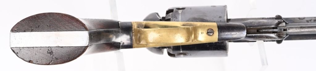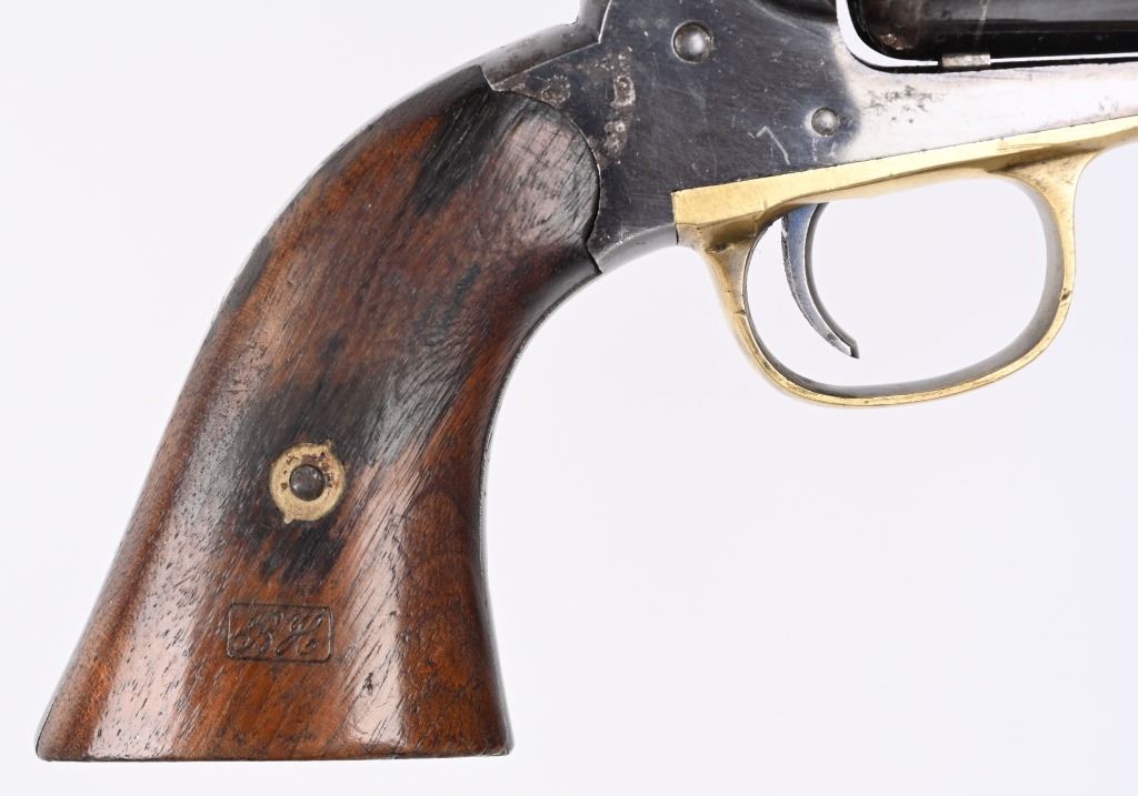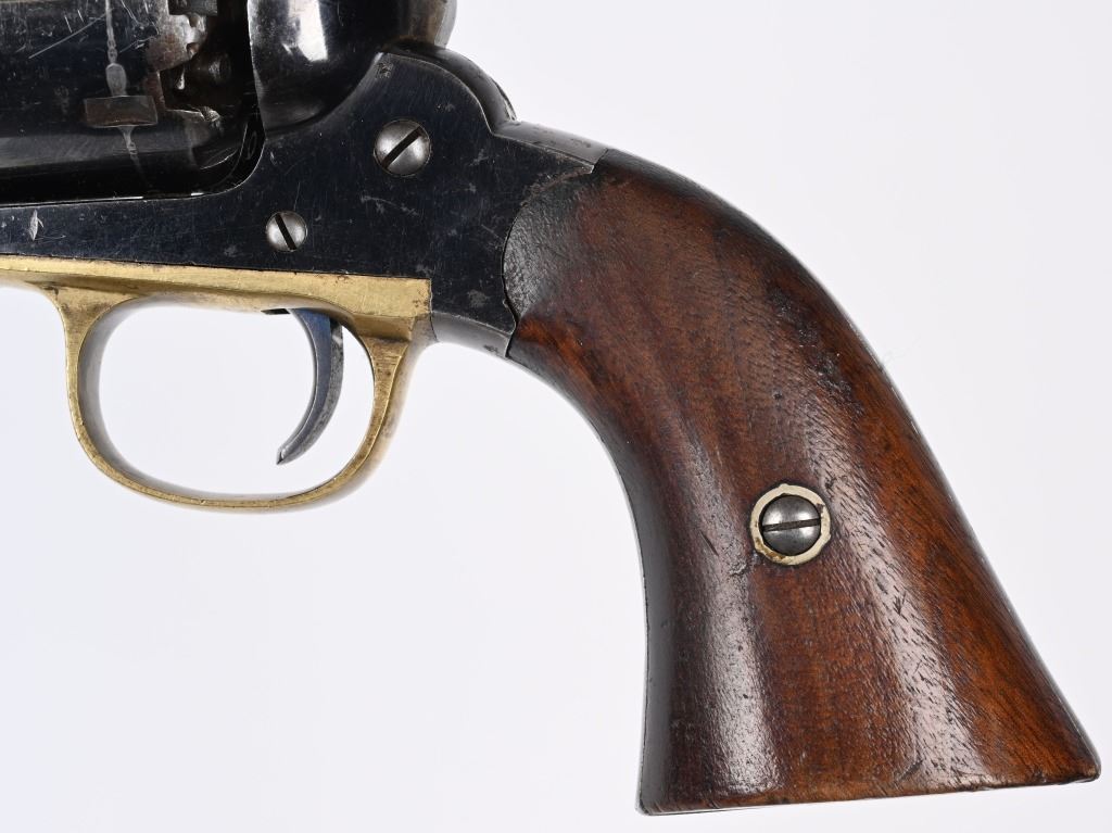 SERIAL NUMBER: 63391. BARREL: 8". CALIBER: .44 CALIBER PERCUSSION. MANUFACTURED: 1860's. Most parts are marked with inspector letter stamps. There is a boxed, military inspectors cartouche on the right grip panel. Blade front sight and v-notch frame rear. Original high polish blued finish and brass trigger guard. Case colored frame and hammer. CONDITION: Metal is fair overall, with heavy finish loss and areas of cleaned pitting. Bright blue can still be seen on the edges and areas unaffected by pitting. Grips have minor handling marks and scratches. Bore has a frosted surface, but the rifling remains strong. Tight hammer and cylinder. Sharp timing and lockup. Some nipples have light pitting, with most being well formed and clean. ANTIQUE