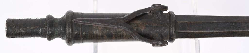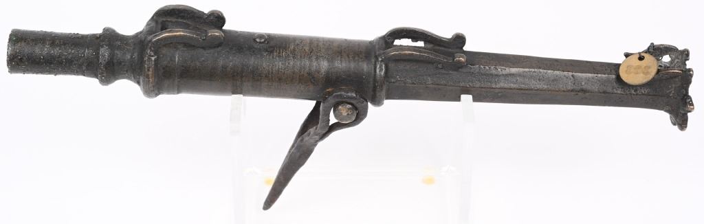 One of the earlier known type of hand held firearms. The bronze Hand Cannons were implemented in China, The Middle East, Sweden and through out the European regions. Octagon to round configuration with a 65 cal bore. Simple flash pan ignition with ornate star pattern flanges at muzzle and resting spike attached to trunions. Measures 13 inches overall with a heavy dark aged patina. A small inventory or museum tag #389 is attached at muzzle. ANTIQUE