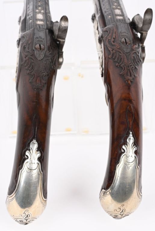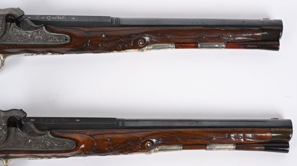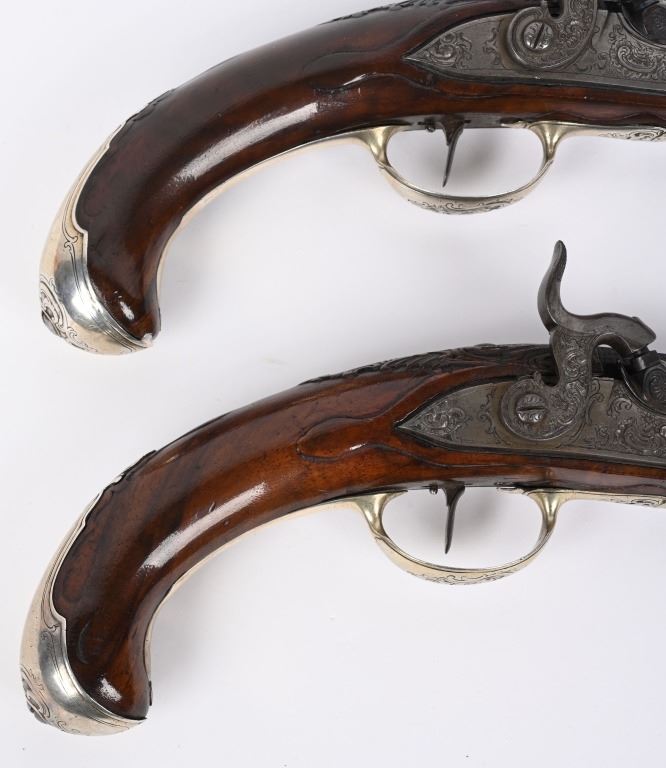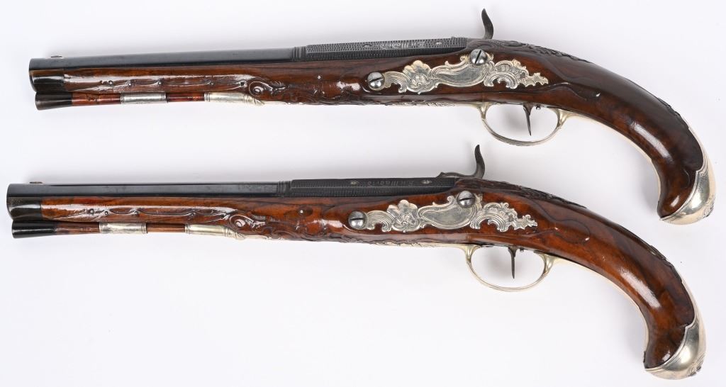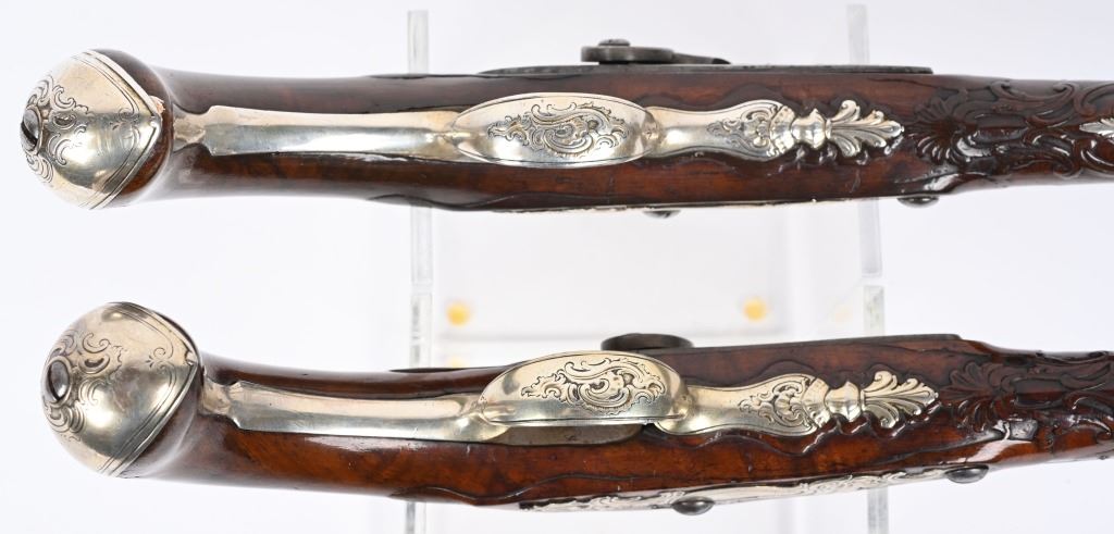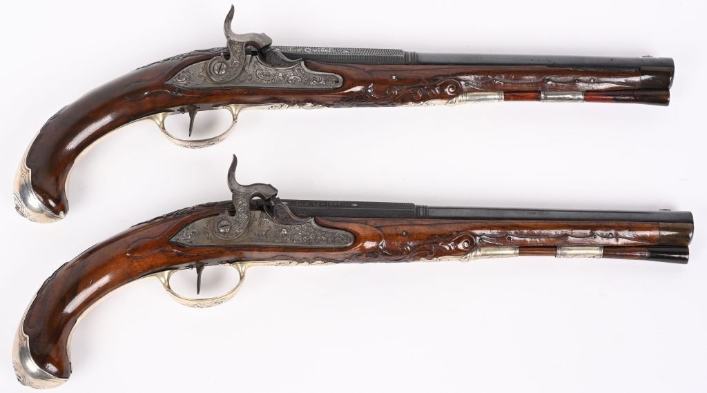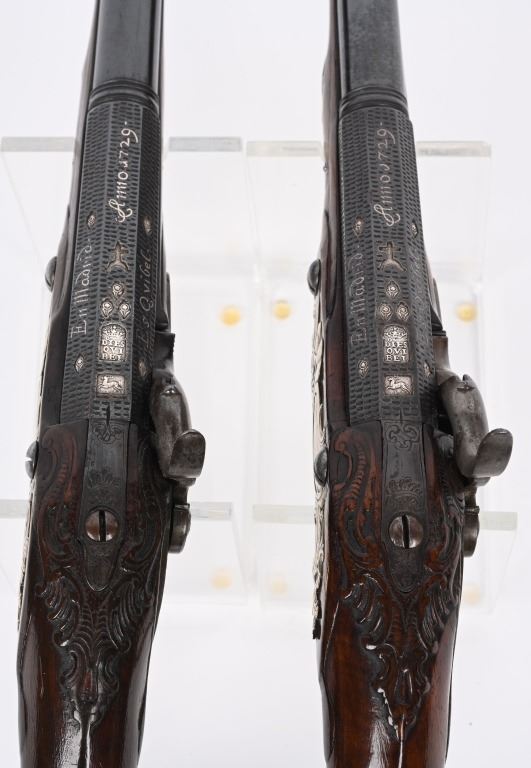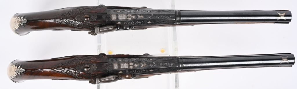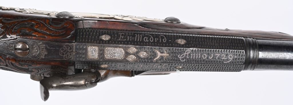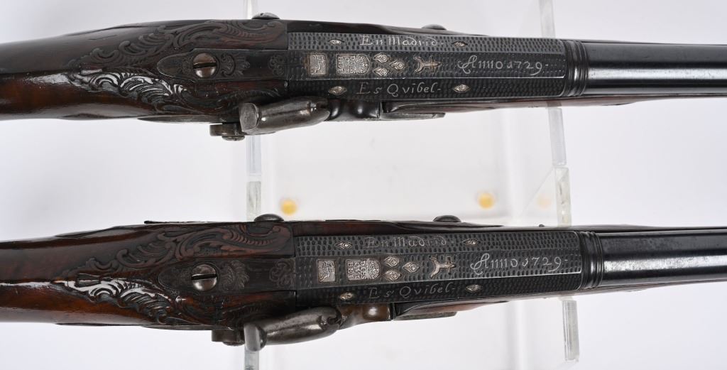 SERIAL NUMBER N/A BARREL 10 3/4" CALIBER .58 MANUFACTURED 1729. Produced in Madrid Spain with swamped 1/2 octagon to round barrels with wedding bands. Silver inlaid on octagon flats "EN MADRID" "1729" " LS QVIBEL" Silver touch mark with crown "DIES QVI BEI" Profusely relief carved walnut stock with horn tip engraved silver butt cap and elaborately embellished silver trigger guard with single set trigger. Lock is deeply relief engraved in scrolls and vine motif. Pistols were converted from flint to percussion in the earlier 1800 period. CONDITIONS. Very fine with stocks being superb with a small sliver missing at right front. Bores are very fine and smooth. Barrels retain most all of their deep rust blue finish and all of their silver inlays. The actions operate properly as do the set triggers. An extremely fine matched pair of Gentleman's belt pistols of the finest quality. ANTIQUE