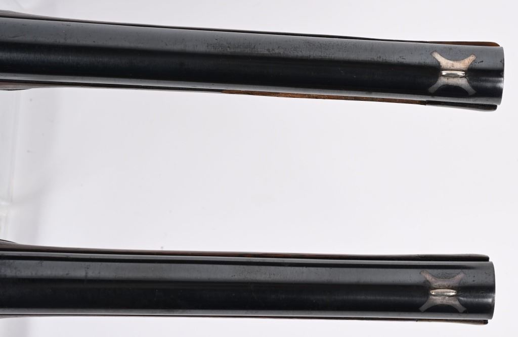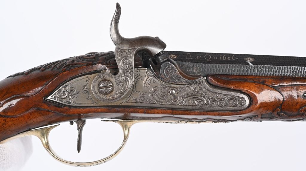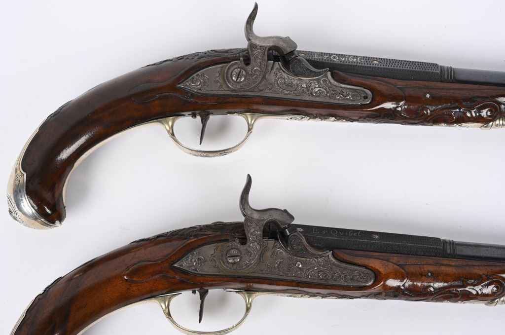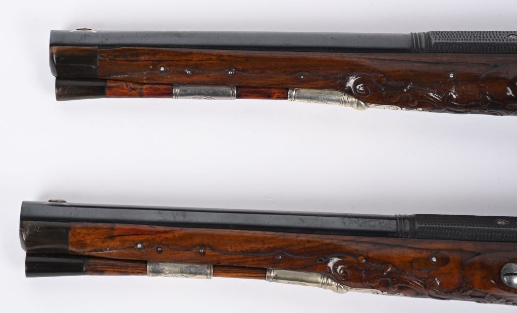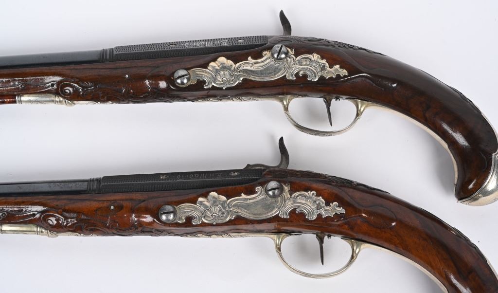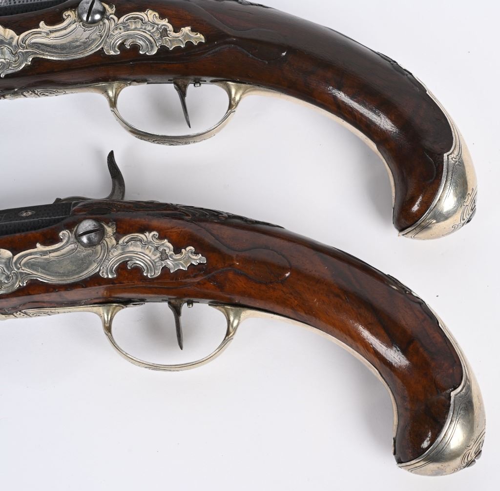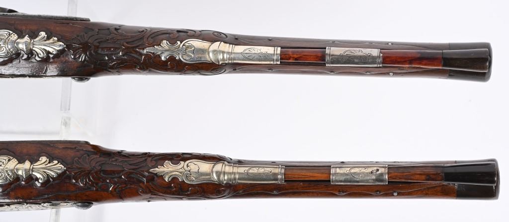 SERIAL NUMBER N/A BARREL 10 3/4" CALIBER .58 MANUFACTURED 1729. Produced in Madrid Spain with swamped 1/2 octagon to round barrels with wedding bands. Silver inlaid on octagon flats "EN MADRID" "1729" " LS QVIBEL" Silver touch mark with crown "DIES QVI BEI" Profusely relief carved walnut stock with horn tip engraved silver butt cap and elaborately embellished silver trigger guard with single set trigger. Lock is deeply relief engraved in scrolls and vine motif. Pistols were converted from flint to percussion in the earlier 1800 period. CONDITIONS. Very fine with stocks being superb with a small sliver missing at right front. Bores are very fine and smooth. Barrels retain most all of their deep rust blue finish and all of their silver inlays. The actions operate properly as do the set triggers. An extremely fine matched pair of Gentleman's belt pistols of the finest quality. ANTIQUE