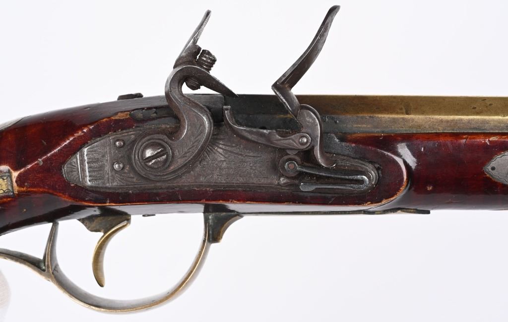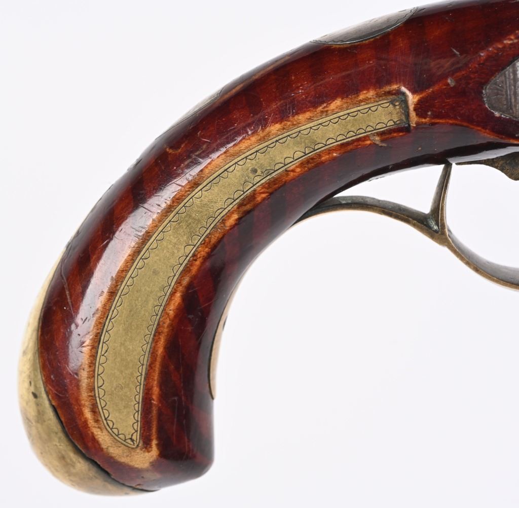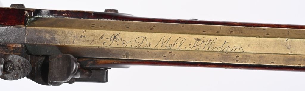 SERIAL NUMBER N/A BARREL 8 5/8" CALIBER 42 SMOOTHBORE MANUFACTURED CIRCA 1820. Brass barreled and brass mounted single shot flintlock pistol with barrel marked "P 7 D MOLL ALLENTOWN" with "C. BIRD & Co PHILAD, WARRANTED" marked lock. Faux striped maple stock with violin finish. Brass but cap with bordered brass stirrups. Dual wedge barrel retention with German silver escutcheons. The Moll family is truly a landmark family in the PA, Lehigh valley firearms trade. Peter & David Moll moved from Allentown to Hellertown in the early 1820's. Sons and grandchildren of John Moll and his father John Moll senior. Known for their brass barreled pistols and sporting rifles P&D Moll ceases to exist in the 1850' era. CONDITION, Good as found and uncleaned. The brass barrel and fittings remain in tarnish with crisp legible legends. The Faux striped maple stock is good with small period of use impressions and bruises and a deep dent at top of wrist but retains its original violin finish. The lock while fully operable has a broken top jaw. ANTIQUE
