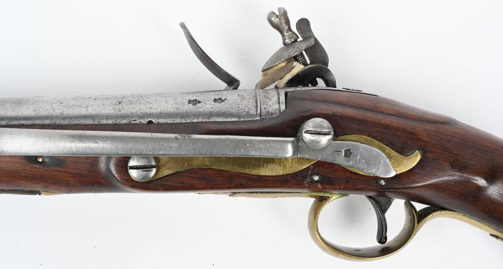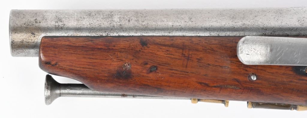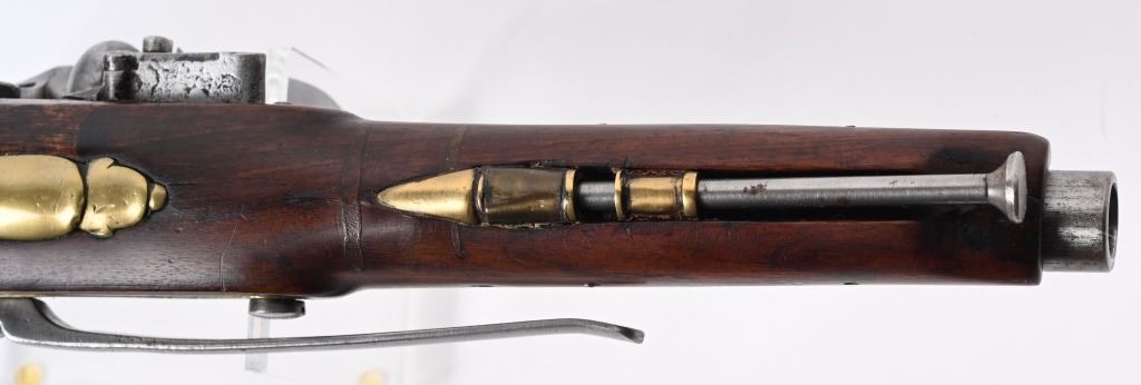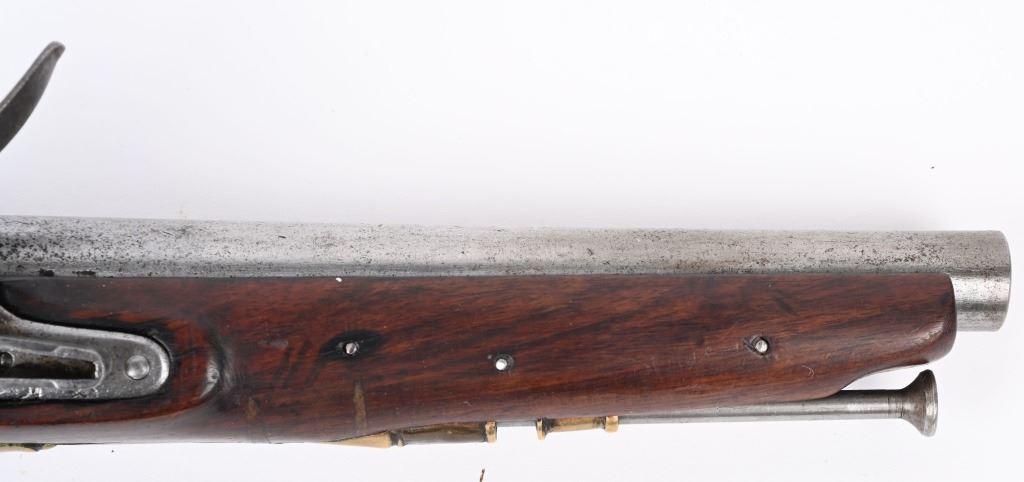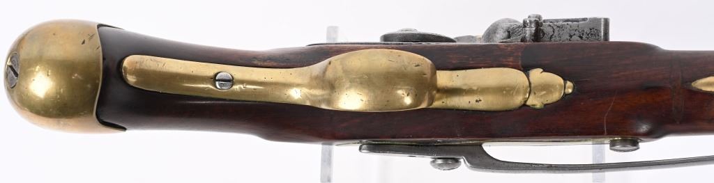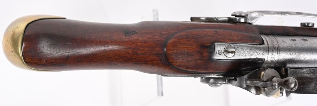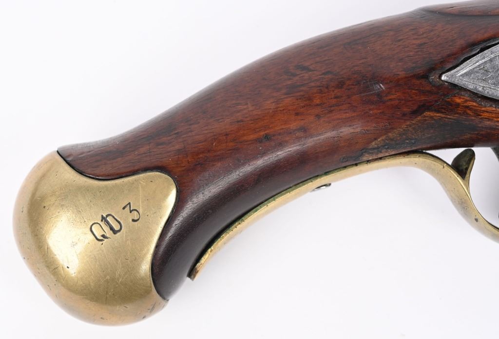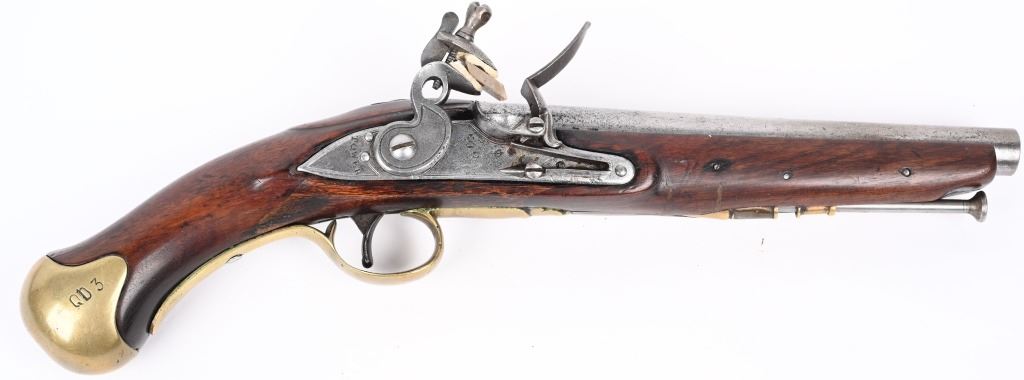 SERIAL NUMBER N/A BARREL 9" CALIBER 56 SMOOTHBORE MANUFACTURED CIRCA 1816. Produced in the India pattern with flat lock marked TOWER at tail with Royal Crown cipher marked GR at base. One piece walnut stock with brass cap and iron belt hook. But cap marked "QD3" believed to be gun#3 quarter deck. Crown GR proofed on barrel , belt hook and stock at wrist. CONDITION. Good with functioning lock and metal having been lightly cleaned at earlier period. Stock is full sized with no distress. Marking are good. ANTIQUE