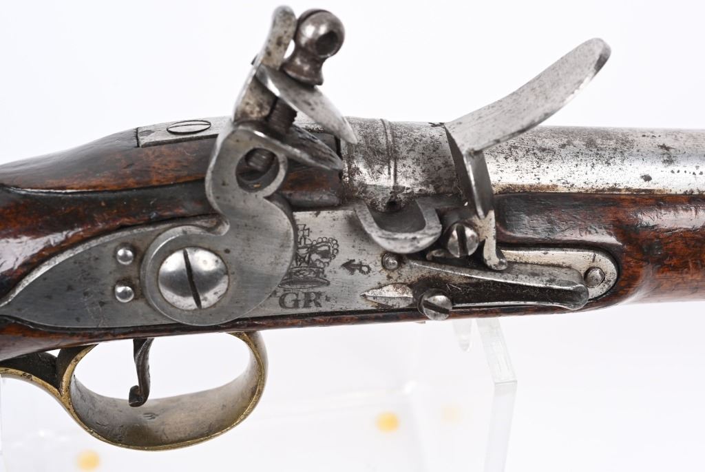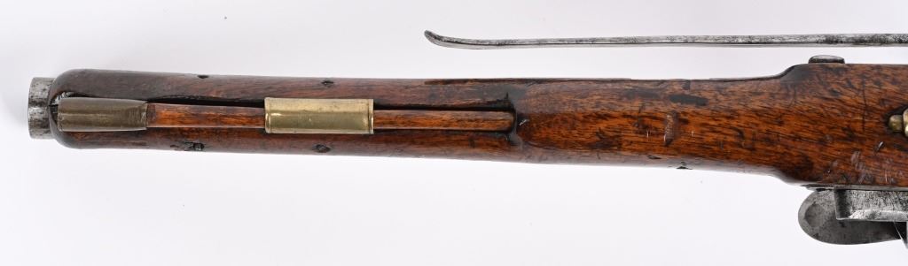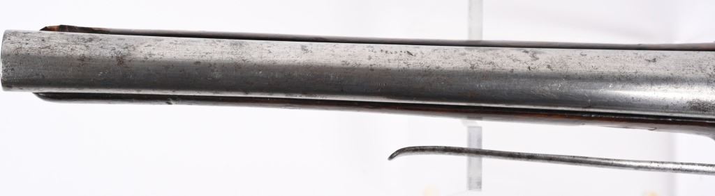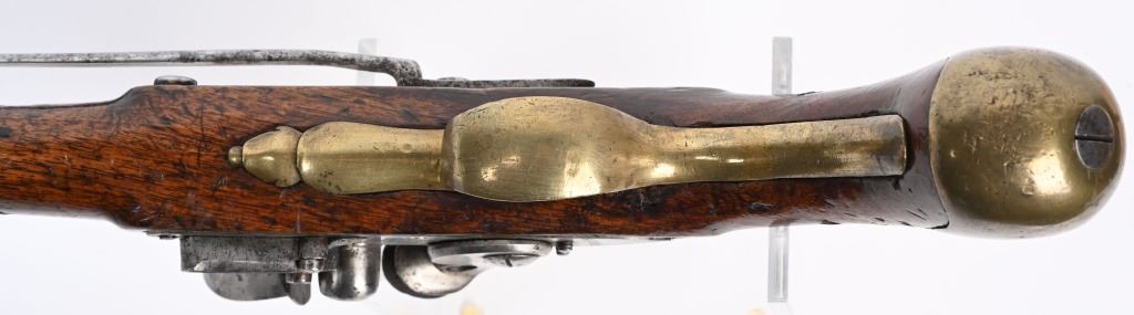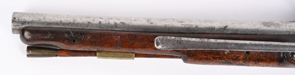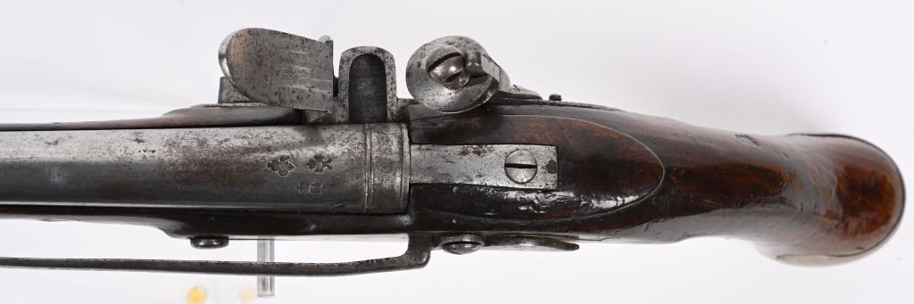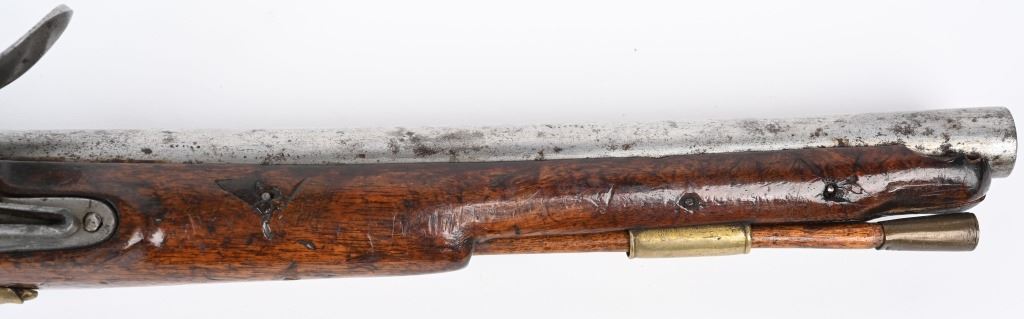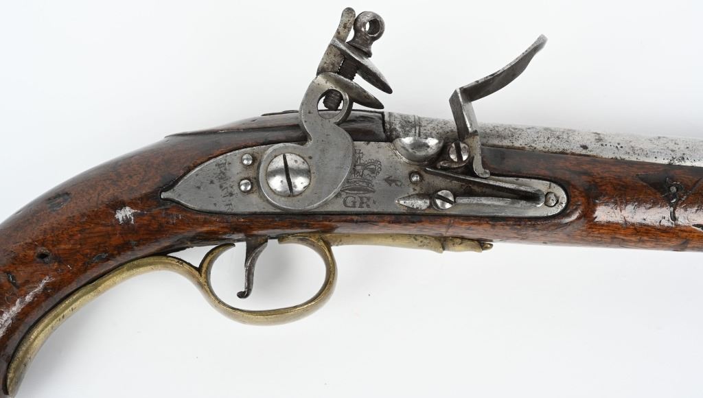 SERIAL NUMBER N/A BARREL 12" CALIBER 566 SMOOTHBORE. MANUFACTURED CIRCA 1870'S. Walnut stock with tapered round barrel with Crown GR proof and Crown IP proof. Lock marked TOWER tail with royal cipher and GR at base. Brass trigger guard and butt cap. Single loading rod pipe of brass with no guide. CONDITION, Good with a pleasant mottled grey color. Stocks have had additional finish added. Small chip at muzzle of stock and several bruises and impressions from period of use. Lock fails to hold at full cock and tumbler needs attention ANTIQUE