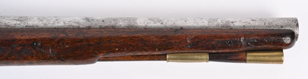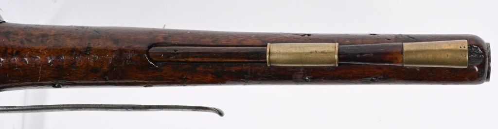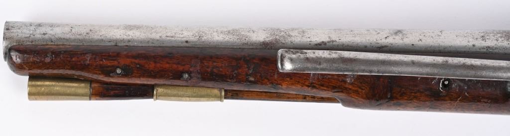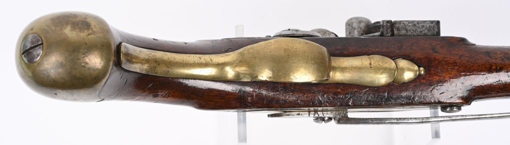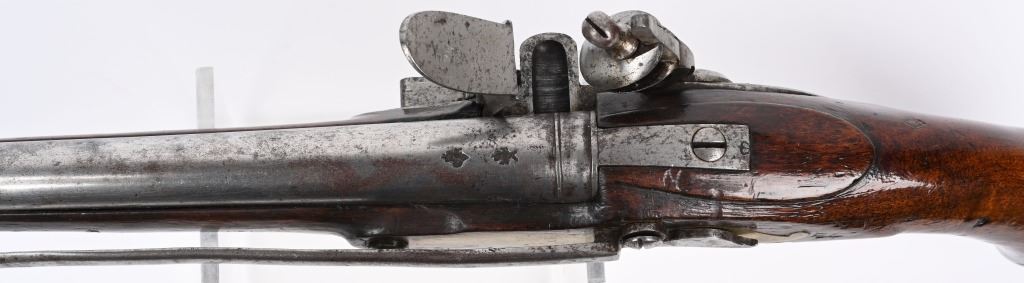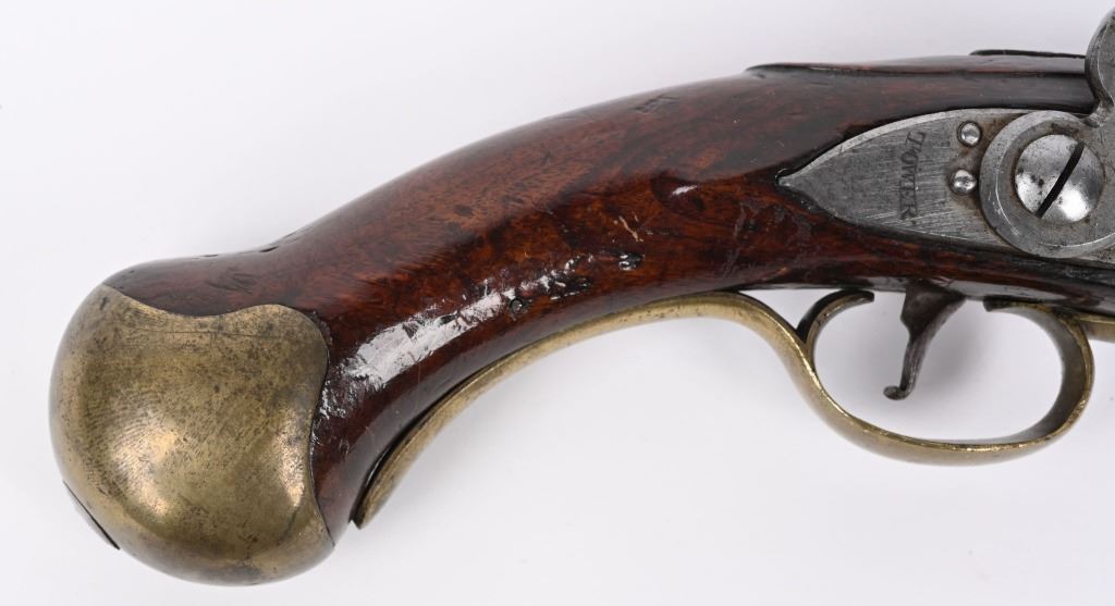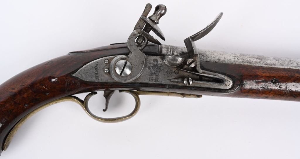 SERIAL NUMBER N/A BARREL 12" CALIBER 566 SMOOTHBORE. MANUFACTURED CIRCA 1770'S. Walnut stock with tapered round barrel with Crown GR proof and Crown IP proof. Lock marked TOWER tail with royal cipher and GR at base. Brass trigger guard and butt cap. Single loading rod pipe of brass with no guide. CONDITION, Very fine with crisp markings. Metal is a pleasant grey overall with good bore. Lock operates properly, Stock is full sized and very fine with a few period of use impressions. ANTIQUE