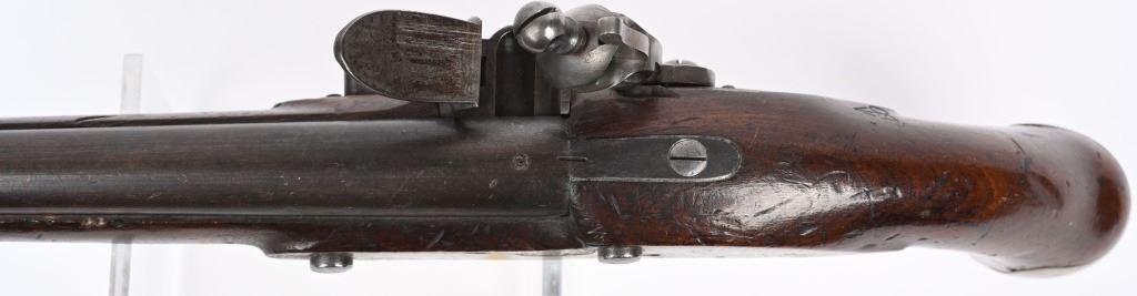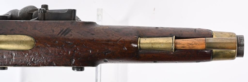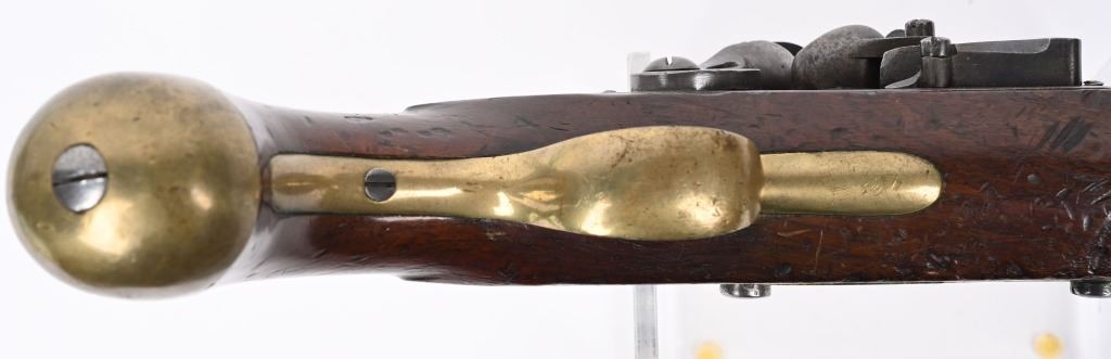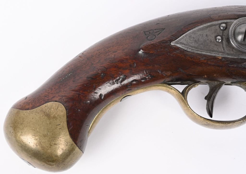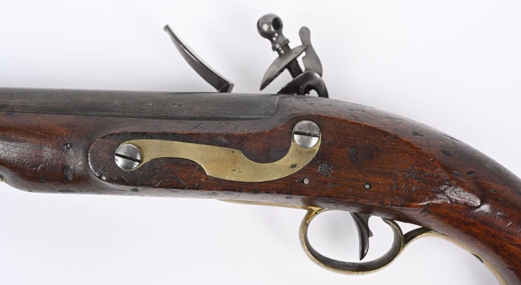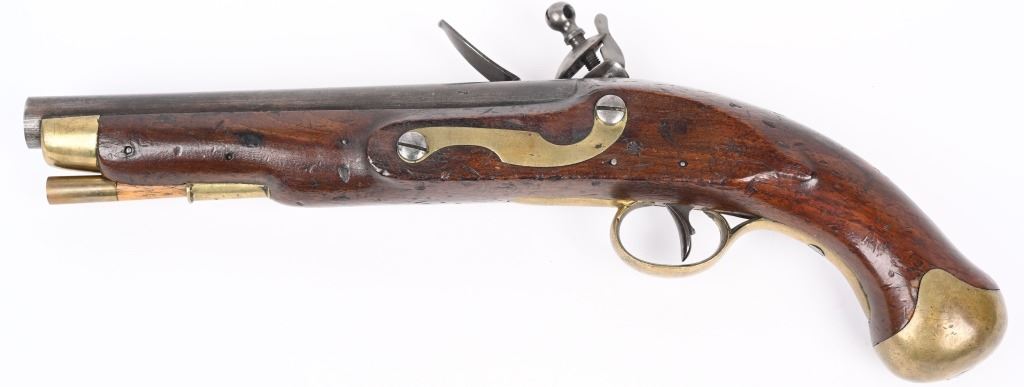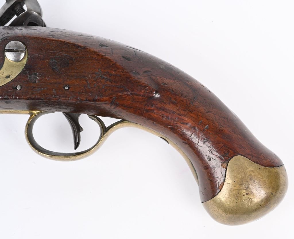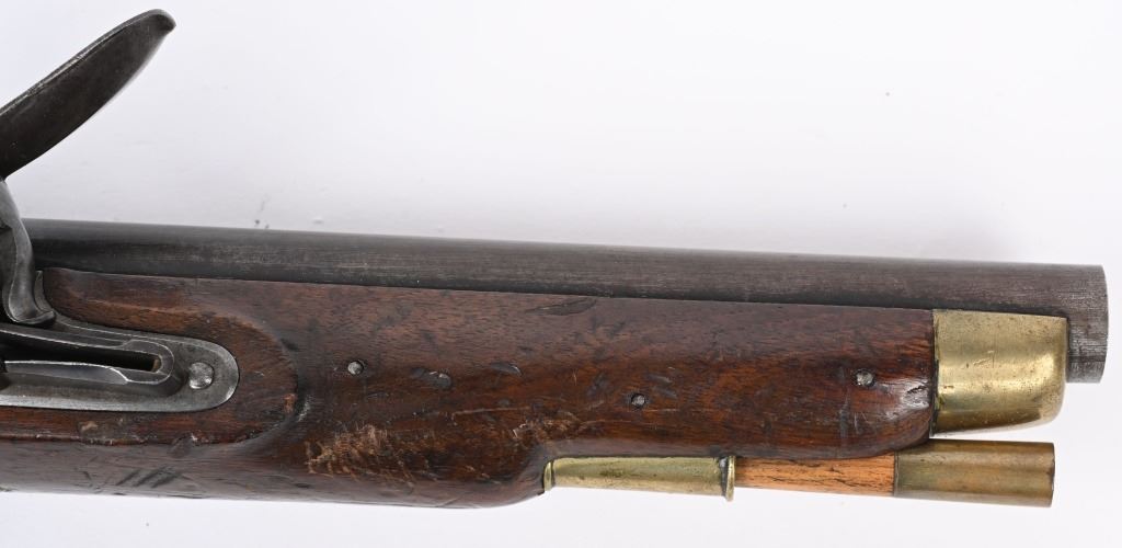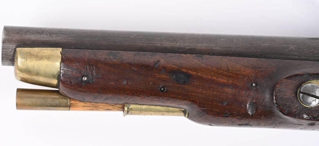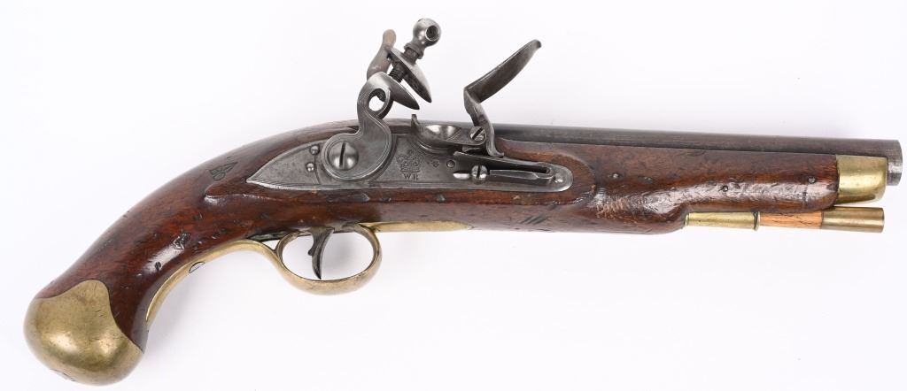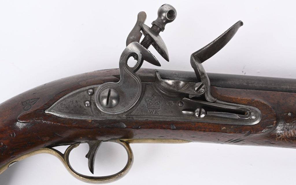 SERIAL NUMBER N/A BARREL 8 1/2" CALIBER 56 SMOOTHBORE MANUFACTURED 1830-37. Marked with the Rare Royal crown cipher WR on lock and barrel for the short reign of King William IV (1830-37) Walnut stock with brass butt cap & trigger guard with flat India pattern lock with WR cipher and tapered round barrel with Crown proofs. Brass forend cap and single rod pipe of brass. Pistol is a Field refit with the updated lock and barrel. Hickory wiping rod with brass tip. CONDITION, Very fine with barrel and lock having an untouched brown patina. Very good bore and properly functioning lock. Stock is very good with some light period bruises. A quite scarce variation of the British flint martial pistol. ANTIQUE