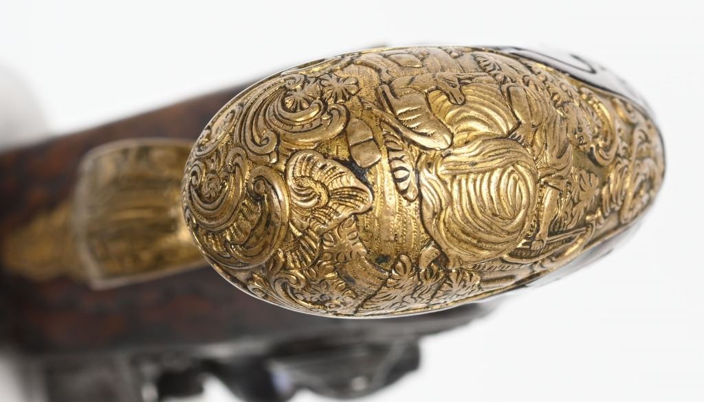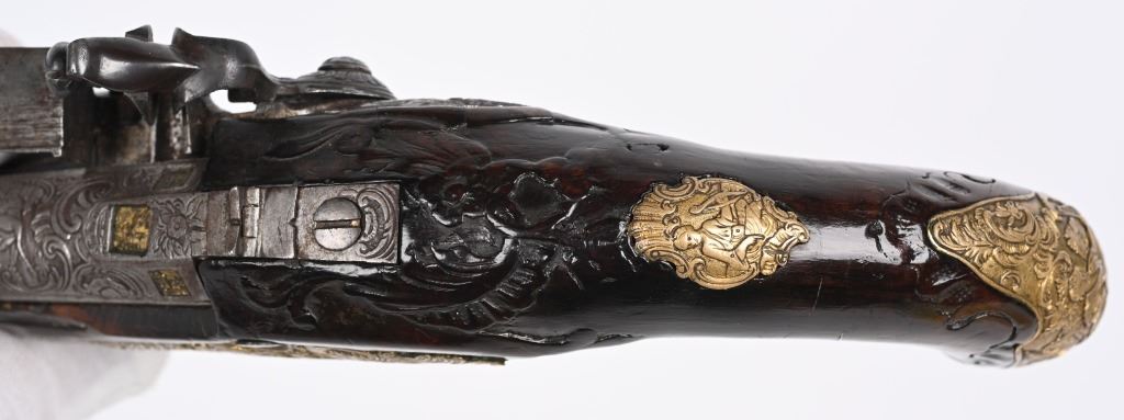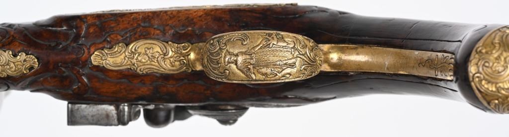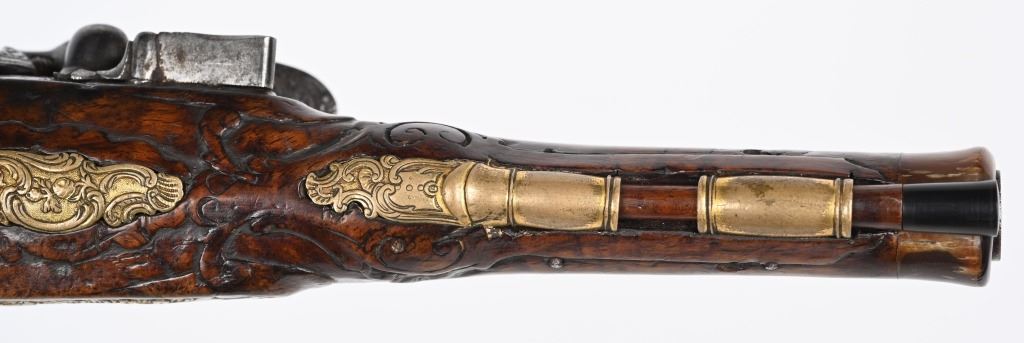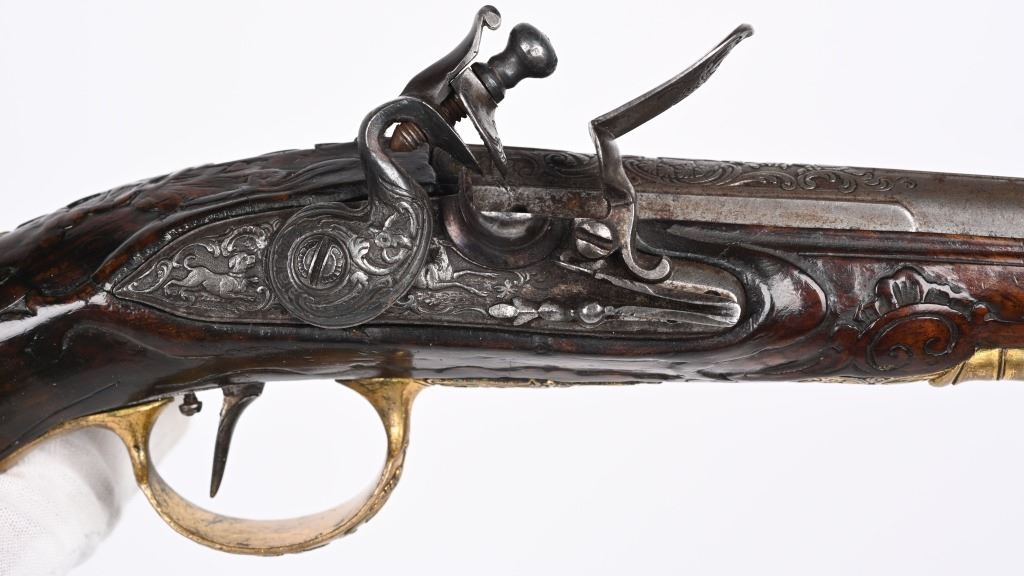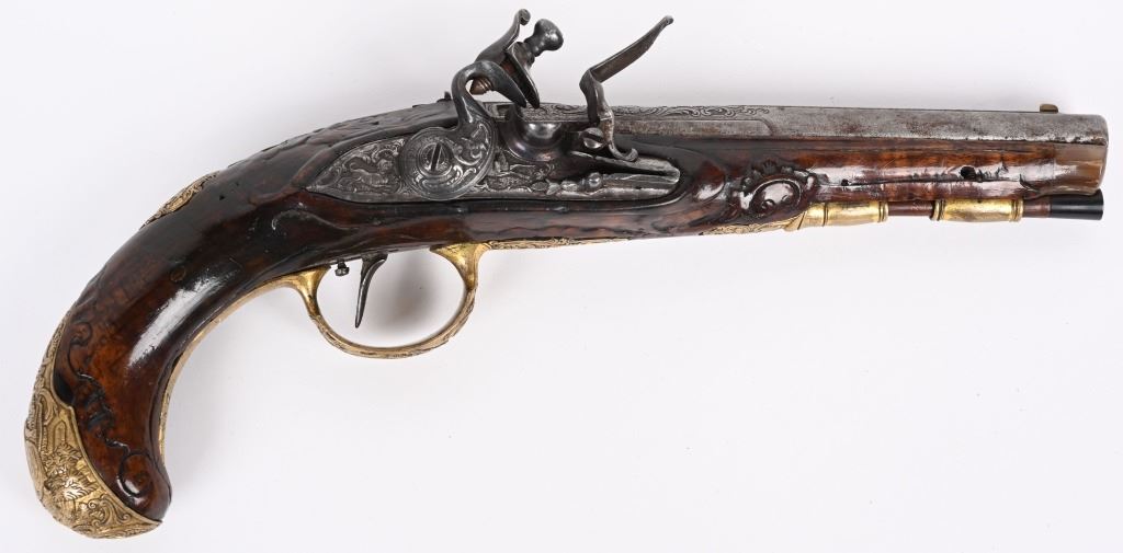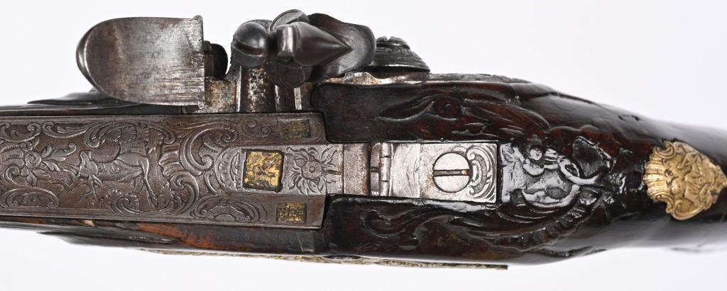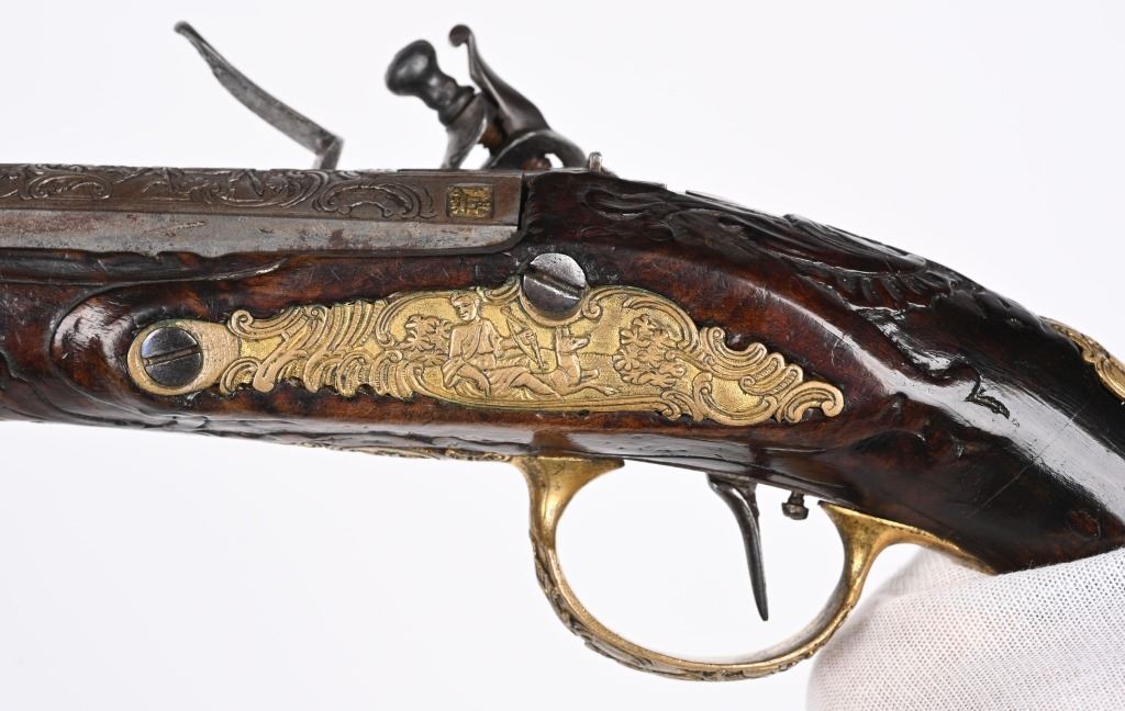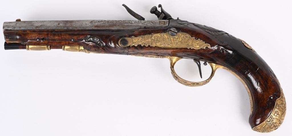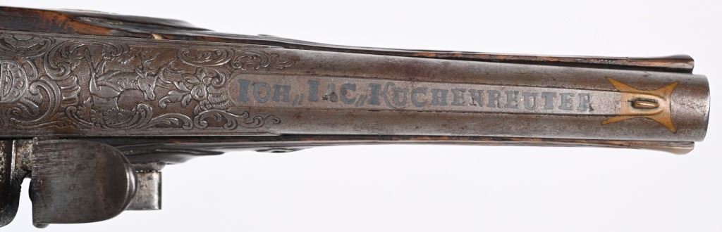 SERIAL NUMBER N/A BARREL 6 1/4" CALIBER .42 SMOOTHBORE MANUFACTURED CIRCA 1780. Produced in Regensburg Germany by Johan Andreas Kutchenreuter who was a contemporary to Boutet and a purveyor of embellished best quality arms to royalty. The Kutchenreuter family manufactured arms for many generations. The highly embellished pistol with gold & silver inlays is signed "JOH, IAC, KUTCHENREUTER" in silver on a flat rib, The barrel is relief engraved with a games scene of a stag in a woodland background surrounded by scrolls. The heavily relief carved walnut stock is carved with broad borders and scrolls surrounding the lock plate, rod fullers butt cap and tang. The round body flint lock is relief engraved with a single hound in pursuit of a stage while the cock is engraved with scrolls. The gold washed butt cap and wrist escutcheon are both relief carved with a rendition of the Greek Goddess of hunting and animals, Artemis with her bow surrounded by deep scroll and vine motif. The left side plate is relief engraved in a very similar rendition of Artemis with her bow and surrounded by a hound and foliage. The gold washed trigger guard is relief engraved with a sportsman with his long gun and a felled stag amongst a woodland background. The pistol is equipped with a single set trigger , 2 rod ferrules that are lightly engraved and gold washed and a wooden loading rod with horn tip. CONDITION, Very good with fine wood stocks and metal having a very light mixture of uncleaned patina. The lock and trigger mechanisms operates properly. ANTIQUE