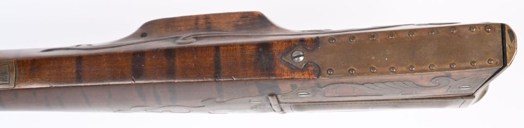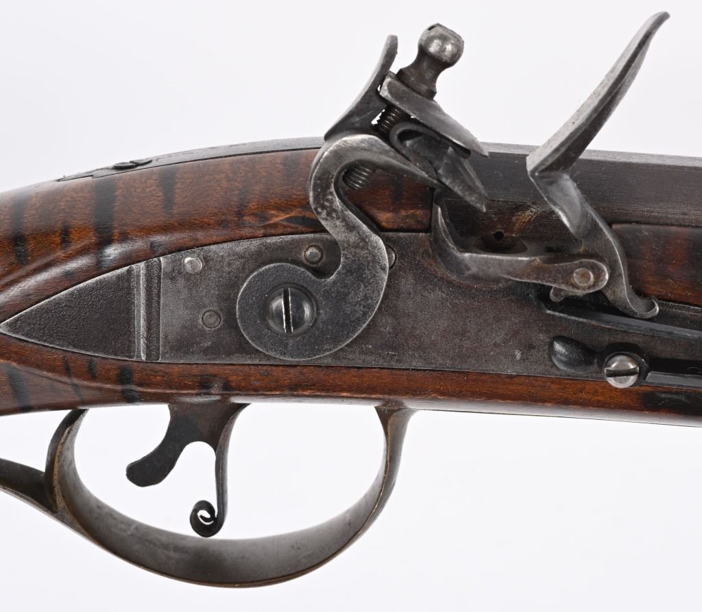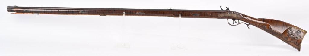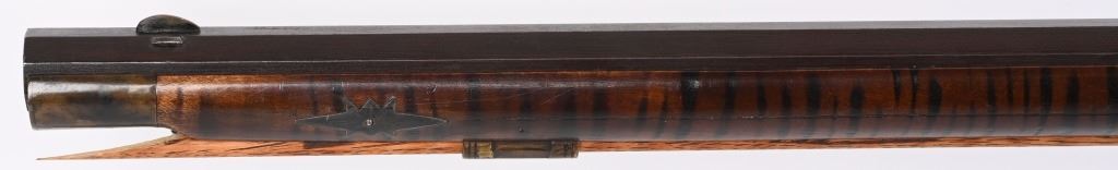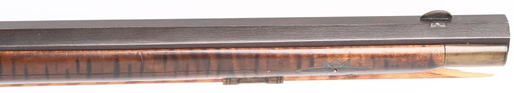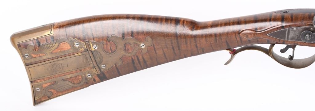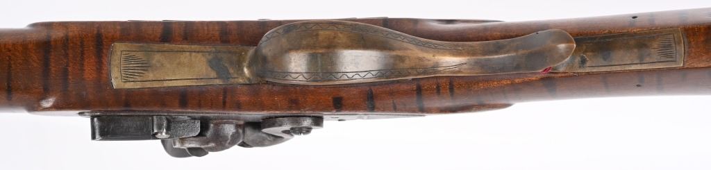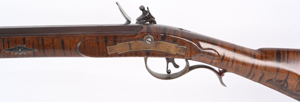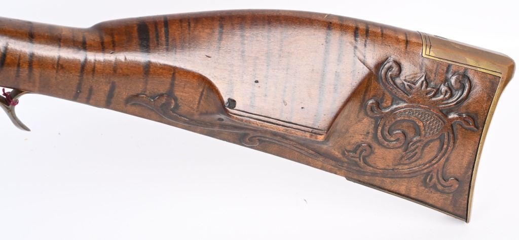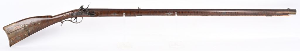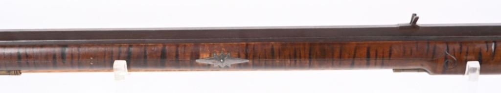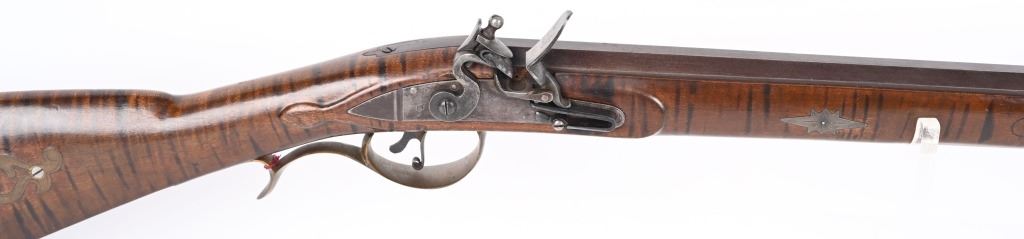 BARREL 46". CALIBER .45. Modern made Pennsylvania style Full Stock Flintlock Rifle, by D.D. Riveroll. Features brown finish, lightly inscribed brass trigger guard, Lebanon County style Patch box and toe plate, pigtail trigger, and unmarked lock plate. Lightly relief carved cheek piece walnut stock with burnished stripes. Brass ramrod ferrules with hickory ramrod that extends approx. 2-1/2'' beyond muzzle. Decorated brass side plate with silver star-shaped escutcheons as barrel pins. Nicely crowned muzzle with 8 circle-dot design near crown. Condition. Excellent to near mint as built with some age toning to brass. Stock shows some light handling. Maker's name lightly impressed inside patch box. A very heavy quality built flintlock rifle. ANTIQUE
