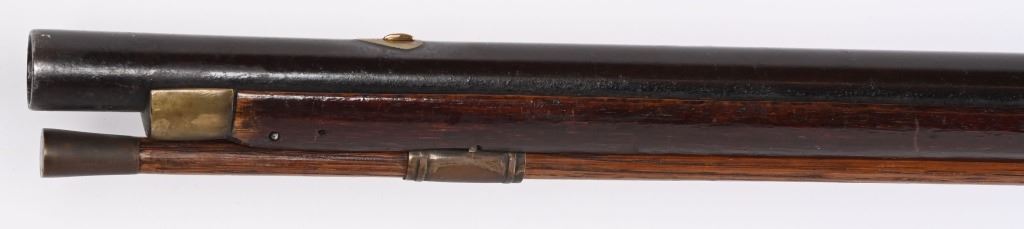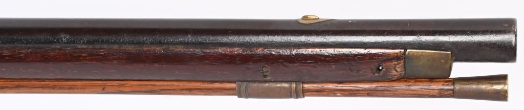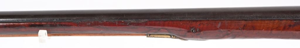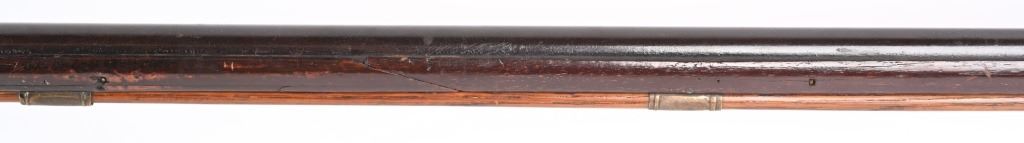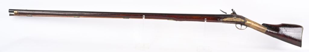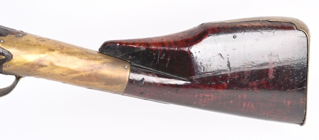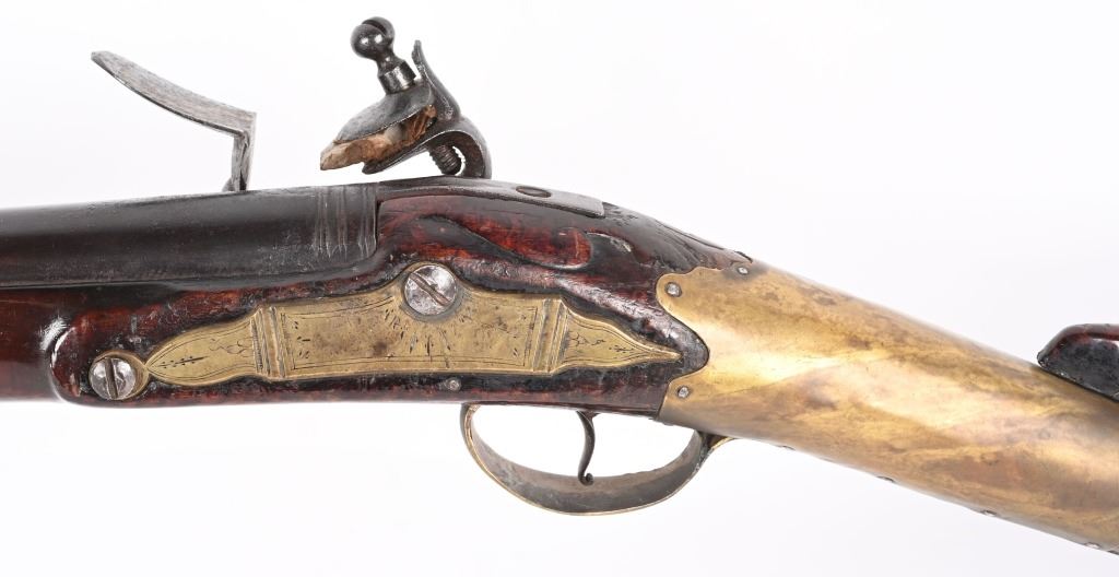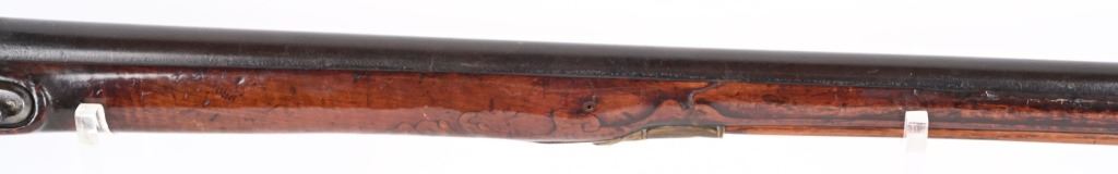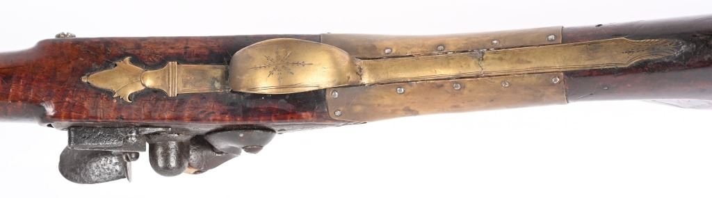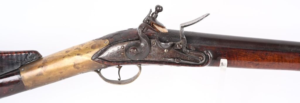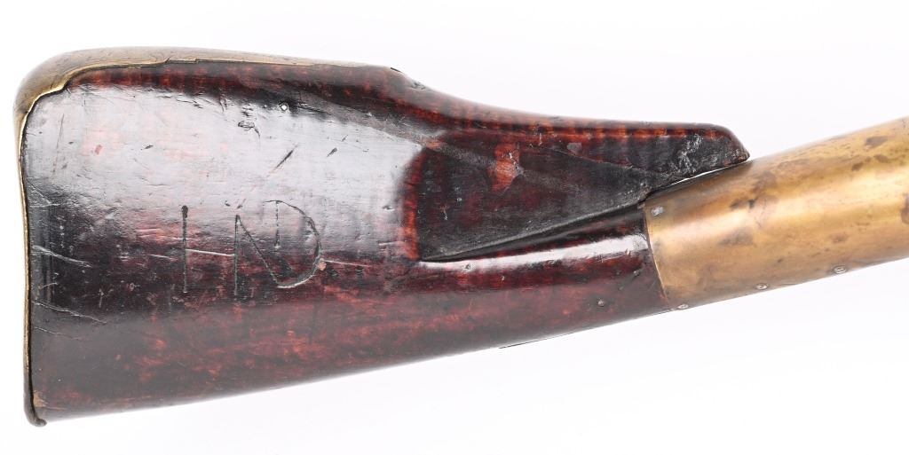 BARREL 50". CALIBER 70. This BUCK & BALL pre Rev War musket has a British Brown Bess type profile, full length walnut stock with a piano hand rubbed oil finish and features a full round barrel, flintlock plate has scroll and leaf pattern engraving, iron hardware with brass furniture. There are four brass pipes and what appears to be a vintage wooden rod. The stock has an ancient period correct brass repair at wrist and the letters HD hand carved in stock. Given its period of use from the mid 18th century through the American Revolution, it is a stunning testament to the forming of our country. All iron hardware is a rich smooth patina the the brass has taken on that much aged patina. Stock has usual dings, few chips at upper edge and two small cracks on fore-arm. It just drips history and the stories entailed. These were used in up-state New York in some of the bloodiest fighting of the war. ANTIQUE