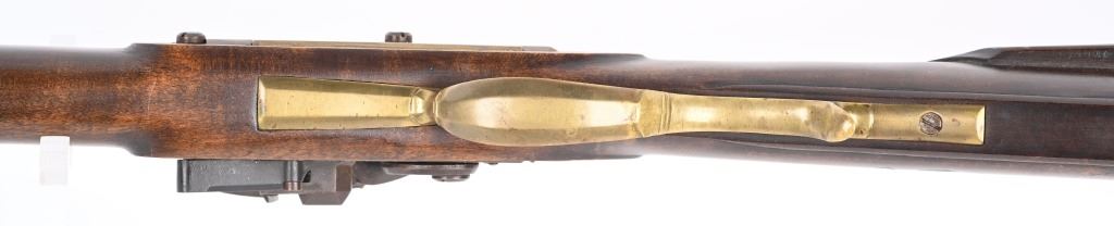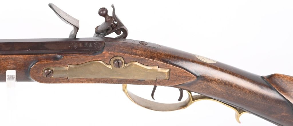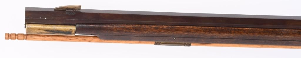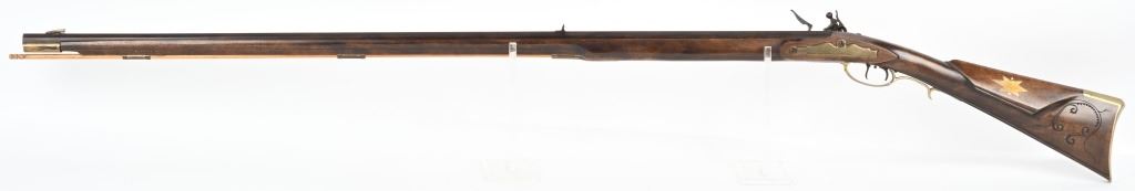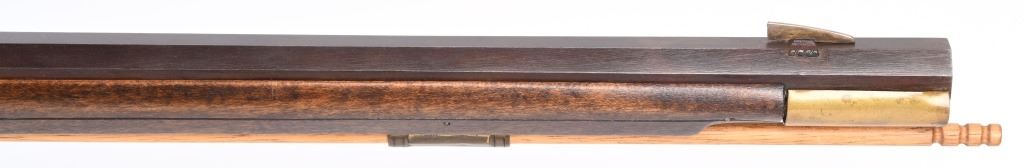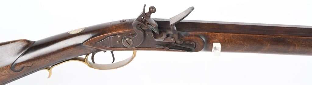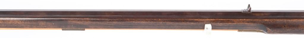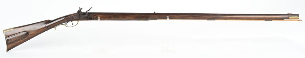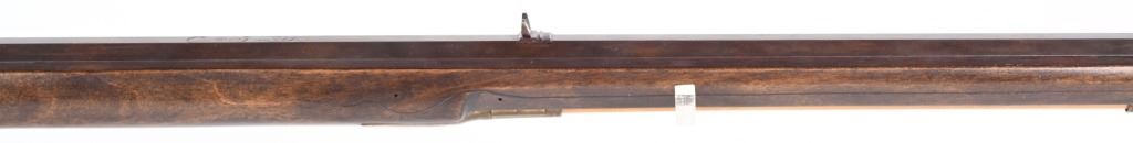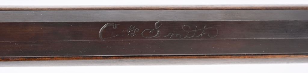 SERIAL NUMBER N/A BARREL 44" CALIBER .38 RIFLED BLACKPOWDER MANUFACTURED CIRCA 1990'S. Attributed to Curtis Smith of Covington Va, Flintlock long rifle with full octagon barrel, wooden patch box, Robbins pattern flint lock action and double set triggers. Signed on top barrel flat "C. SMITH" and marked on side at breech "LXX" Dark finished maple stock with brass furniture, blade front sight and drifty adjustable rear sight. CONDITION, Very fine with little use being evident. Bore is excellent and action operates properly. ANTIQUE