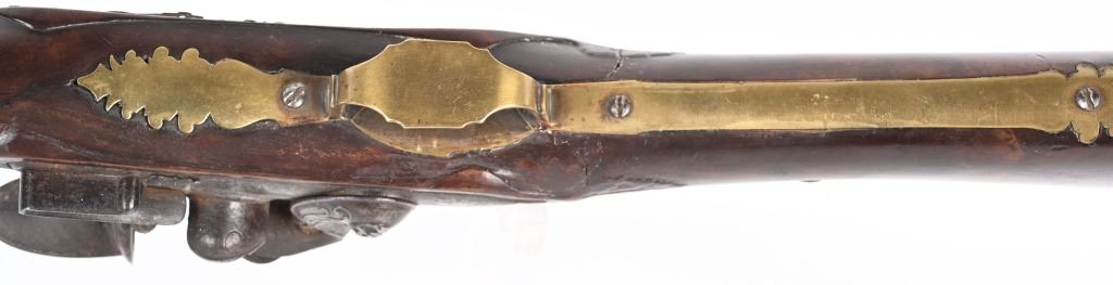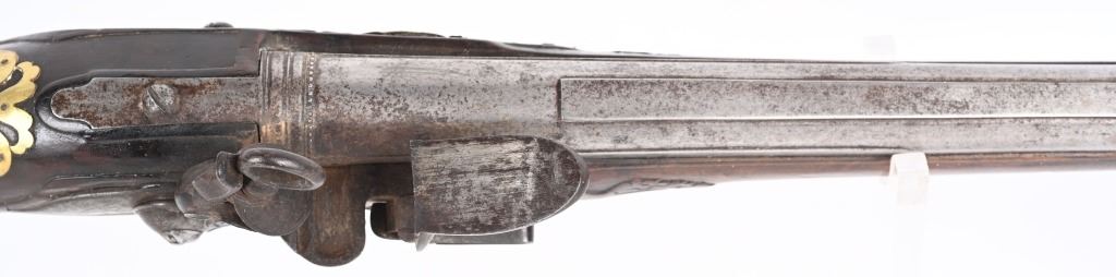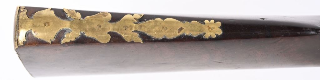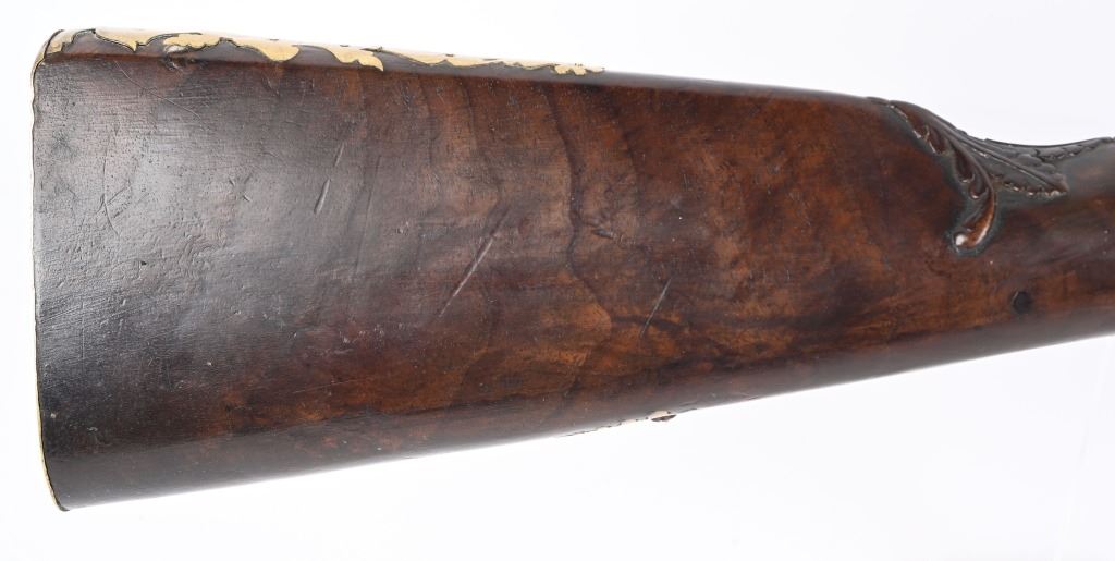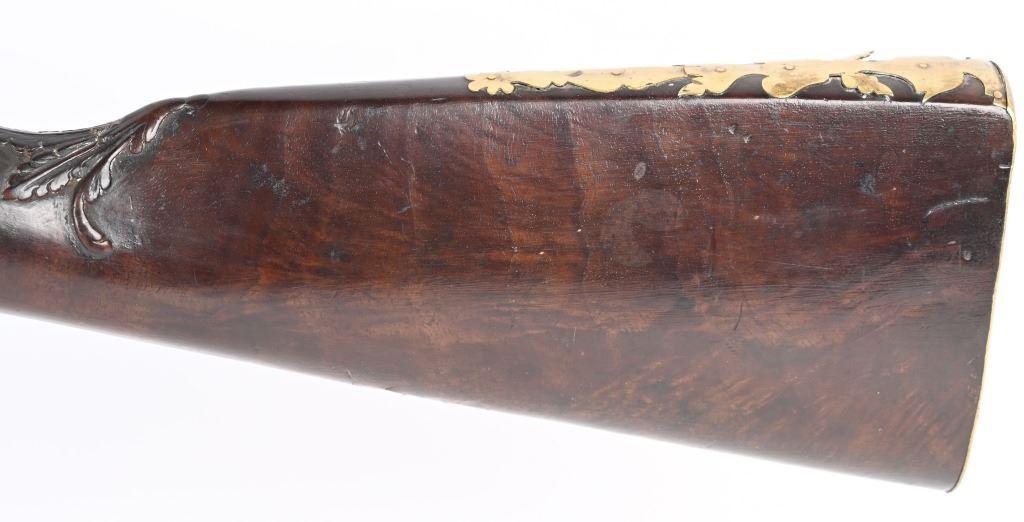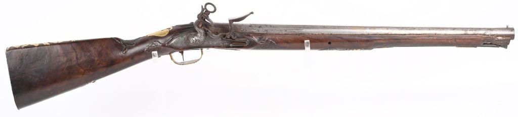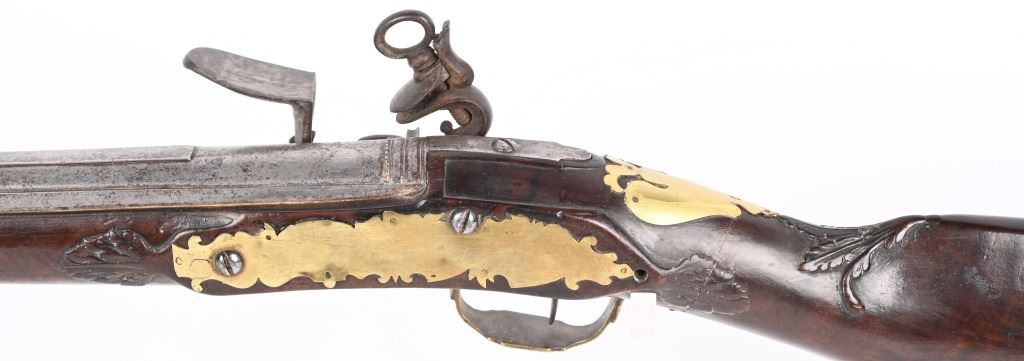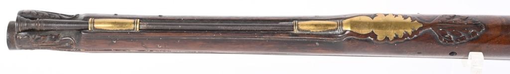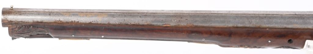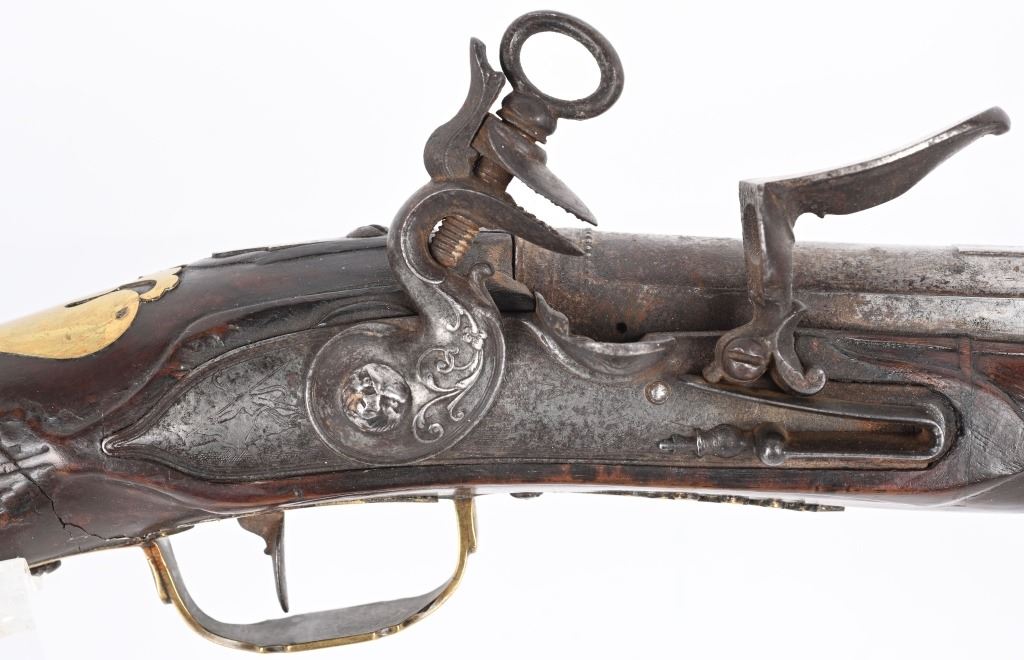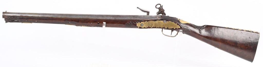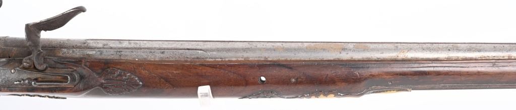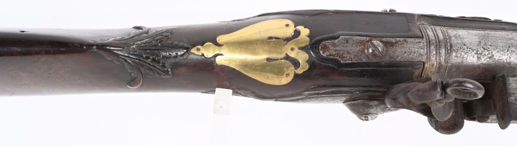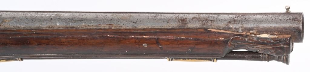 BARREL 22". CALIBER 70" LATE 17TH CENTURY (1675-1699O Michele Lorenzoni worked in Florence, often credited with inventing, or making, the first repeating flintlock pistol and a well known gunsmith of the time. This quality musketoon has a flint lock stamped Lorenzoni with his engraved hunting scenes. The hammer is carved and the screw head is a gargoyle. The full length walnut stock is hand carved with ferns and oak leaves. Brass furniture includes two pipes, trigger guard, butt plate, side plate and brass decorations. Iron furniture with flared barrel that has a solid top rib. CONDITION. Fine stock with repaired wrist crack, brass cleaned at one time, some minor shrinkage, Iron in the white has aged patina. Fine lock marking. Fully operational. Most of these Lorenzoni Florence guns rest in European museums and very few enter the American market. ANTIQUE