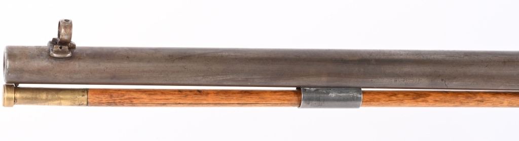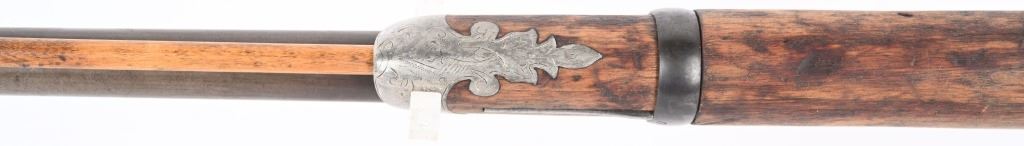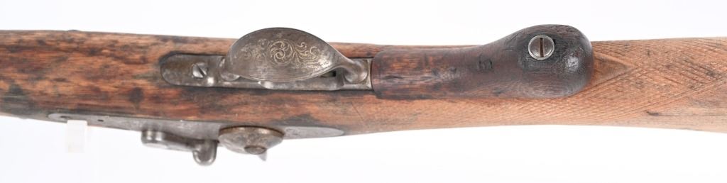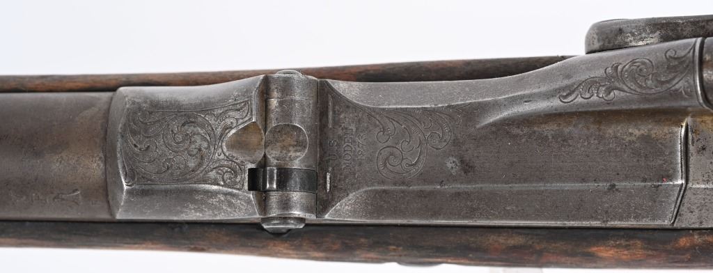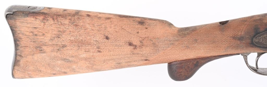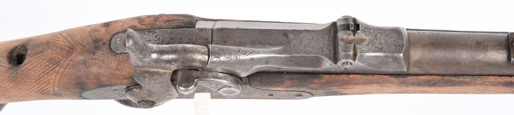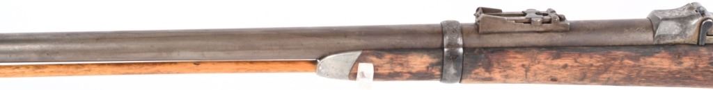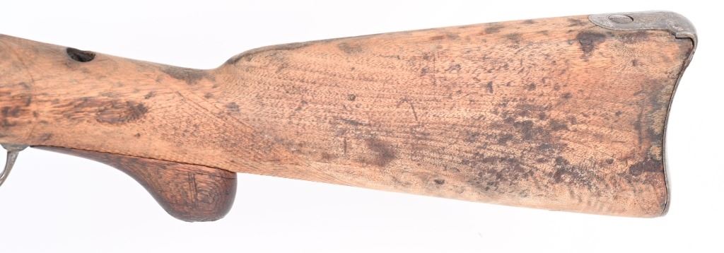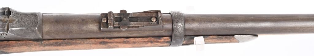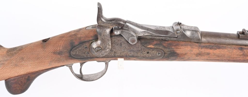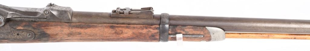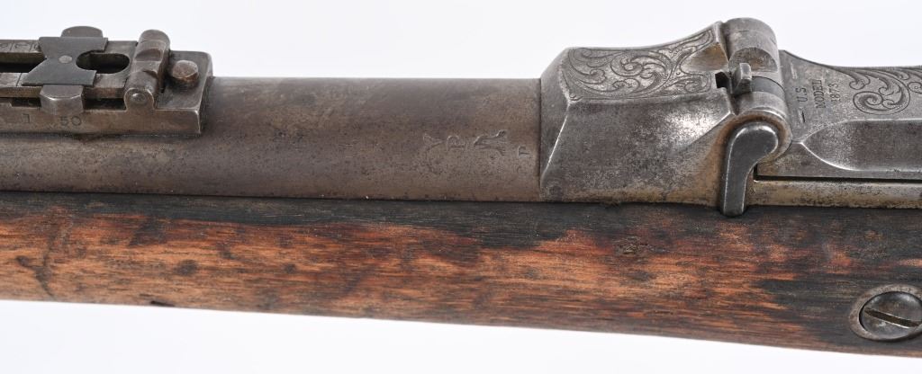 SERIAL NUMBER N/A BARREL 26" CALIBER 45-70 GOV'T MANUFACTURED 1875-1877. Produced by Springfield Arsenal on a special order basis for Military Officers. These Special order rifles where mostly shipped to the west due the abundance of wild game and lure of hunting. Straight grain American walnut stock with checkered wrist and forearm with engraved pewter forend tip. Engraved steel butt plate and detachable checkered wood pistol grip. The 26" barrel is mounted with the pattern 1873 rear sight with side graduation from 50-400 and staff graduation from 500-1200. Front sight is a folding combination Beech pattern sight. Barrel is "VP" proofed with Eagle. Breech block is marked "US MODEL 1873" and is scroll and vine engraved as is the receiver and tang. The trigger guard is engraved in the same vine & scroll with an assembly number 22 internally. The Butt Plate and barrel band are engraved in the same fashion. The rifle is equipped with a special single set trigger and the lock plate is marked "US MODEL 1873" with Eagle and is profusely engraved in the same previous mentioned patterns. Rifle was originally fitted with a wrist mounted tang sight that is now missing. This rifle is a recent discovery and came from the American West. It is heavily used and weathered. This is the only example we have ever observed that has been used extensively and obviously the the original owner / officer got his monies worth. A true piece of American westward expansion history. CONDITION, Fair as weathered and used. The wood is bleached from exposure to the elements and the checkering worn and forend checkering having been almost totally worn away. The metal has all turned a chocolate brown patina with all markings and engraving being visible and legible. The action including the special order set trigger operate properly. The bore is well worn with visible rifling. The tang sight as previously mentioned has long since been lost. The wiping rod is intact with most all knurling being worn away. The script "P" inspection to the rear of the wrist is still legible. The wiping rod ferule is a replacement. The stories this western discovered rifle could tell would be amazing. ANTIQUE