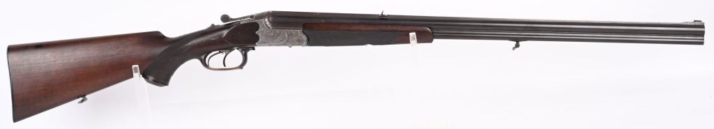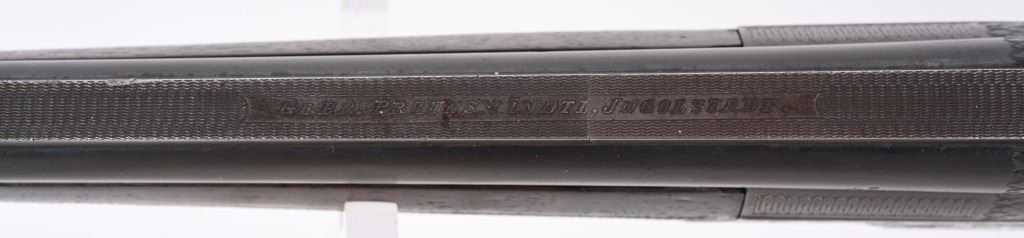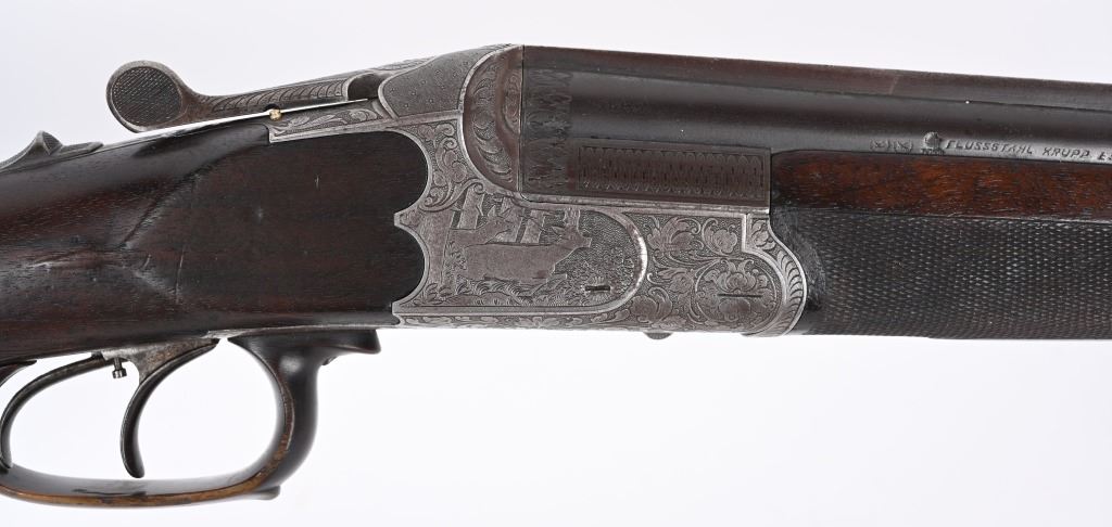 SERIAL NUMBER: 2506. BARRELS: 27-1/2". CALIBER: 16 GAUGE/9.3 CAL. MANUFACTURED: 1930'S. Made pre Nazi era, with commercial proofs on the barrel and frame area. Barrel rib is marked "GEBR. PRAUNSMANDTL, JNGOLSTADT". Right side of the shotgun chamber area is marked "FLUSSSTAHL KRUPP ESSLN". Solid, matted rib with blade front sight and fixed express u-notch rear. Original blued finish, with fine game scene engraving on the frame. Finely oiled wood stock, with sharp checkering on the wrist and forearm. Adjustable double triggers. Tang Safety. Horn trigger guard and butt plate. No bullet trap on the butt. Original small, European style sling swivels. Includes a later production Browning brown leatherette case, with keys. Bore looks to be choked at full. LOP is: 14". CONDITION: Metal is good overall, with the barrel areas forming an all natural patina. Frame shows no signs of cleaning or polish. Wood has very lightly sanded and oiled at some point, and has a few minor handling marks and scratches. Solid fore arm, with no visible cracks. Shotgun bore has a few minor pits near the muzzle. Rifle bidding has pits, with good overall rifling retained. Mechanically good. Case has minor handling marks and wear. Some oxidation on the brass hardware. C&R