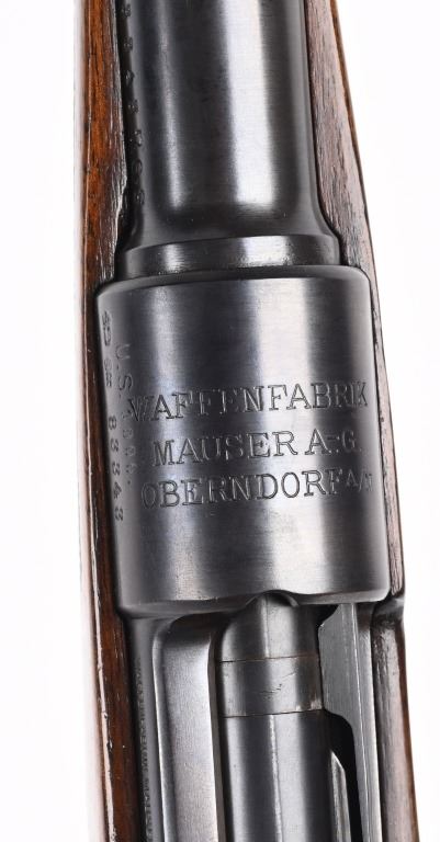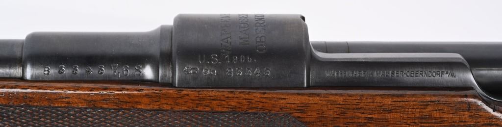 SERIAL NUMBER 83343 BARREL 24" CALIBER .30-06 SPRINGFIELD MANUFACTURED CIRCA 1920'S. Built commercially in Germany immediately post WW1 for export to the United States market. Barrel marked with "U" crown proofs, serial number and 7.6S. Receiver ring marked with " WAFFENFABRIK MAUSER A-G OBERNDORF A/N" Additionally marked U.S. 1906. One piece varnished pistol grip checkered stock with period red rubber recoil pad. Ramped blade front sight with Lyman receiver sight at rear, Matching serial numbers on Barrel, receiver and bolt assembly. Single trigger with dropping magazine floor plate. CONDITION, Very good as refinished with fine bright bore. Wood stocks are very good with a few impressions. Action operates properly. All markings are crisp and legible. C&R