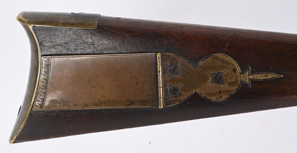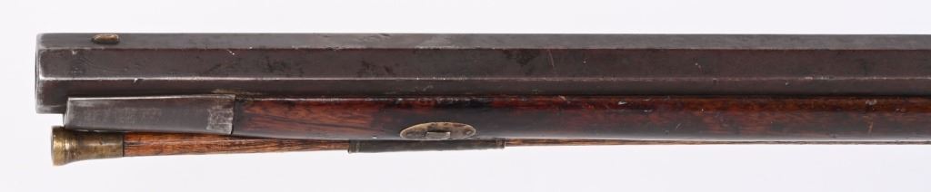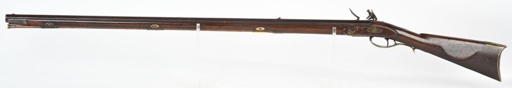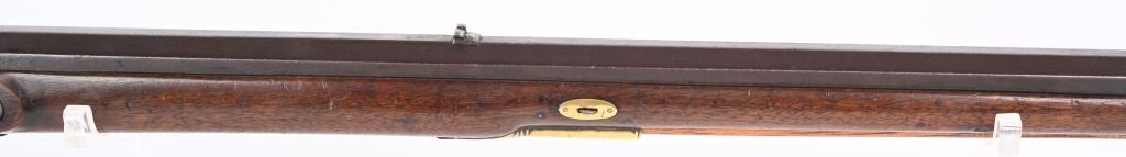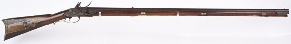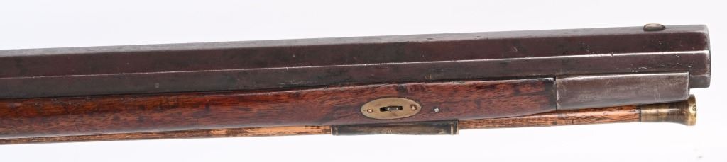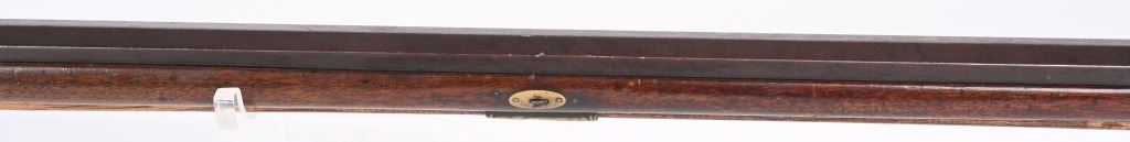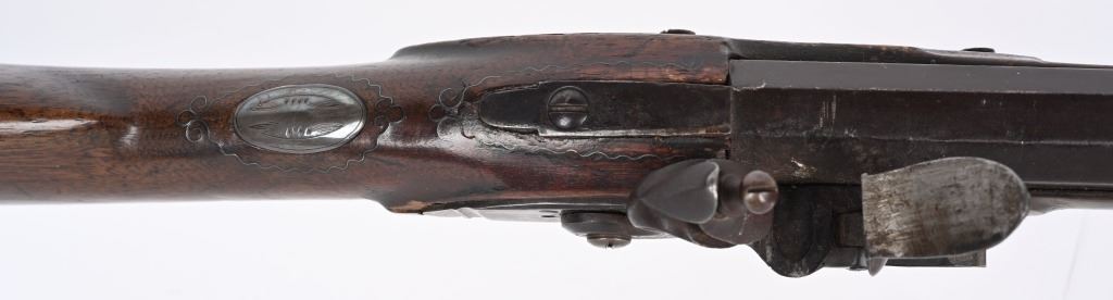 Elegant full stock New England style smoothbore rifle. 58 caliber with full octagon 39 1/2" barrel. Barrel retained with 3 wedges. Gun remains in original flint configuration with fine wire inlays around tang silver plaque on top of wrist. Modestly decorated patch box with concealed release at toe. A classic 1780-1810 New England flint in fine original configuration. The gun remains uncleaned and not tampered with. ANTIQUE