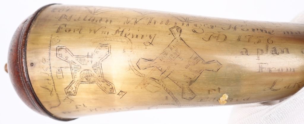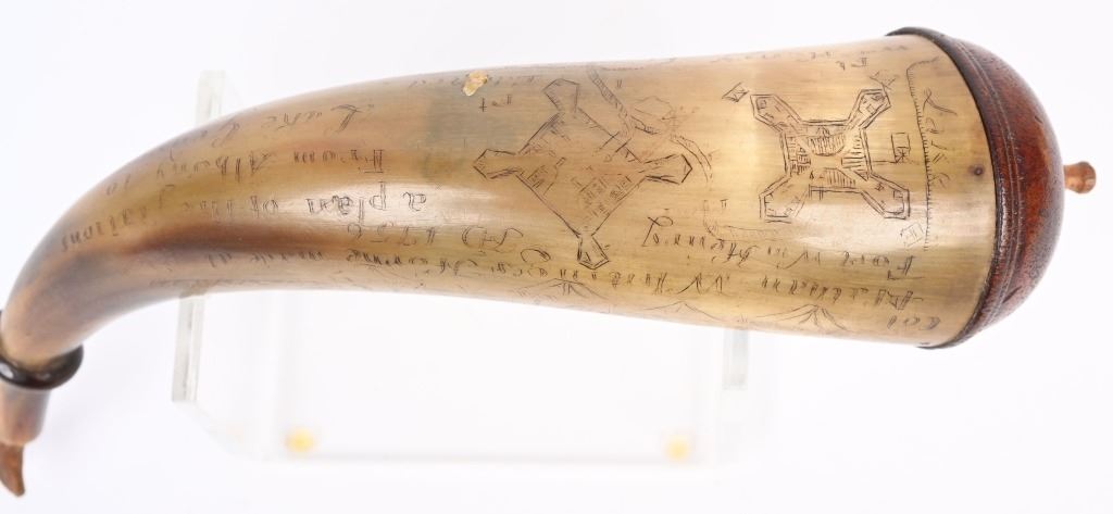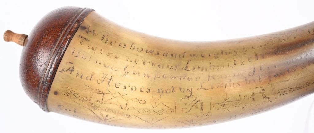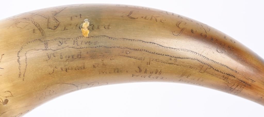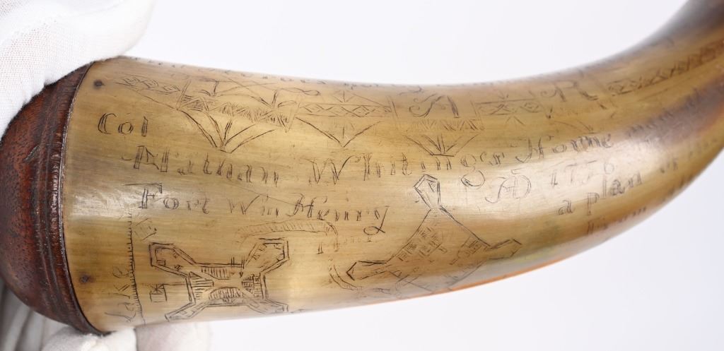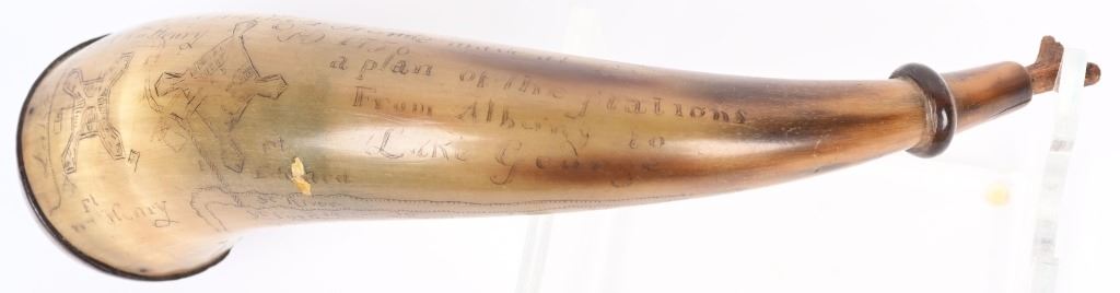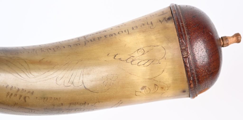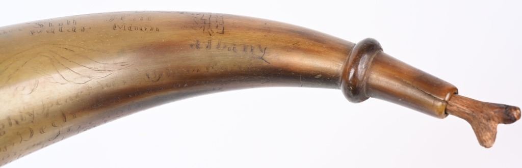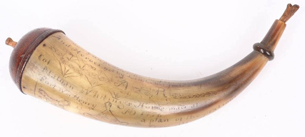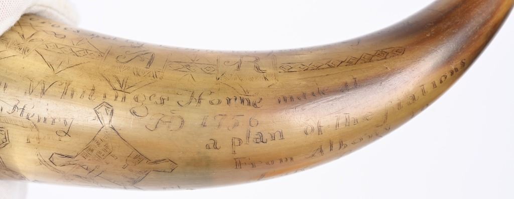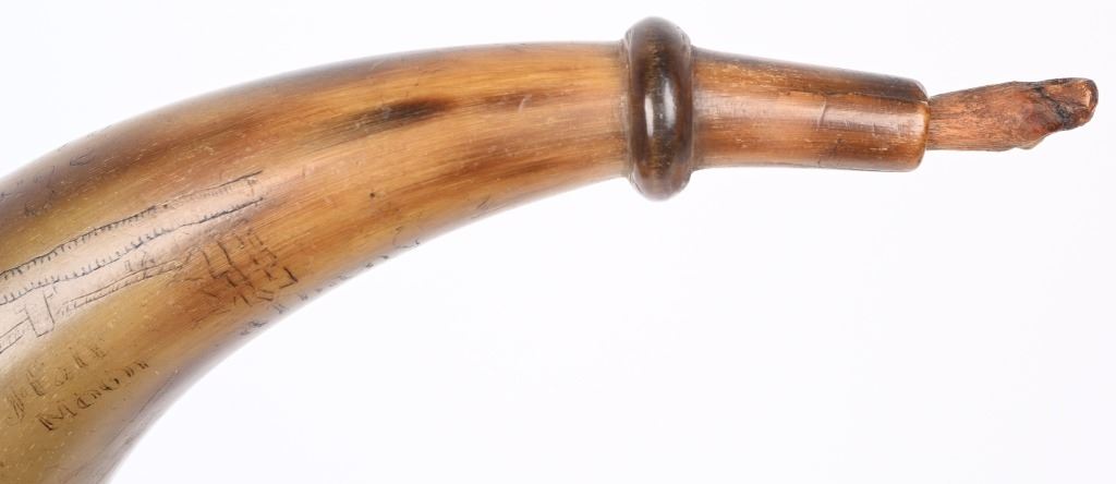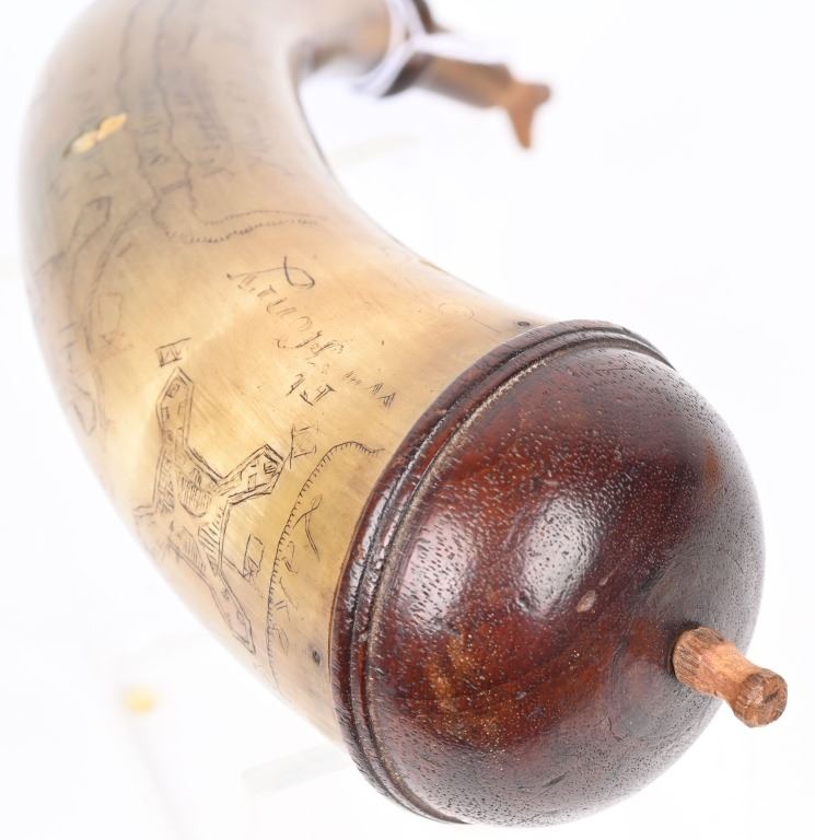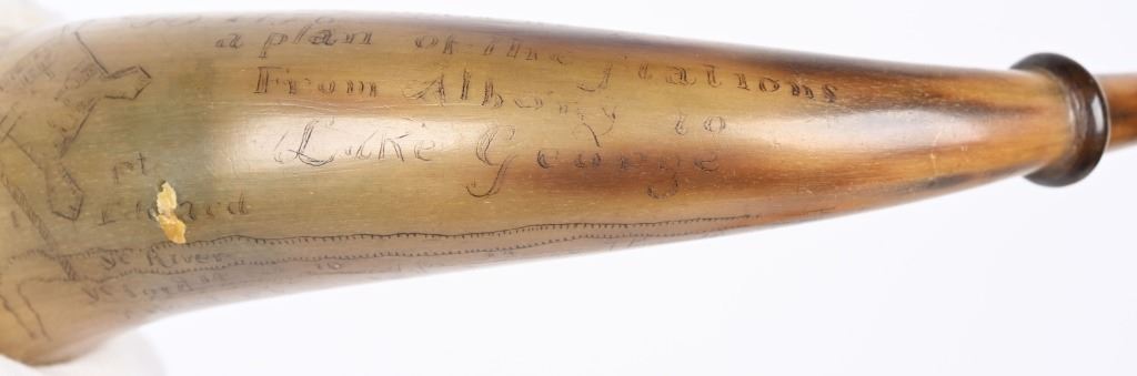 Etching consists of following; A. Col. Nathan Whiting home made AD 1756. B. Map of river from Albany to Fort Wm Henry (etched name) with two drawings of fort on Lake George. Under the river (Hudson) is etched "Still Waters & Full Moon" C. Etched "A Plan of Nations from Albany to Lake George" There are numerous decorative etchings along with a poem that is partially visible to include : Red bows and weighty, Twice her would ... Limbs decline... But now gunpowder from .. would.. and heroes not by limb but souls The French & Indian wars were fought from 1754-1763 by the British with American militia fighting the French who were supported by Algonquin, Lenape, Wyandotte, Ojibwa, Ottawa, Shawnee, and the Mi'kmaq tribes. Nathan Whiting (May 4, 1724 - April 9, 1771) was a soldier and merchant in the French and Indian War. Whiting was born on May 4, 1724 in Windham, Connecticut as the son of Samuel Whiting and Elizabeth Adams. He graduated from Yale University in 1743 and was commissioned as an Ensign and participated in King George's War during the Siege of Louisbourg in 1745. After his service in the war, he became a merchant in New Haven, Connecticut. He was appointed as Lieutenant Colonel of the 2nd Connecticut Militia Regiment and participated in the Battle of Lake George on September 8, 1755. Whiting's regiment and the Massachusetts regiment were marching towards Lake George and Fort Edward when their column was ambushed by an army of French and Indian allies. Whiting led the survivors back to Sir William Johnson's camp at Lake George. There, the Colonial army held off the French attacks until men from the New Hampshire Provincial Regiment attacked the rear of the French army. In 1756, Whiting was promoted to full Colonel in the Connecticut Militia, and in 1757, his regiment guarded the frontier in New Hampshire on the Connecticut River. After the war ended in 1763, he served in the Connecticut General Assembly until his death on April 9, 1771. wiki Horn is in excellent condition with one small chip and a few areas of fading with small square nails and wood topper and spout measuring about 10" ANTIQUE