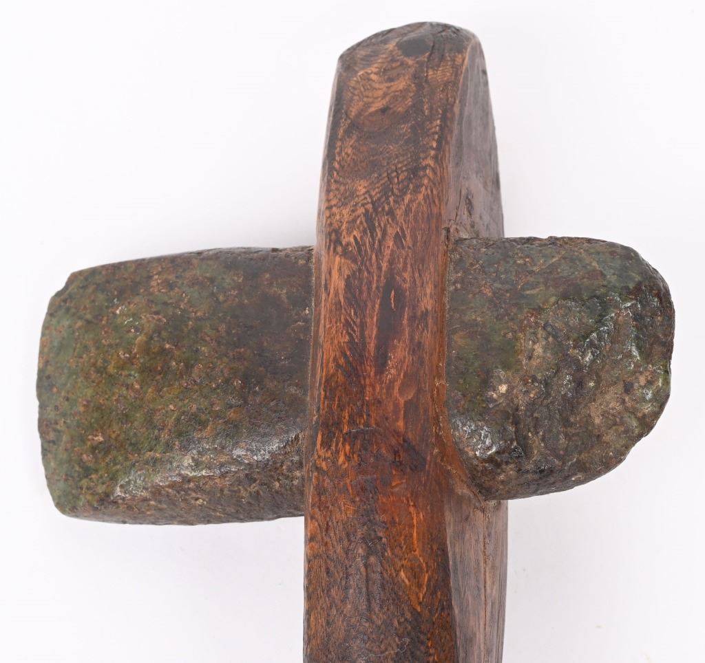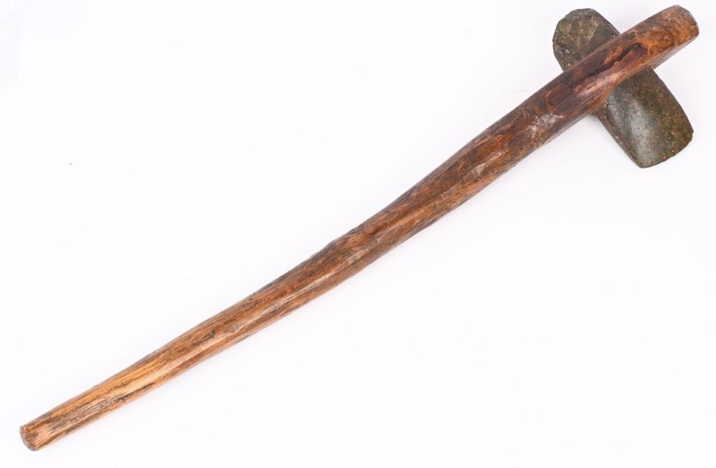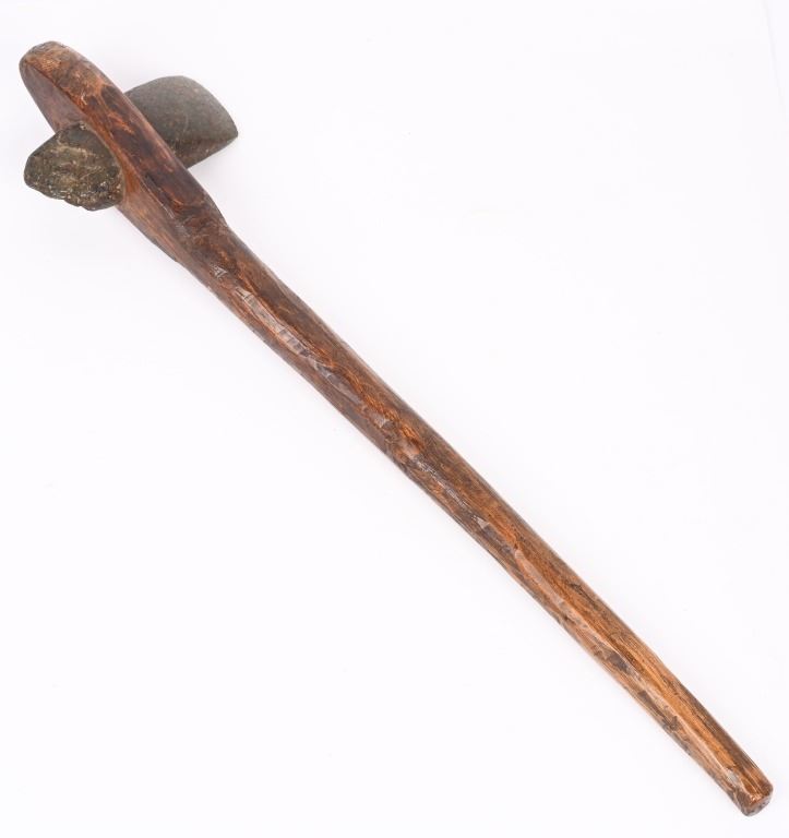 It is said that when a Sioux boy is born, a honed stone is set in the branches of a tree so that by the time the boy becomes a man, the tree has grown around the stone where is presented to the young man, This stone tomahawk has the original tree branch staff with polished stone inset. Staff measures 23". Stone measures 5.5" in length. ANTIQUE