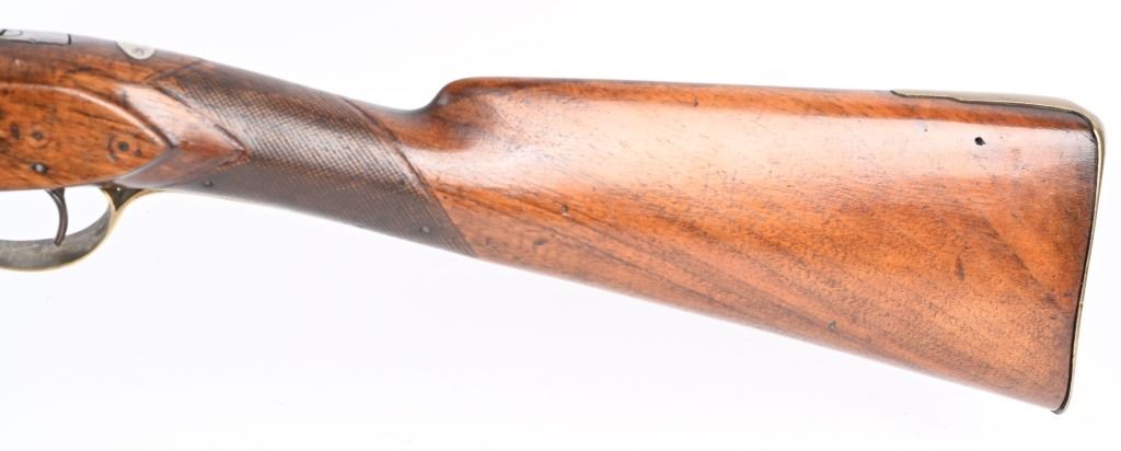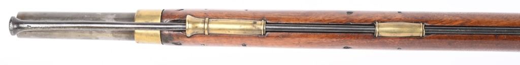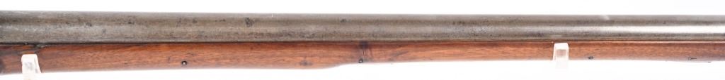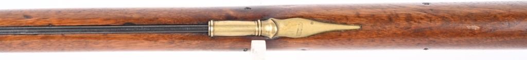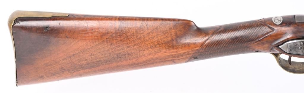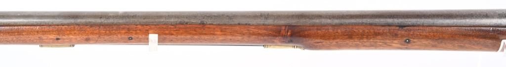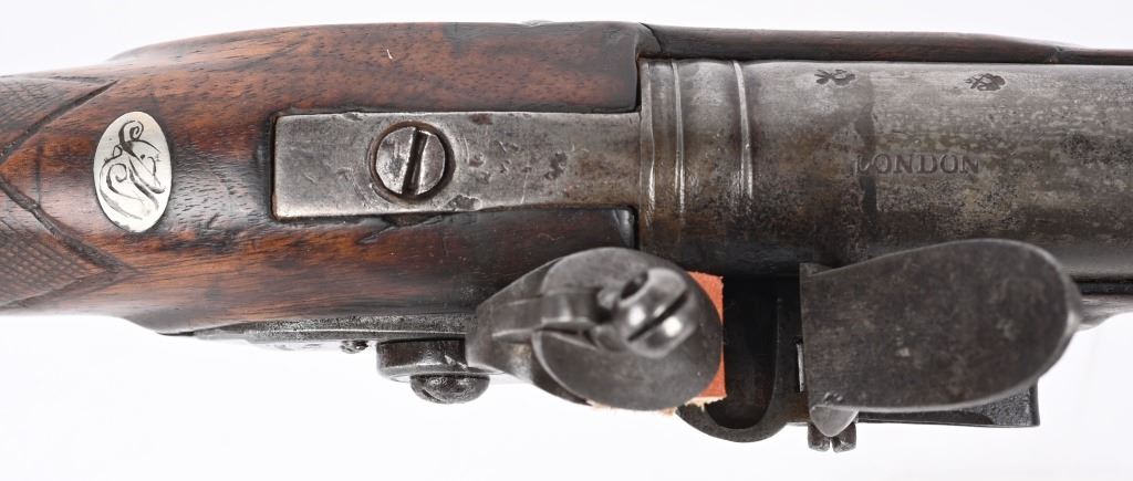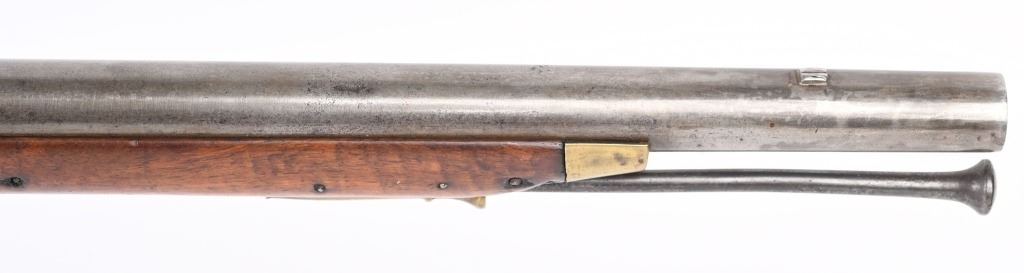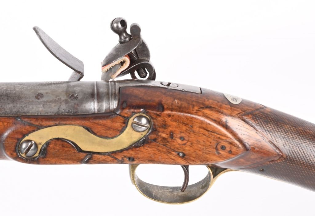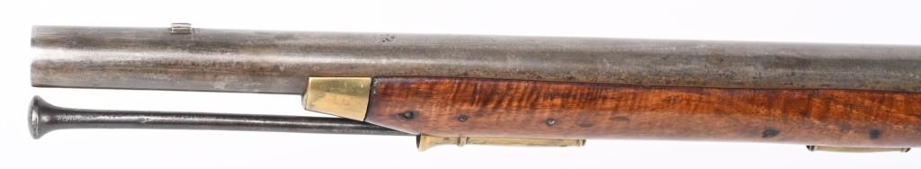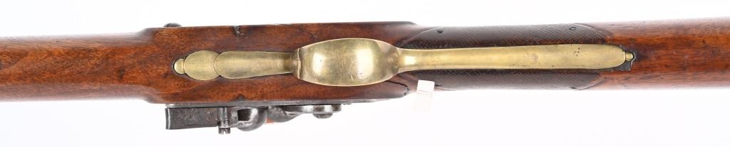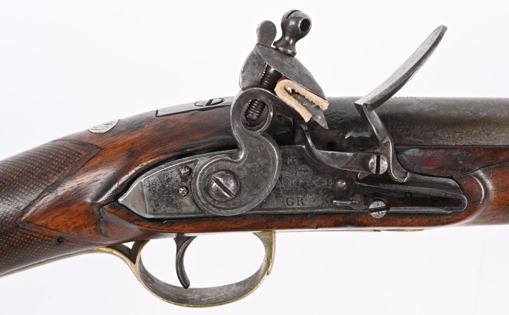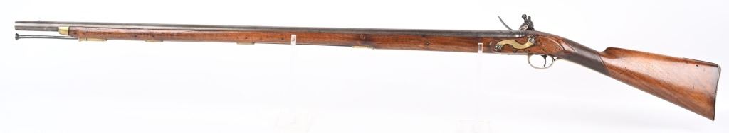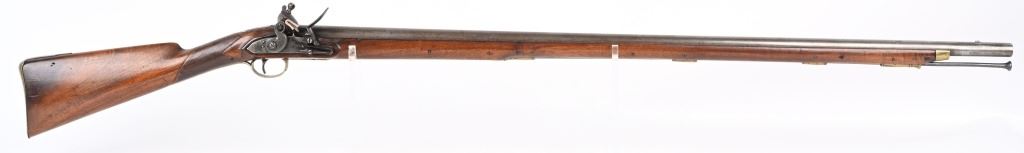 BARREL 40". CALIBER .69. George Rex III , King of Great Britain and of Ireland from 25 October 1760 until the union of the two kingdoms on 1 January 1801, after which he was King of the United Kingdom of Great Britain and Ireland until his death in 1820. This type of rifle was usually only carried by officers of the British militia due to their smaller stature and lighter weight. This example has the London stamped barrel with two proof marks on left breech. Lock Crown GR (George Rex) along with Tower marking which indicates a militia rifle. Round barrel, full length walnut stock, checkered wrist, brass furniture, four brass tubes, metal rod, initials on silver id plate top of wrist, Brass side plate not fitted perfect. Condition. Couple of early pins in wrist. Few small contained cracks near lock, Steel is a gray patina. Lock and barrel have gray homogenous patina. Checkering is worn but visible. Brass is toned. Working order. Most likely a post Rev war piece used in the War of 1812. Really clean example. ANTIQUE