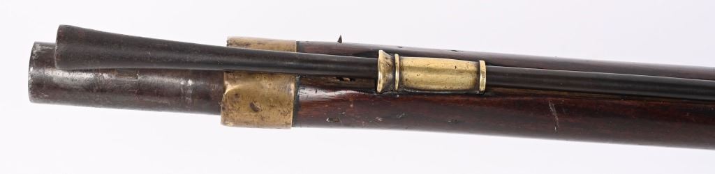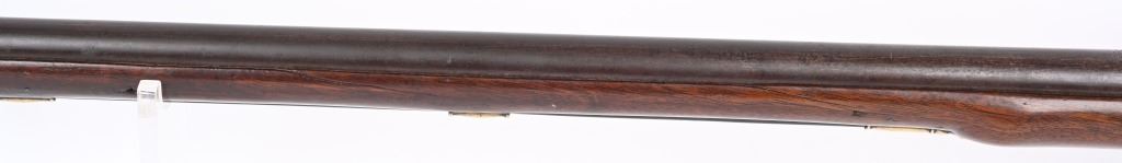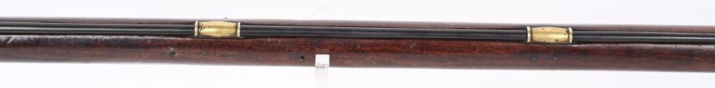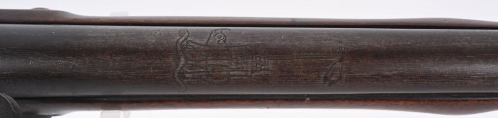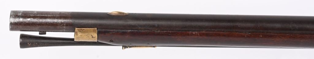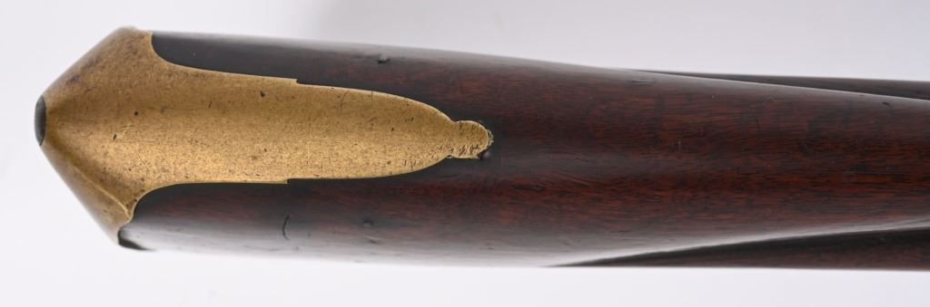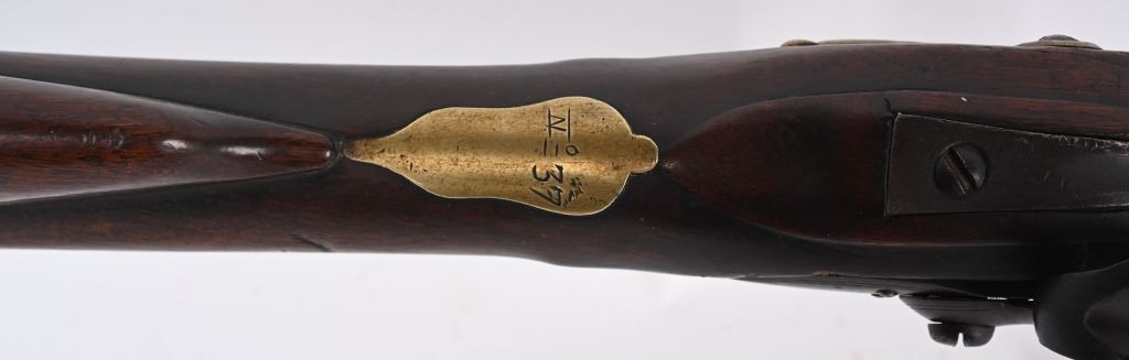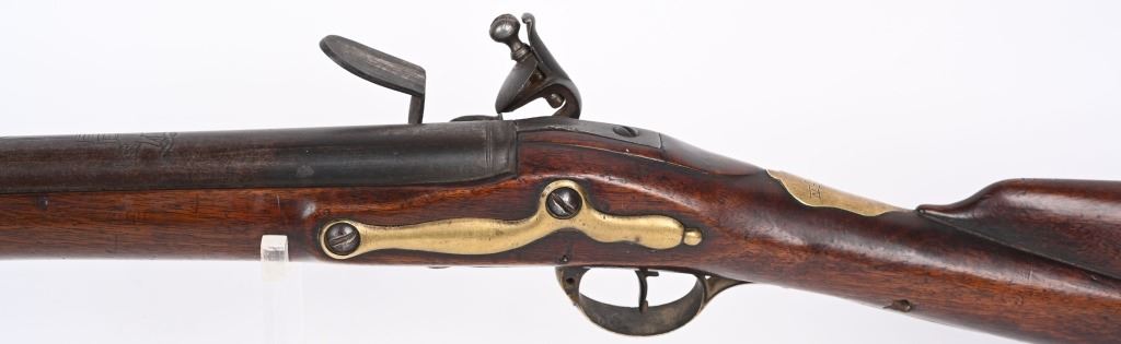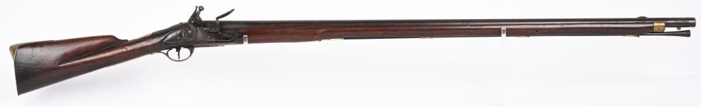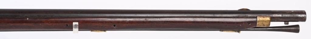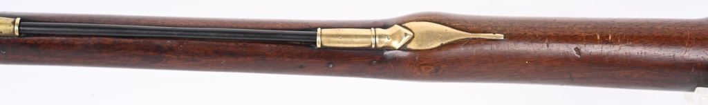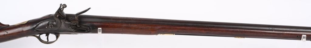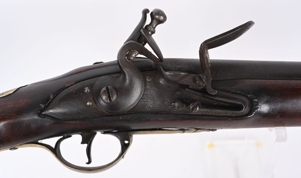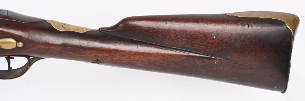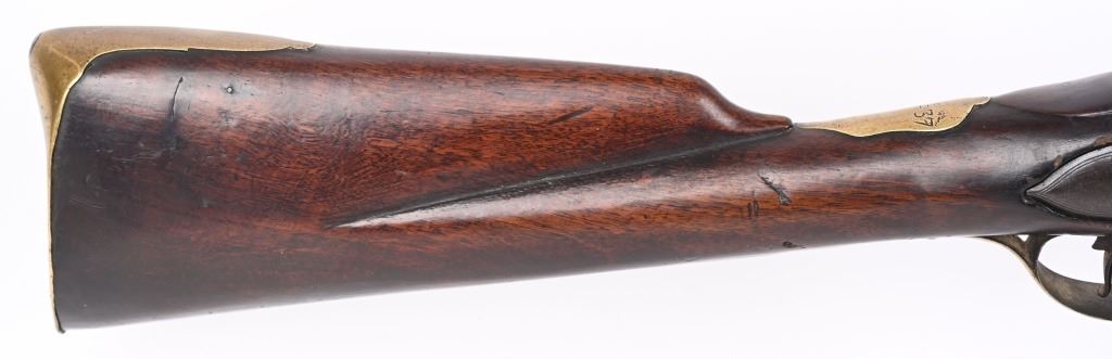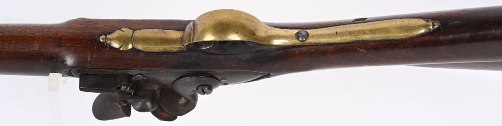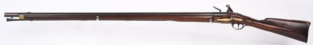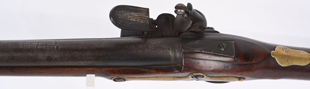BARREL 42". CALIBER .75. First used in 1722. This 1st model features brass furniture to include four pipes, fore-end tip, trigger guard, side plate , butt plate and thumb plate stamped No .37. Top of barrel has an elephant with a howdah on it's back and a flag. Full length walnut stock with no barrel bands and simple front sight. Lock has a crown with JR stamp. Condition. Really clean gun with butter smooth patina. Barrel and lock legends are crisp. Wood is excellent with just one minor hairline on left side and a few minor dings. Action works. Beautiful rifle. ANTIQUE