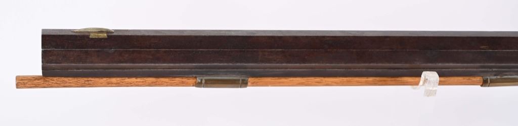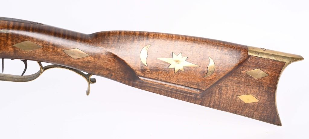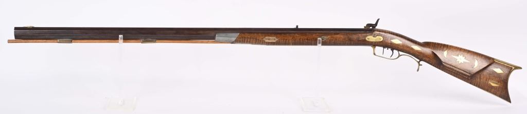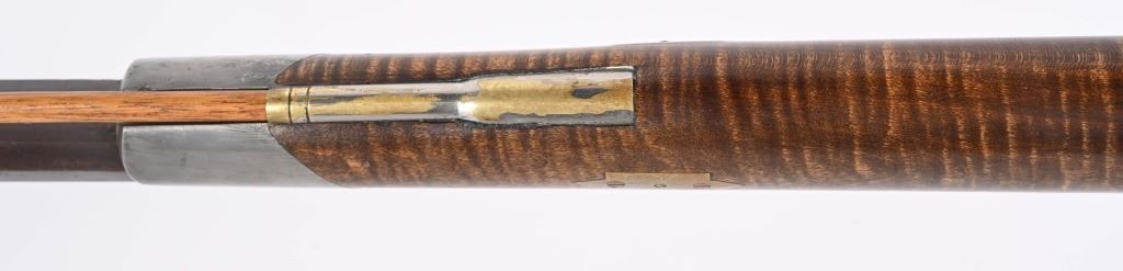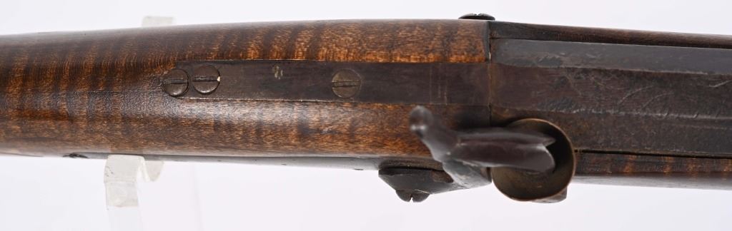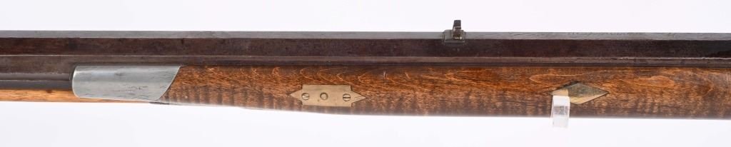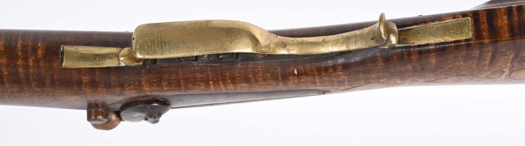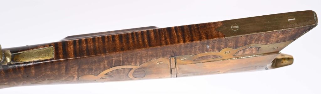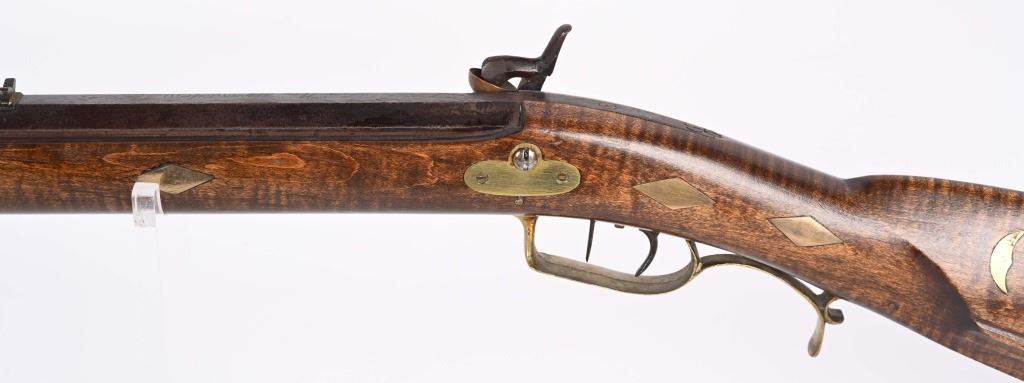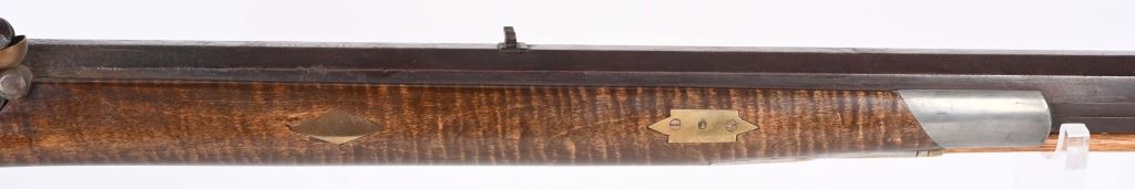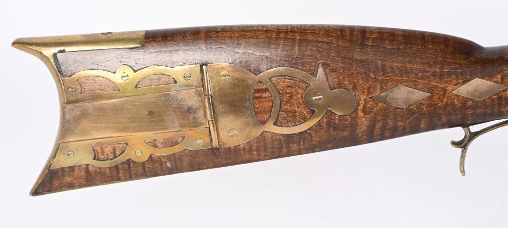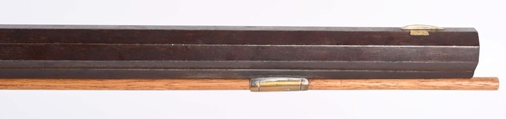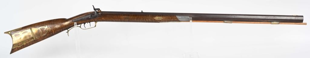 There is an AW from Stuart Iowa and a Andrew W. from San Francisco. Both rifle makers. Features a 36" octagon barrel in 36 caliber. Has percussion unmarked back action lock, double set triggers, brass furniture including 4-piece patch boxpewter fore-end tip, knife blade front sight, striped maple half stock, single leaf rlear sight Condition. Brass and stock are excelletn but have been cleaned. Barrel is brown patina. newer wood rod, triggers not working. Bore is excellent. ANTIQUE