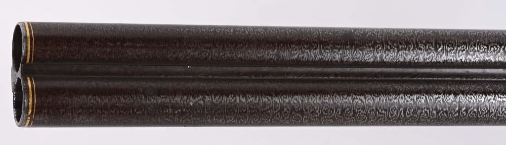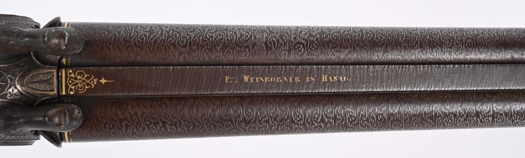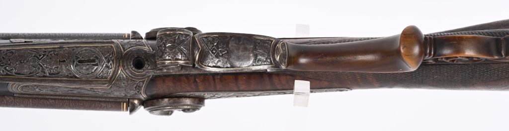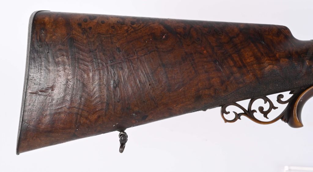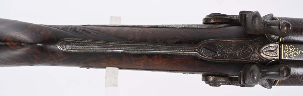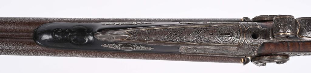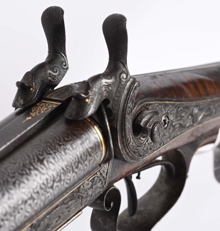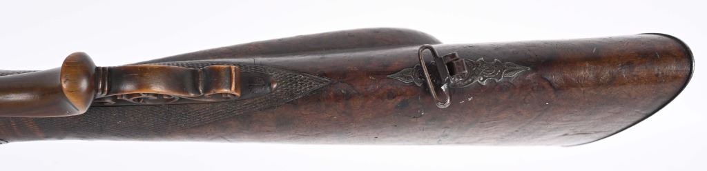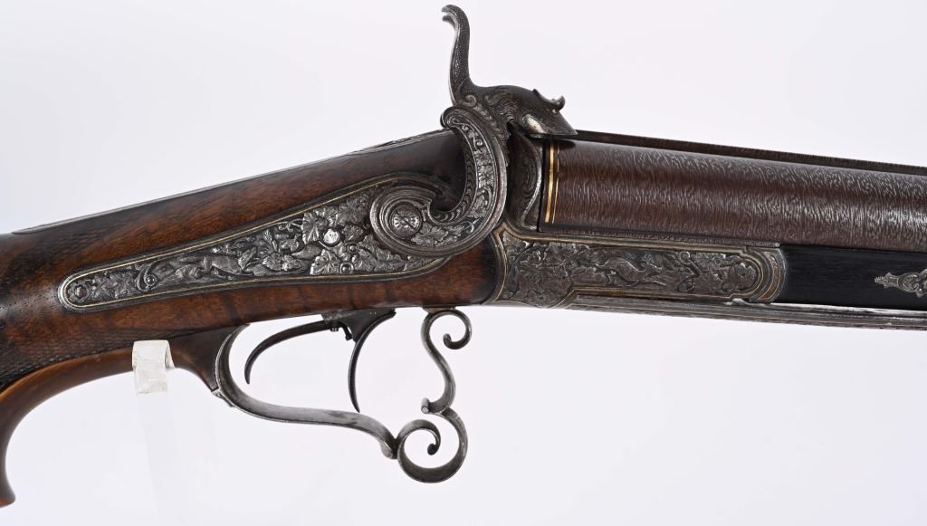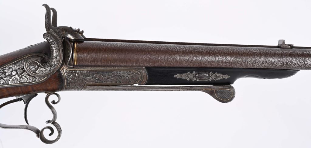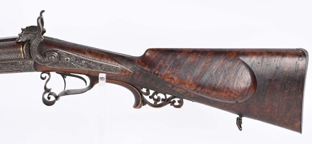 BARRELS 28.5". RIFLED .60 CALIBER WITH 16 GA SMOOTH BORE. Beautiful damascus pattern browned barrel with maker name in gold on raised rib with two leaf folding rear sight, bead front sight with gold bands at muzzle, Deeply engraved German or Swiss master artwork on hammers with fish heads, back lock actions, frame, upper tang, barrel release underlever, trigger guard, all with gold border and various game. Even the sling swivle plate is engraved. Features double set triggers, sling swivels, checkered walnut butt stock, ebony style splint fore-arm and a very ornated horn trigger guard back decoration. Engraved butt plate with no trap door, Condition. 98% pattern on barrels, Balance metal is antique silver . Incredible grain with some finish loss and some thinning on checkering. Actions works correctly. Both bores are clean and lock up is tight. There is a modern replaced lock screw that should be replaced with period screw. This was a huge money gun , a royalty qualithy firearm worthy of a prince. ANTIQUE