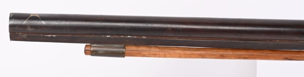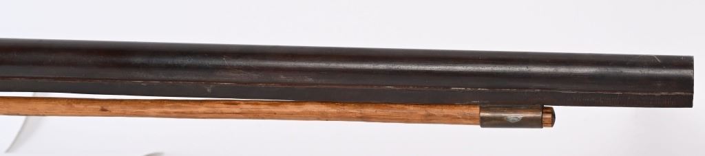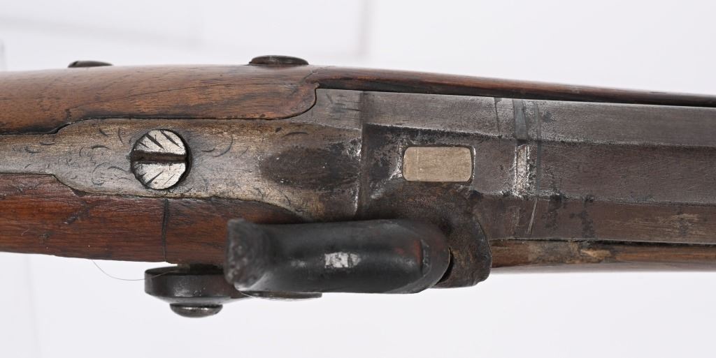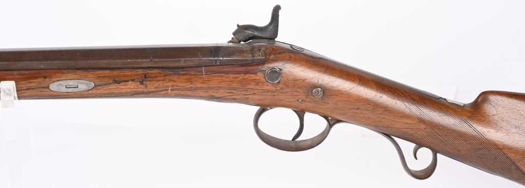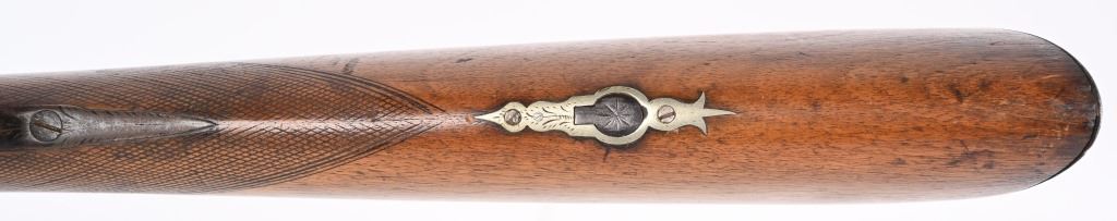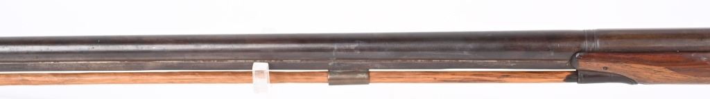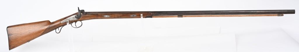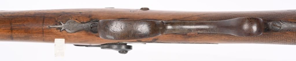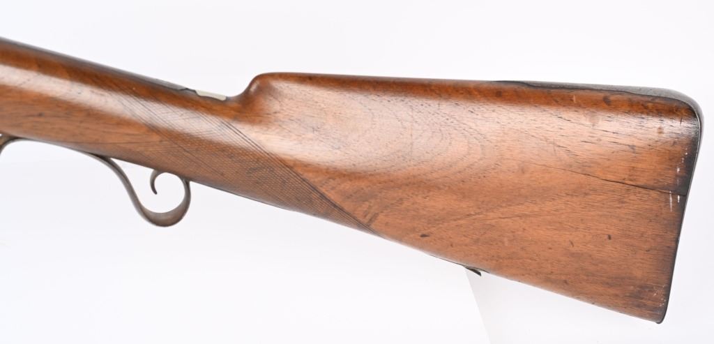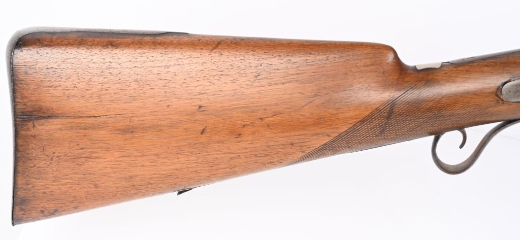 BARREL 42". BORE 28. MADE IN SPAIN MID-19TH CENTURY . Maker stamped on back action lock, octagon to round barrel, walnut half stock, checkered wrist, smooth steel butt plate, single trigger. Condition. Stock has several repaired cracks on fore-end, barrel is browned, checkering is wearing thin, Working order. ANTIQUE
