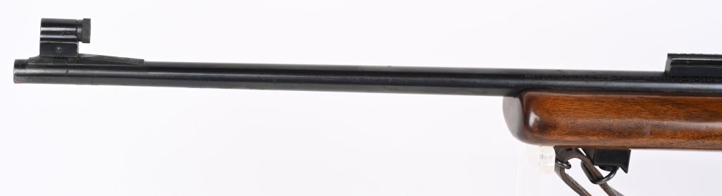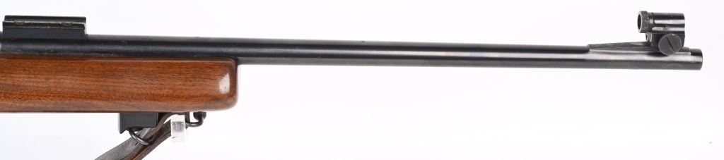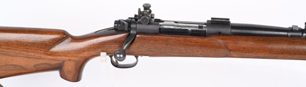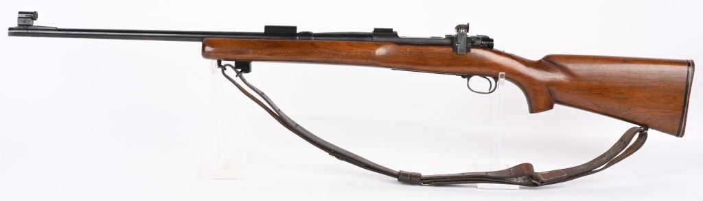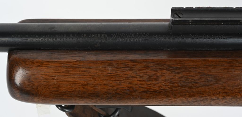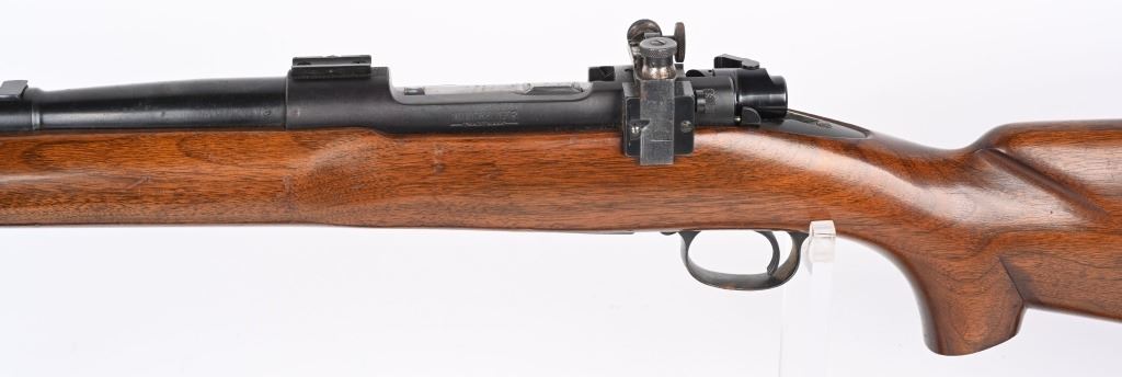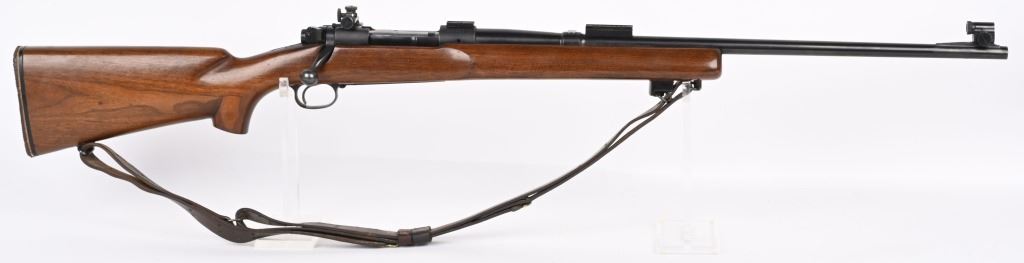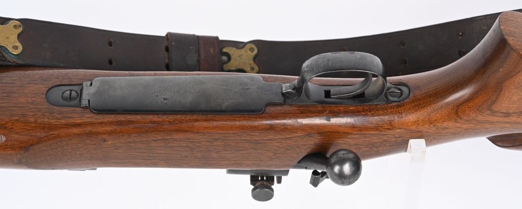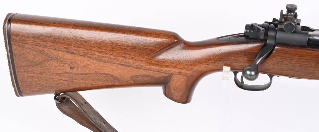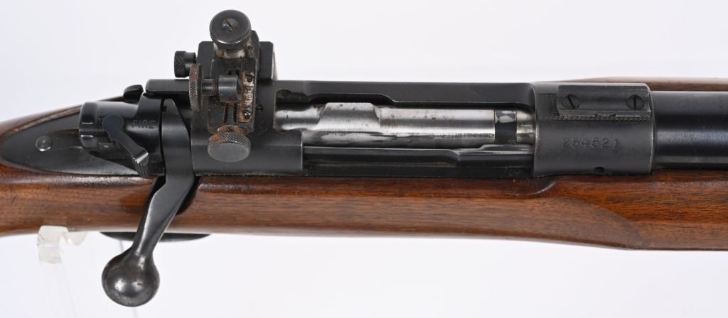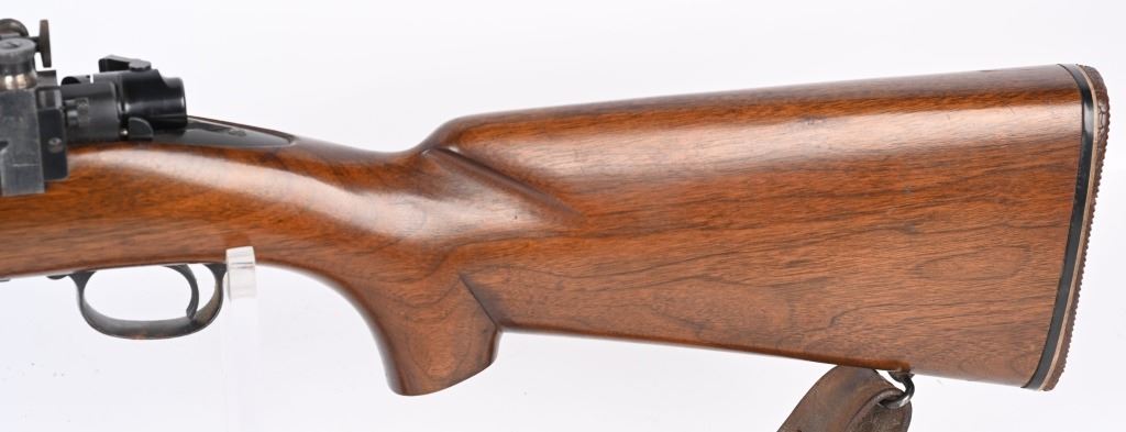 SERIAL NUMBER: 254521. BARREL: 24". CALIBER: .30-06. MANUFACTURED: 1953. Standard weight barrel with added globe front target aperture sight and Lyman 48 peep rear. Standard markings and Winchester proofs. Added scope blocks on the barrel and receiver. Original blued finish. Oiled wood target stock with pistol grip. Thin rubber butt pad. Includes attached leather sling. CONDITION: Metal is good overall, with some cleaned surface rust on the barrel and sights. Wood has minor handling marks, scrapes and scratches. Bore is clean overall, with strong rifling. Mechanically fine. C&R