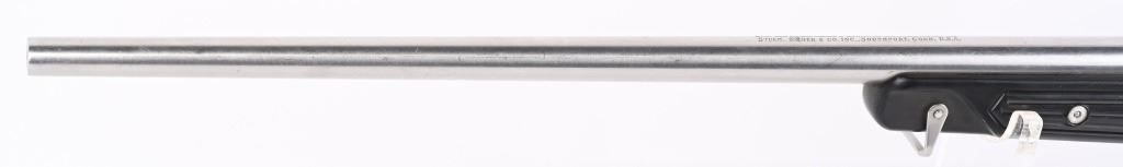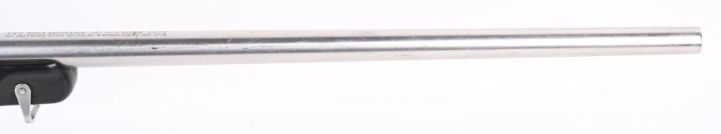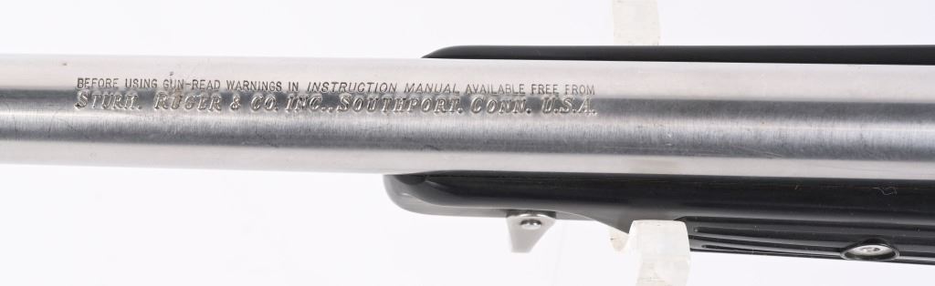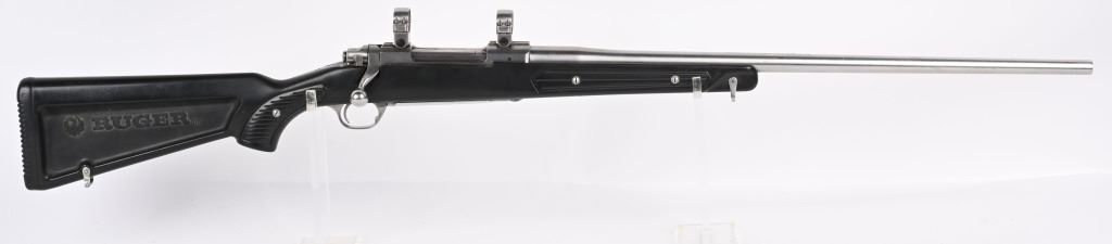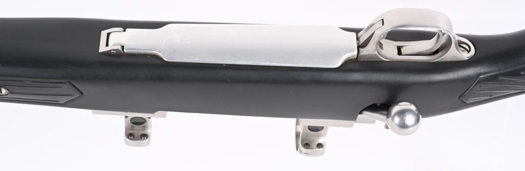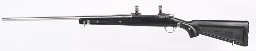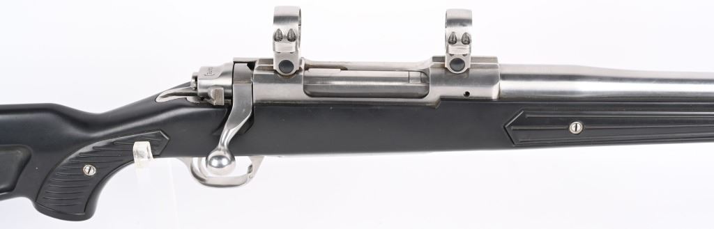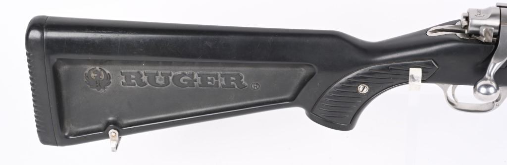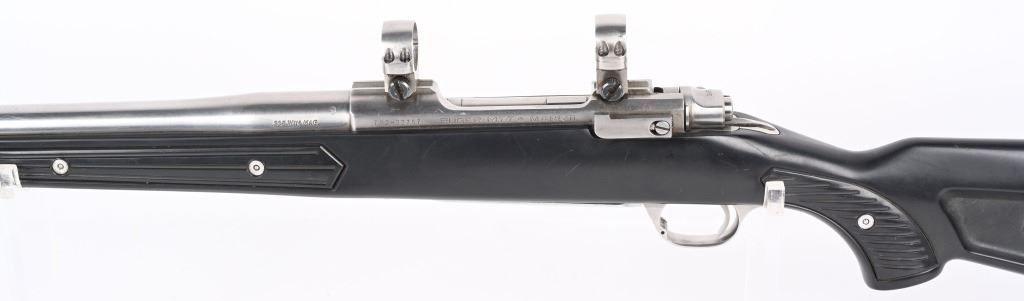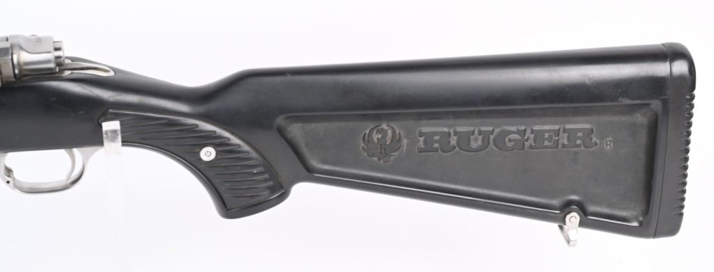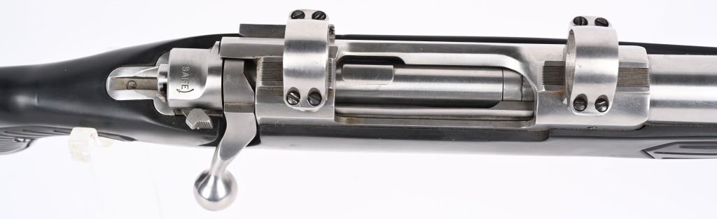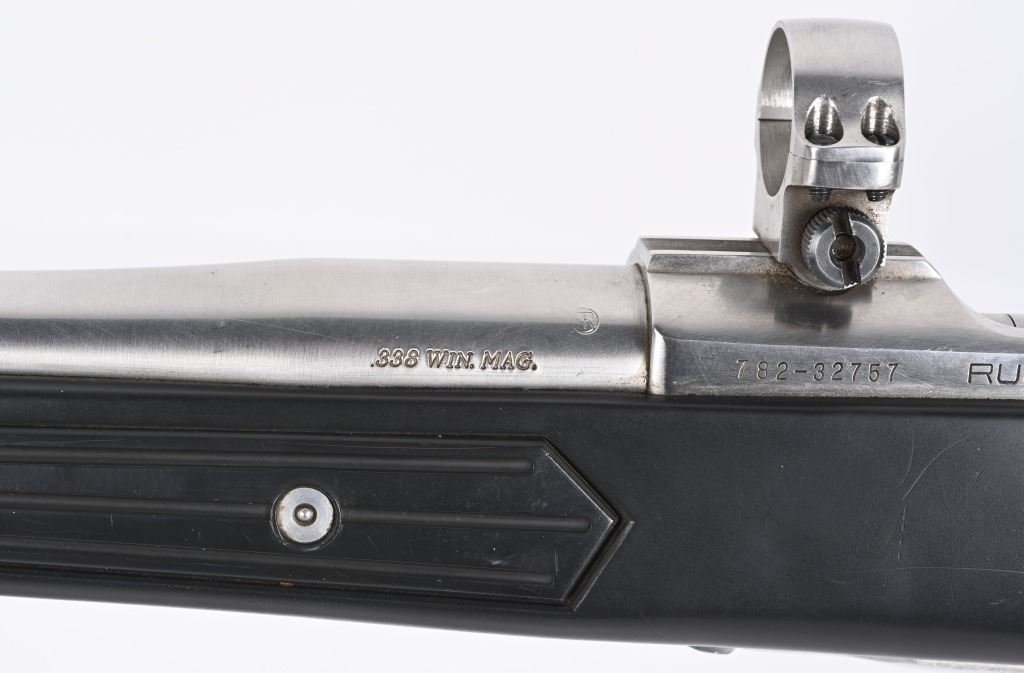 SERIAL NUMBER: 782-32757. BARREL: 24". CALIBER: .338 WIN MAG. MANUFACTURED: 1994. Standard optics ready gun with Ruger factory stainless rings attached to the receiver. Polished stainless finish with classic "paddle" synthetic stock. LOP is: 13-3/4". CONDITION: Metal is very good overall, with wear and light scratches. Stock has minor scrapes and scratches as well. Bore is clean overall with crisp rifling. Fine mechanics. MODERN