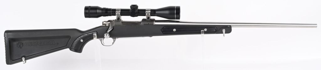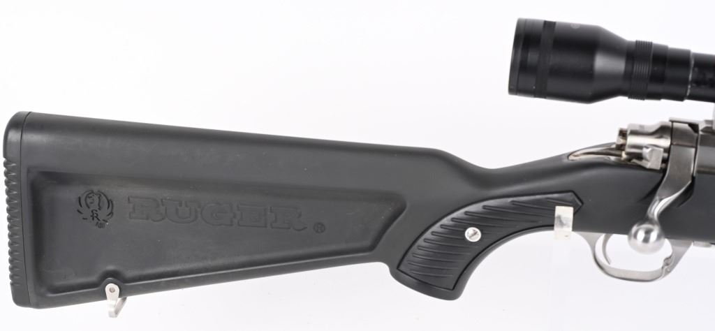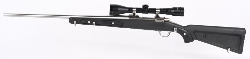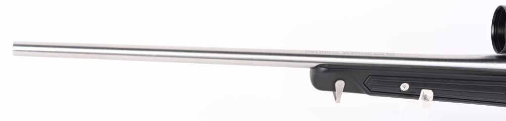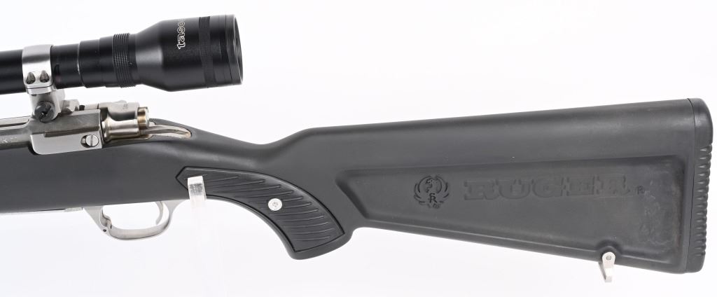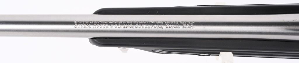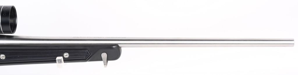 SERIAL NUMBER: 780-55415. BARREL: 22". CALIBER: .223 REM. MANUFACTURED: 1991. Standard optics ready gun with Ruger factory stainless rings attached to the receiver. Scope in the rings is a Tasco Pronghorn 4X40. Polished stainless steel finish and classic "paddle" synthetic stock. LOP is: 13-1/2". CONDITION: Metal and stock are excellent overall, with little signs of use or wear. Bore is clean overall, with strong rifling. Mechanically fine. Scope has exterior wear. Optic is clear.