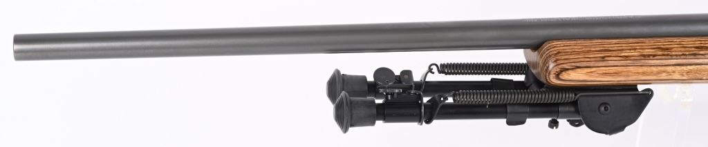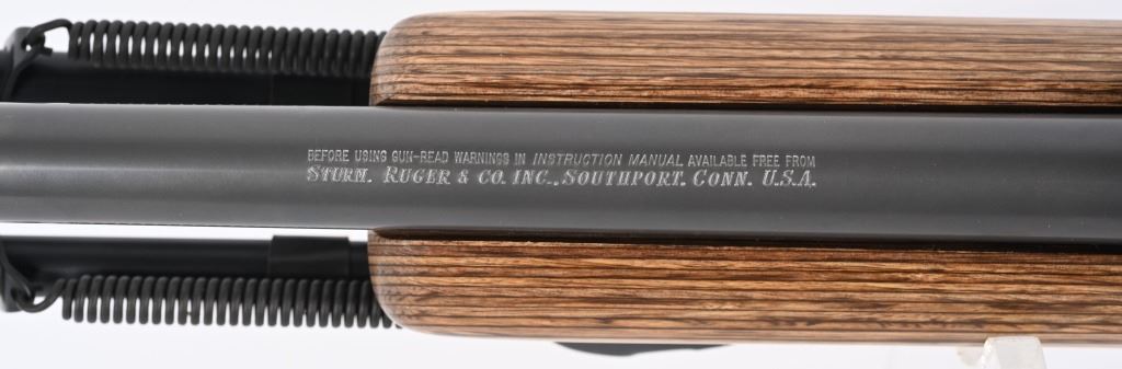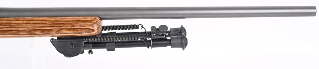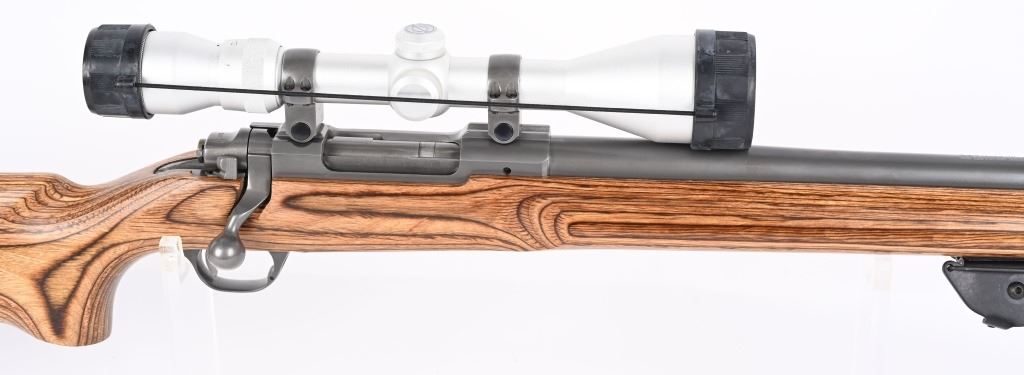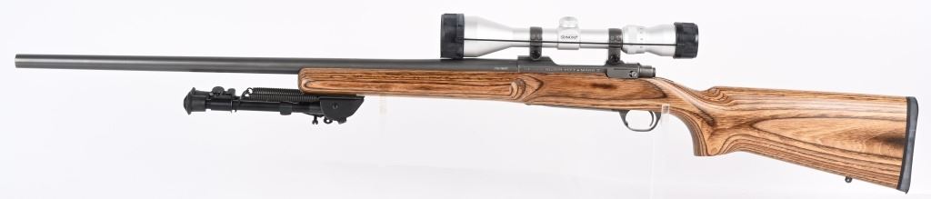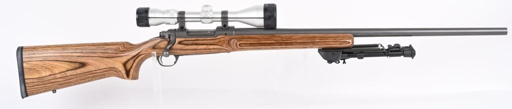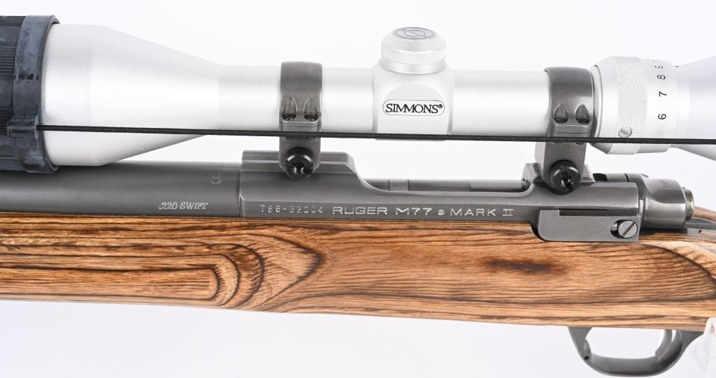 SERIAL NUMBER: 786-32004. BARREL: 26". CALIBER: .220 SWIFT. MANUFACTURED: 1999. Heavy varmint barrel. Optic gun with Ruger factory rings. In the rings sits a Simmons 3-10X44 scope. Matte stainless steel finish and laminate wood stock, with factory black rubber butt pad. Added Harris 1A2 adjustable leg bipod. LOP is: 13-3/4". CONDITION: Metal is excellent overall, as is the wood. Bore is shiny with crisp rifling. Mechanically fine. Scope is excellent, with a clear optic. MODERN