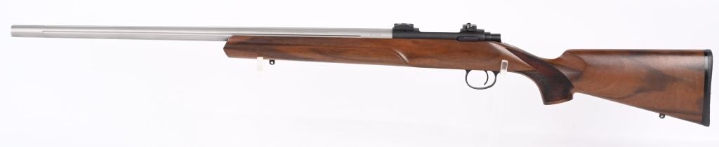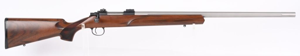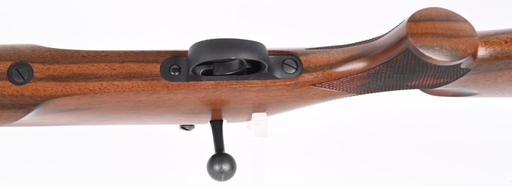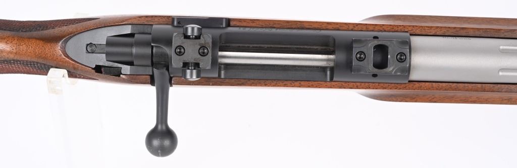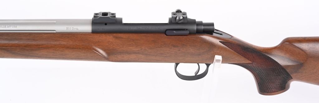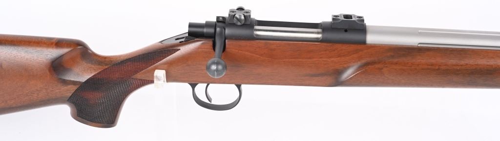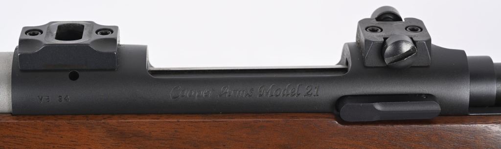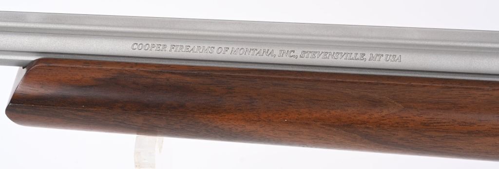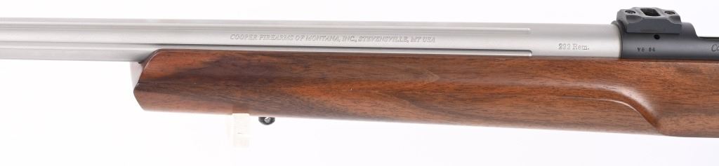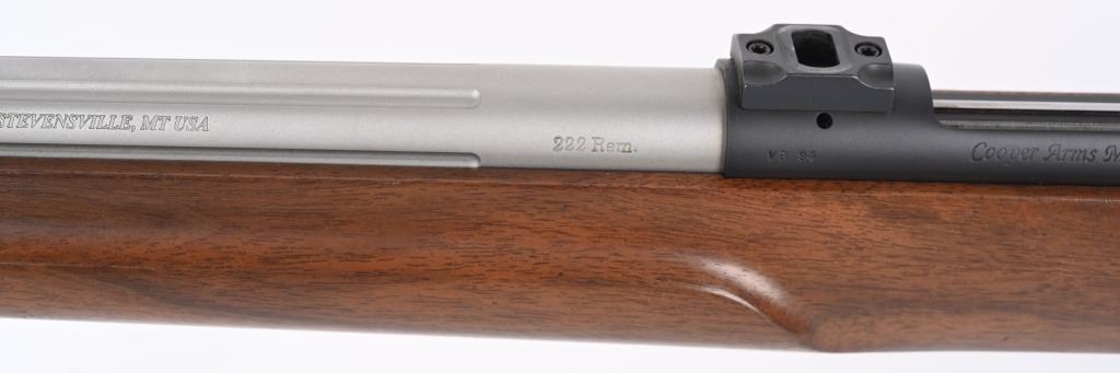 SERIAL NUMBER: VB94. BARREL: 24". CALIBER: .222 REM. MANUFACTURED: 2000'S. Montana address gun, with a medium weight, stainless, fluted varmint barrel. Frame is a matte blued. Added scope blocks. Oiled wood stock, with fine checkering on the wrist and forearm. LOP is: 13-3/4". CONDITION: Metal and wood are excellent overall, with a few handling marks. Bore is shiny and crisp. Mechanically fine. hard to beat a Cooper for varmint hunting. MODERN