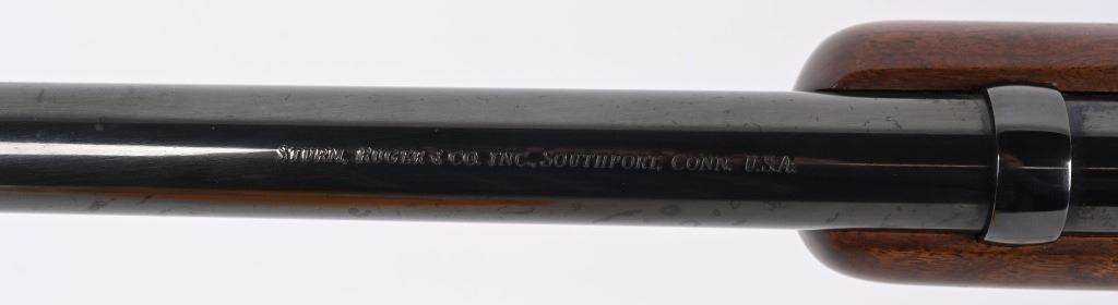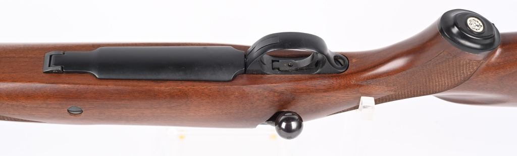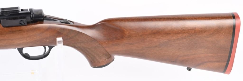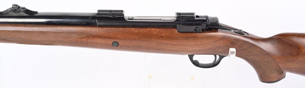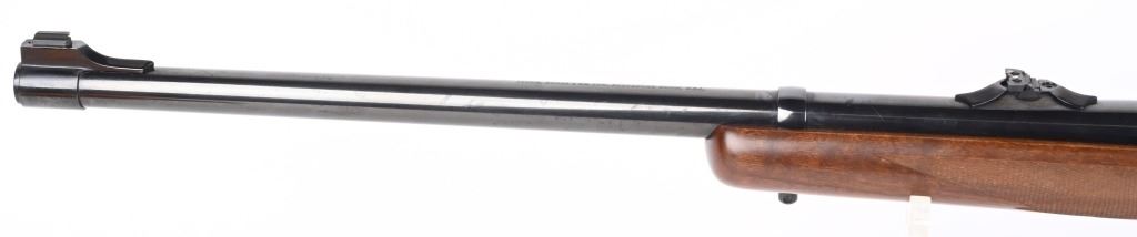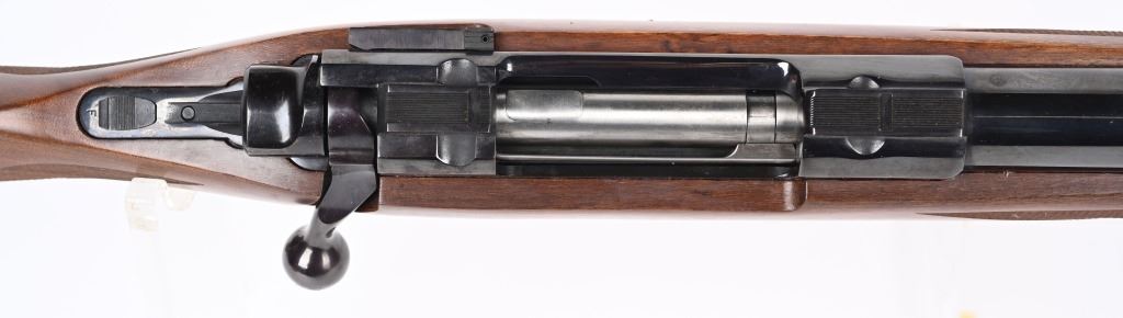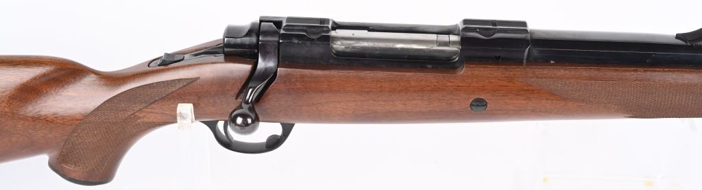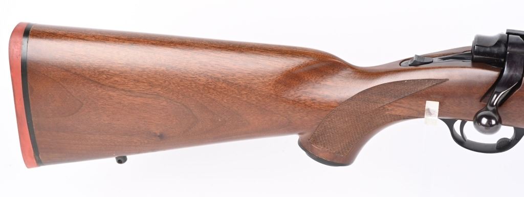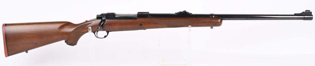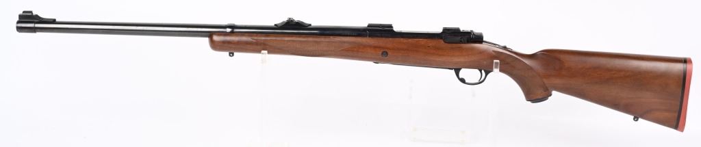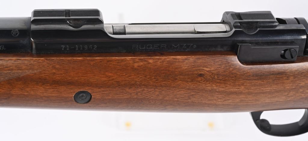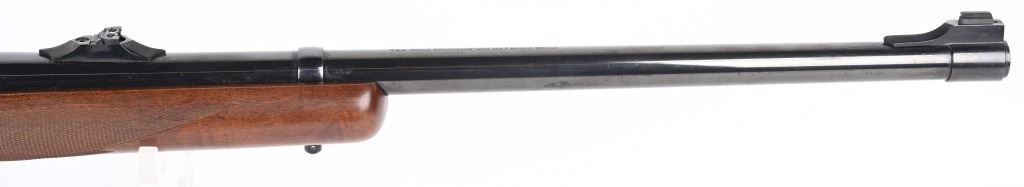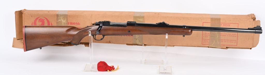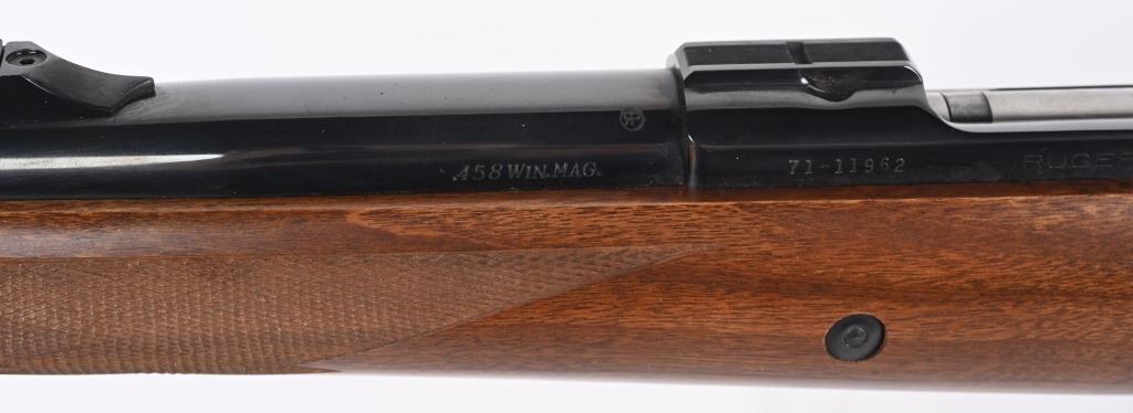 SERIAL NUMBER: 71-11962. BARREL: 24". CALIBER: .458 WIN MAG. MANUFACTURED: 1974. Factory blade front sight and flip up u-notch rear. Original blued finish and oiled wood stock. Fine checkering on the wrist and forearm. Factory red rubber butt pad and plastic capped pistol grip. Tang safety. Includes Ruger factory scope rings, manual and original box. CONDITION: Metal and wood are excellent overall, with little signs of handling. Crisp bore with strong rifling. Mechanically fine. Box is fair, with heavy edge wear and tears. MODERN