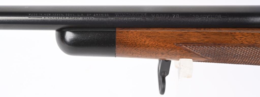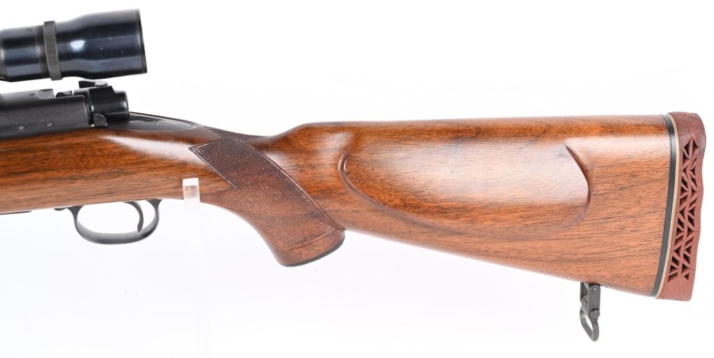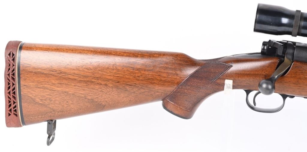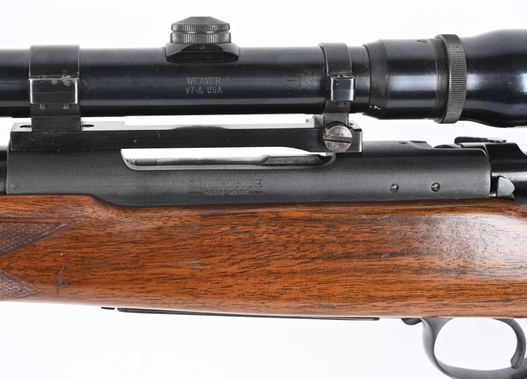 SERIAL 138749. BARREL 24". CALIBER 30-06. MADE IN 1950. Matching bolt number. Super Grade stamped on floor plate, Super Grade sling swivels, Winchester grip cap, black fore-end tip, White Line red rubber waffle pad, hooded front sight, rear sight removed, blue finish. Sports a Weaver V-7 scope in Redfield old style mounts. Scope has standard thin cross hair reticule with good optics. Condition. 98% blue and wood with light handling only. Bore is sharp. Butt pad has some age cracking, needs a Winchester pad. LOP to end of pad is 13 3/4". C&R