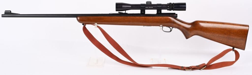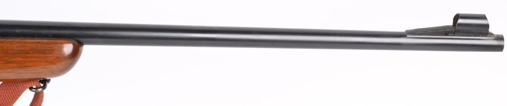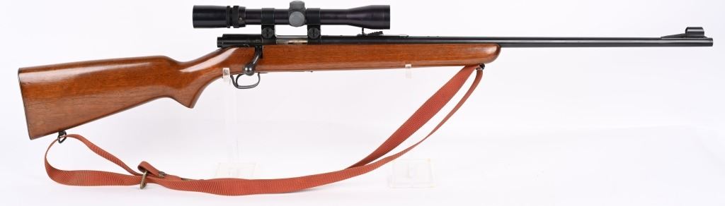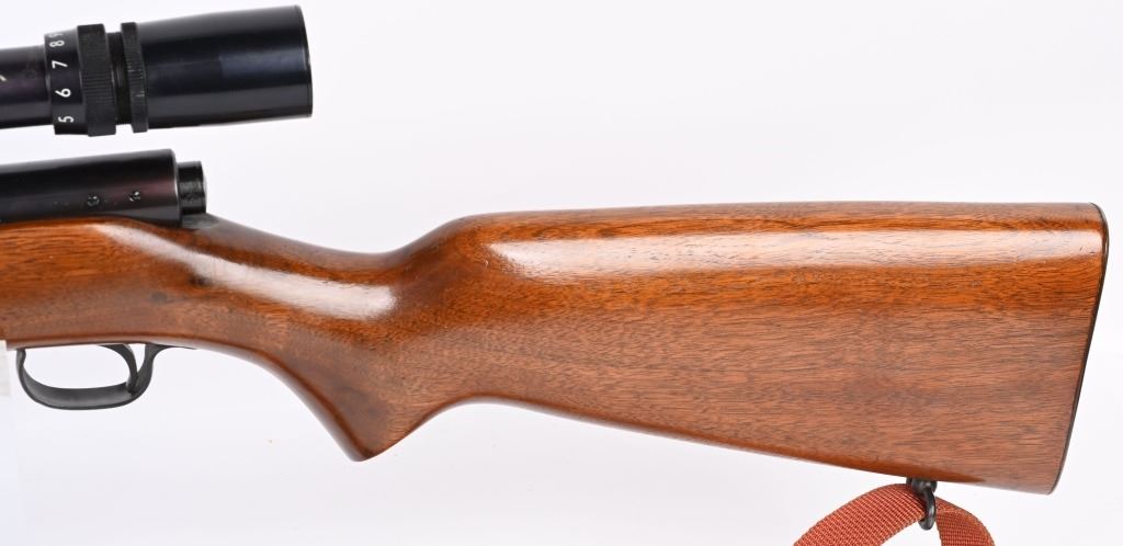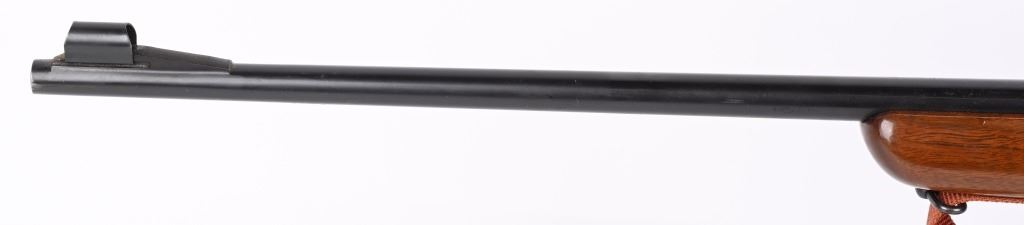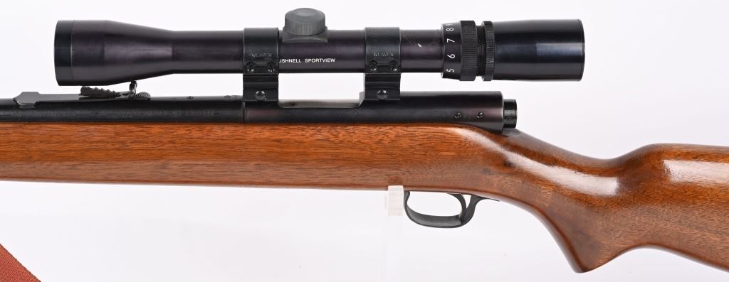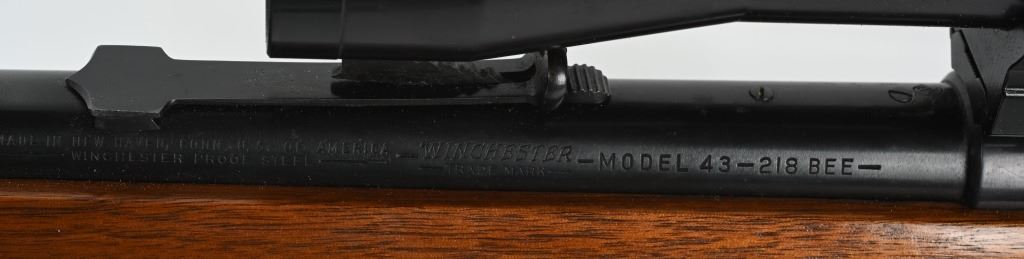SERIAL NUMBER: 25730A. BARREL: 24-1/2". CALIBER: .218 BEE. MANUFACTURED: 1950. Standard markings and Winchester proofs. Factory hooded blade front sight and u-notch rear. Factory drilled for scope mounts on the receiver. Barrel was drilled at some point as well, with a rear plug screw absent. Blued finish, with the receiver turning to a plum color. Oiled wood stock, with a serrated metal butt plate. Includes blued steel magazine (unmarked) and attached Bushnell Sportview 3-9X32 scope. CONDITION: Metal is excellent overall, with light wear. Wood is excellent as well. Bore is clean overall, with strong rifling retained. Scope has a light fog. C&R