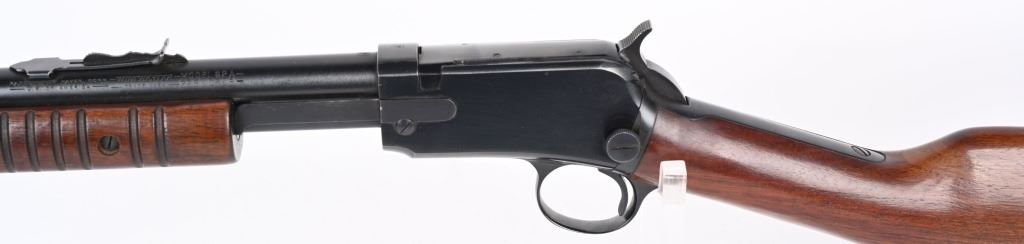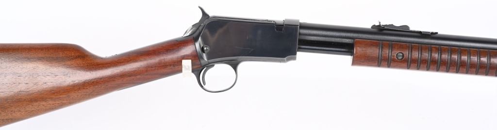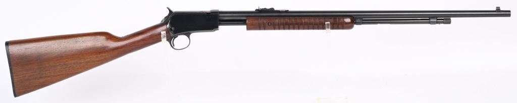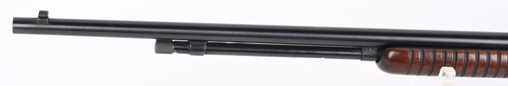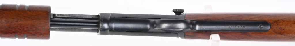 SERIAL 405739. BARREL 23". CALIBER 22 RF. MADE IN 1958. Standard features include round barrel , 2/3 tube magazine, original sporting sights, take down, blue finish, walnut stock with grooved fore-arm and Winchester butt plate. Condition. The only visible metal wear is where bolt slides back on top of frame and some minor high edge wear on slide bar. Wood is near mint as is bore. Worthy of an original box. C&R