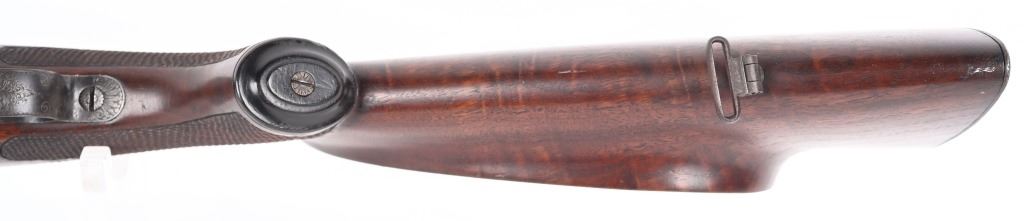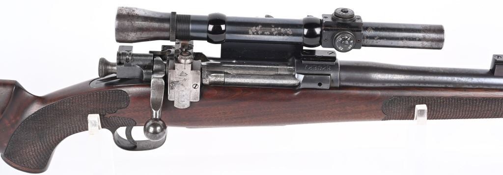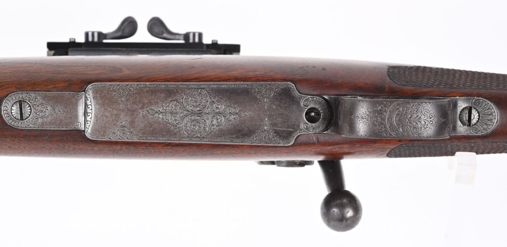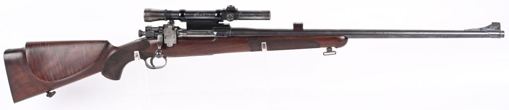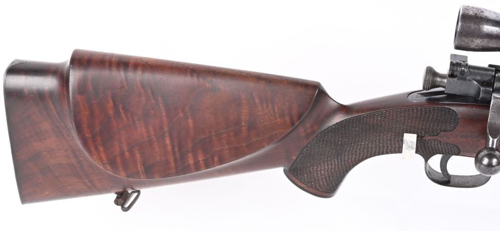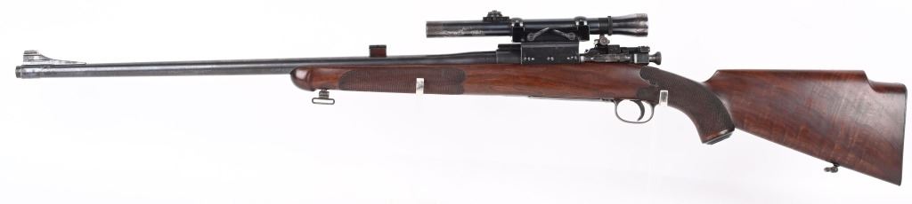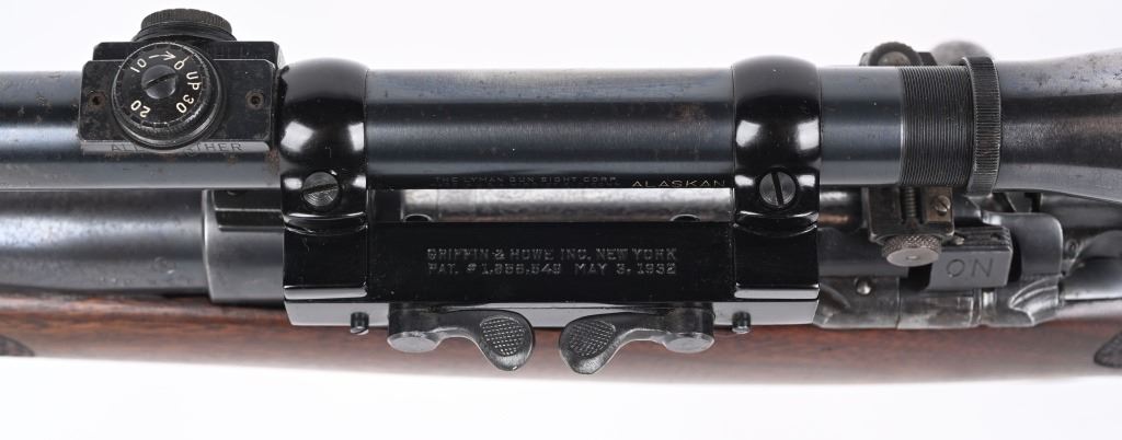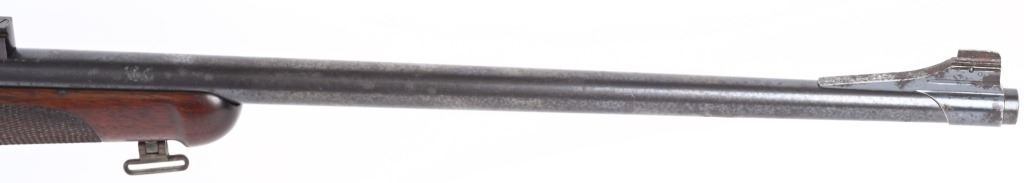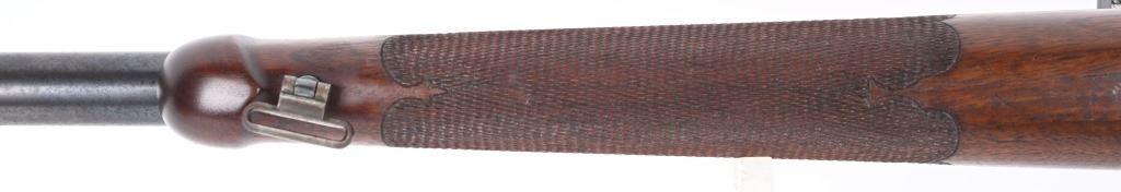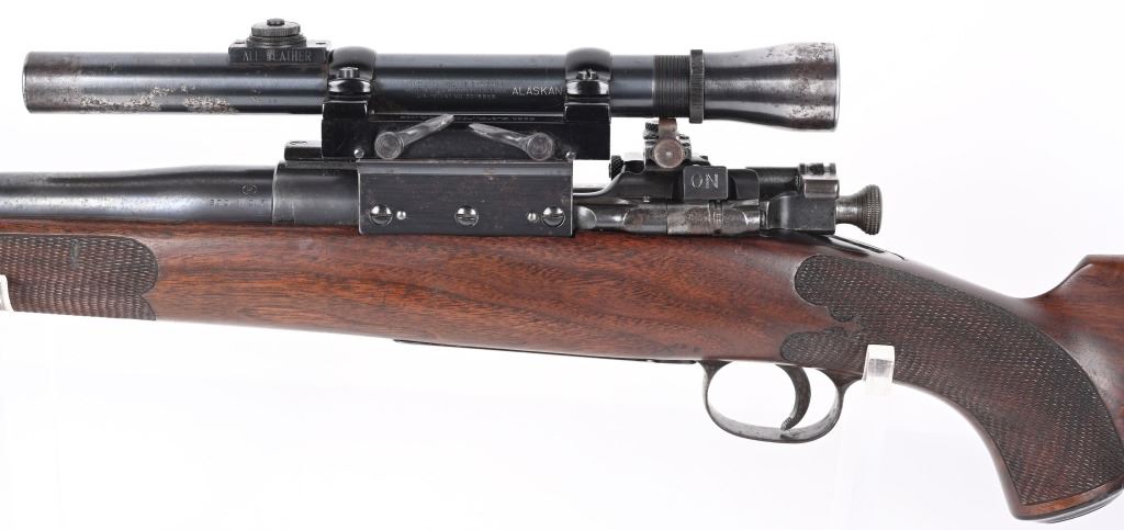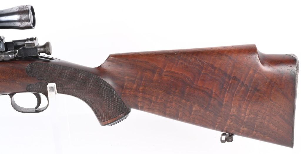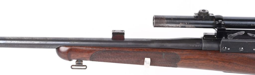 SERIAL 729529. BARREL 24". CALIBER .270 WCF. Niedner opened a gunsmith shop in Malden in 1906. Niedner worked with members of the Massachusetts Rifle Association, including gun barrel-maker Harry Pope, making tools and rifles for ballistics expert Franklin Ware Mann, and prototype Patridge gun sights for inventor Eugene Patridge. Niedner moved to Dowagiac, Michigan in 1920 to establish the Niedner Rifle Company. Niedner manufactured custom rifles for many noted riflemen including Townsend Whelen, Charles Newton, and Ned Roberts. Niedner sold the business in 1940. His custom Mauser and Springfield rifles are considered some of the finest ever made, every bit as high of quality as Griffin & Howe. After World War I, the market was flooded with affordable surplus arms--particularly the well-engineered Mauser 98 and the 1903 Springfield and Rock Island rifles. This launched the beginning of the sporterized bolt action. Among the very first bolt-action pioneers was Adolph Otto (A.O.) Niedner. This 1903 Springfield action features a hand checkered oil finish walnut stock with finely checkered steel trap door butt plate, schnable fore-arm tip, engraved floor plate & trigger guard. ( Kornbrath ?) , custom Niedner barrel not cut for rear sight but has a Lyman right side mounted peep and a Griffin & Howe quick release mount and a period Lyman Alaskan scope with post and line reticle. The gun boast A-O scope blocks and sling swivels. The bolt is wormed to retain oil. Barrel has Niedner Co. legend. Condition. 90% blue with overall scattered age freckling. Floor plate & guard are patina. Stock is excellent with just minor impressions. Bore is strong. Scope has areas of no finish and some poor storage pitting. Fine rifle as is but if metal was professionally refinished and a better condition scope added, would be a show stopper. C&R