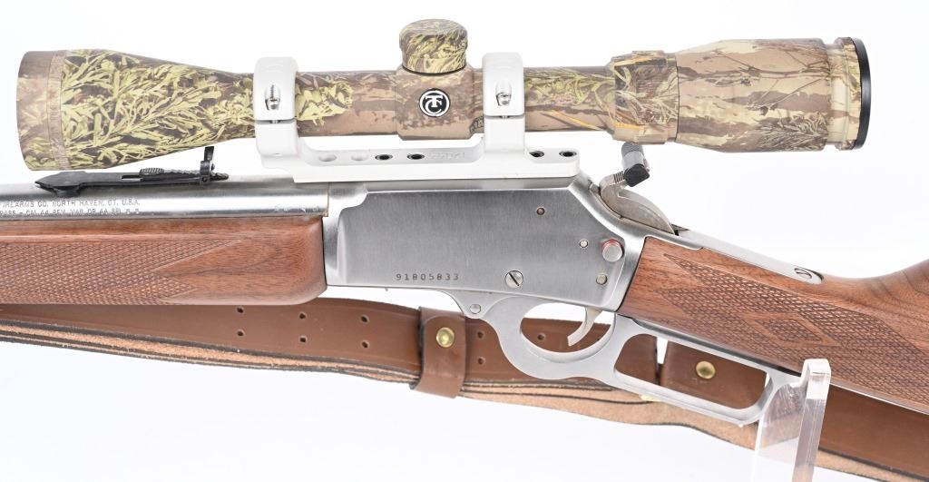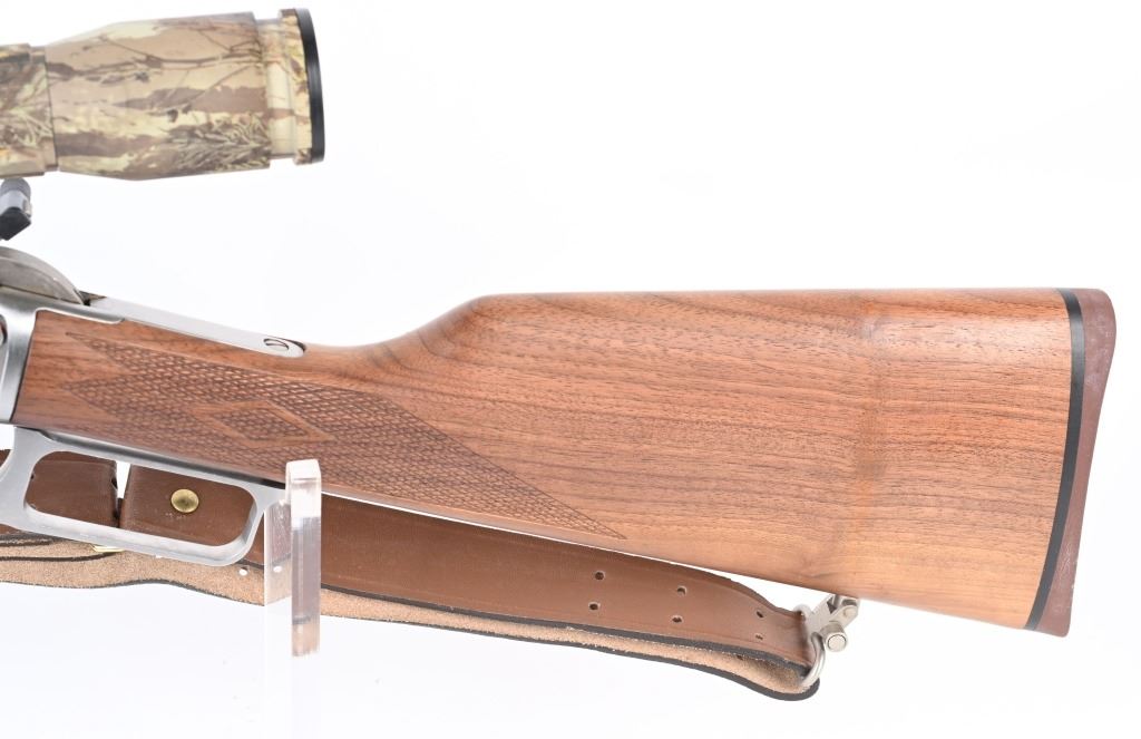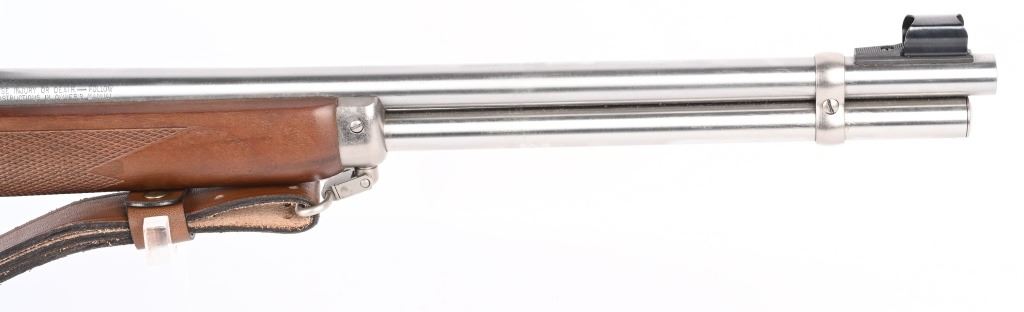 SERIAL 91805833. BARREL 20" CALIBER 44 MAGNUM. Features full round barrel & magazine, hooded ramp front sight with sporting rear, checkered walnut stock with solid red pad and sling . Stainless mounts hold a TC camo scope, 9-power with standard cross hair reticules and perfect optics. Condition. Near mint with light handling and mirror bore. MODERN