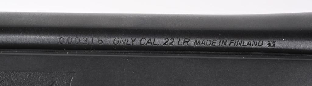 SERIAL 490635. BARREL 22". CALIBER 22LR. MADE IN FINLAND. Blue barrel made without sights, Picatinny rail on frame, pistol grip black nylon stock, sling eyes. This rifle is unique in that you can change barrels to different calibers which can be purchased separately. Condition. Near new with light handling. MODERN