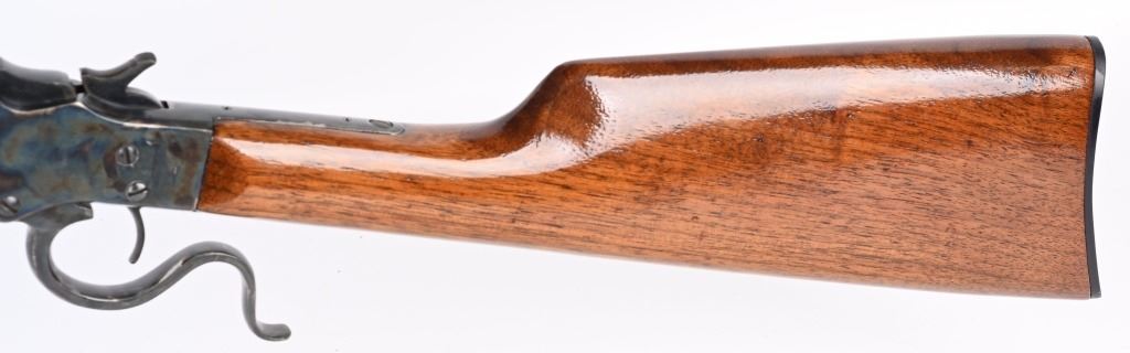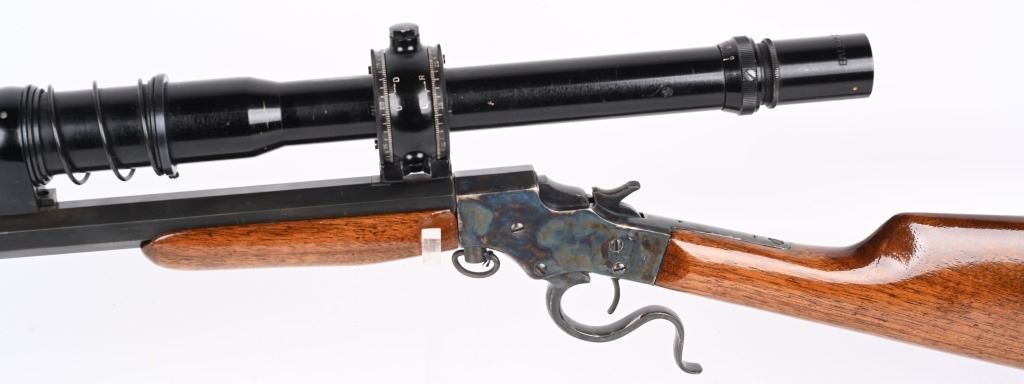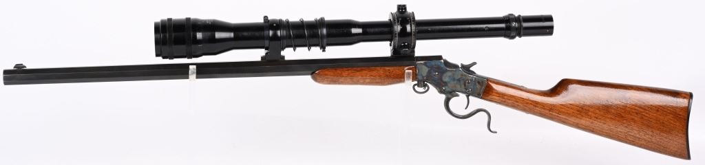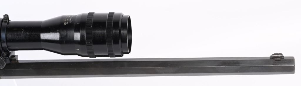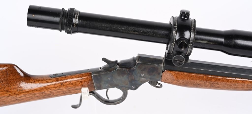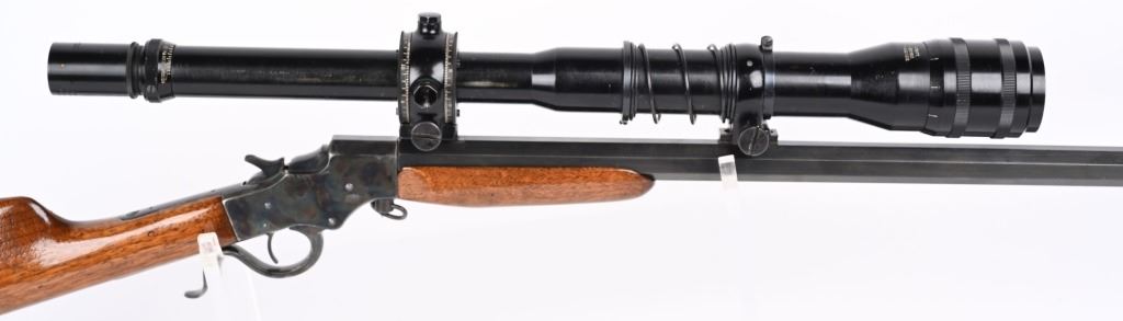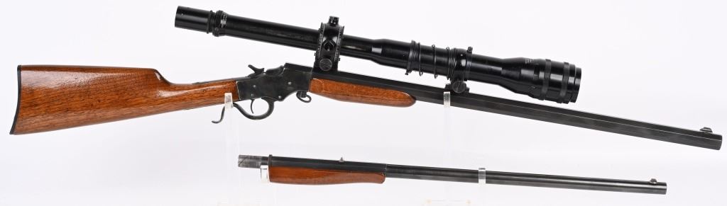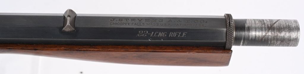 SERIAL NSN. BARREL ORIGINAL 22. CUSTOM 25". CALIBER .22LR. Features an original part octagon blue barrel, case color frame, walnut stocks with Stevens gutta percha butt plate. Rifle is a take down and comes with an extra octagon barrel with scope blocks and wears a Balvar 24 target scope with standard cross hair reticle , clear optics, 24 power scope. Condition. Entire gun, metal and wood restored to near new. 99% bright case colors and blue. Wood near mint as refinished. Original barrel rifling very good with bright as lined octagon barrel. C&R