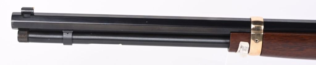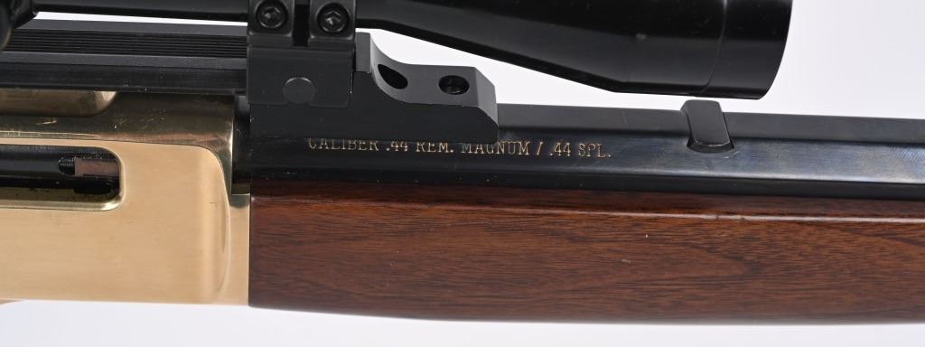SERIAL BB0044117. BARREL 20". CALIBER 44 MAGNUM. Features brass frame, octagon barrel, brass barrel band, walnut stock, brass butt plate and sporting an unmarked scope with standard cross hairs and clear optics. Condition. Few handling marks on brass. 99% blue intact. Mirror bore. MODERN