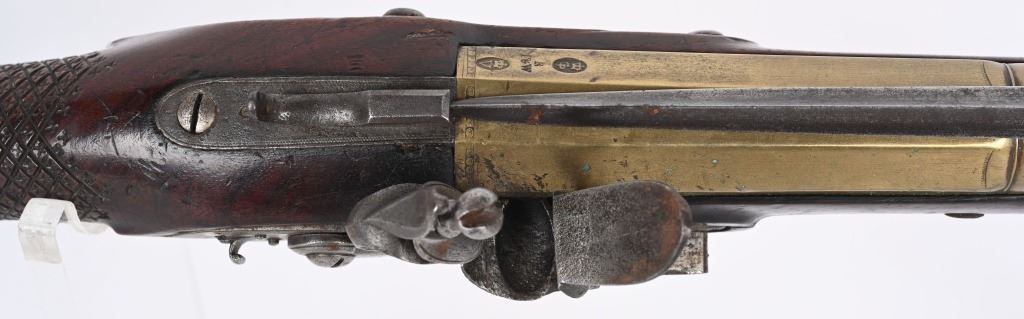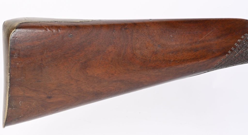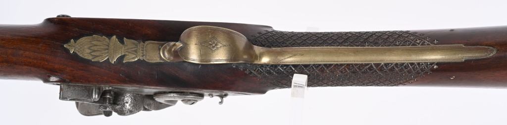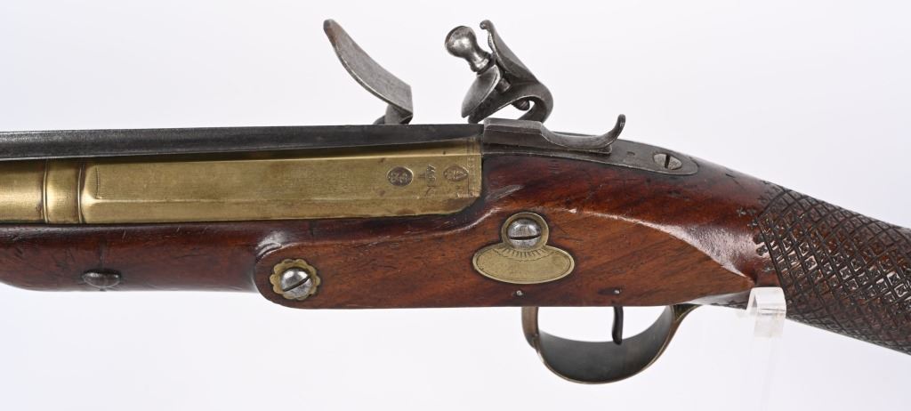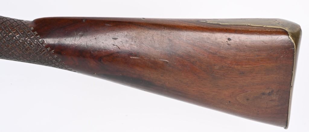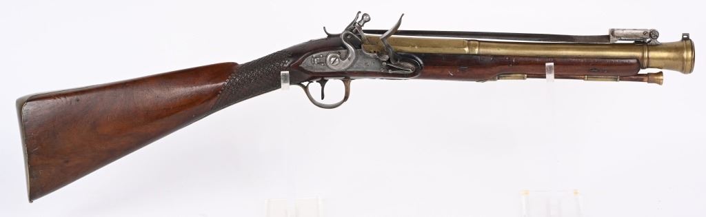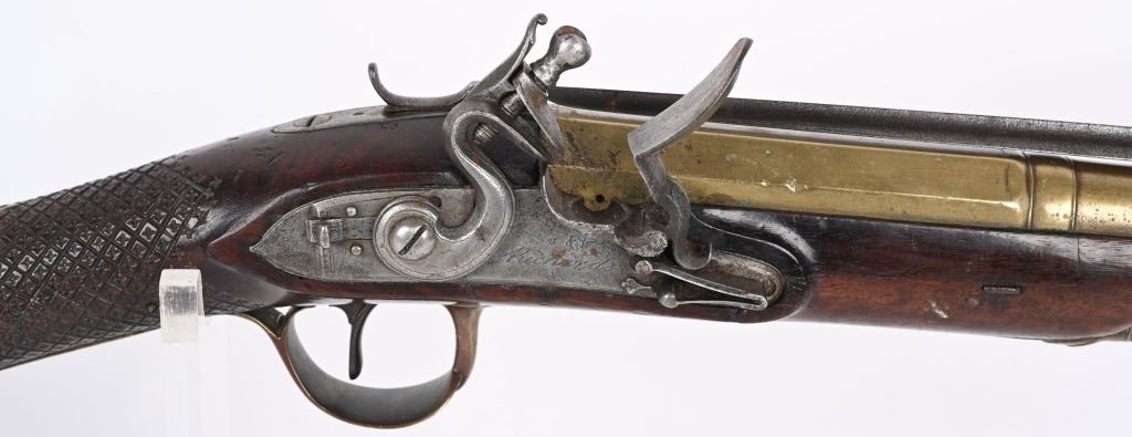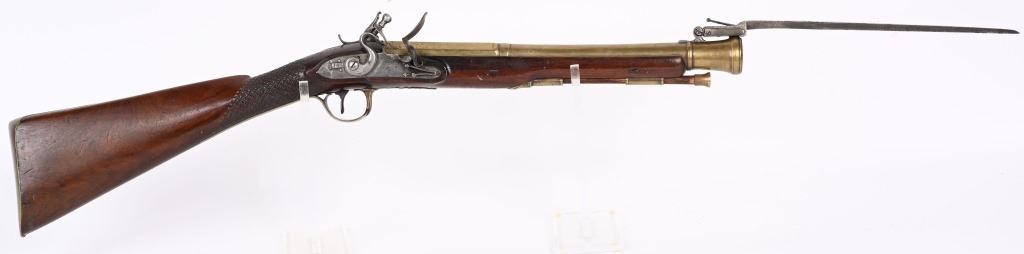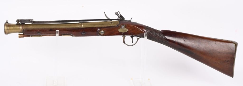 SERIAL NUMBER N/A BARREL 14 3/8" CALIBER 1 1/4" BELLED MUZZLE MANUFACTURED CIRCA 1808-10. Produced J7W Richards of Staining Lane London Circa 1808-1810 with part octagon to round with belled cannon barrel muzzle. Mounted with sprung triangular bayonet. London proofed at breech and signed J&W. Lock is signed J&W RICHARDS in script with sliding cock lock. One piece oil finished walnut stock with diamond pattern embellishment at wrist. Brass butt plate with small chiseled border and stand of arms engraved at heel. Brass trigger guard with small rope border and Pineapple finial. Wooden wiping rod with brass tip. Barrel retained by 2 wedges. CONDITION, Extremely fine with brass being a great mellow patina. The bore being uncleaned and dark. Action operates properly. Stock is full sized and with a few minor bruises and impressions but remains excellent. Lock operates properly although sluggish. Lock has some evidence of earlier oxidation on underside of pane and at rear. A wonder Blunderbuss. ANTIQUE