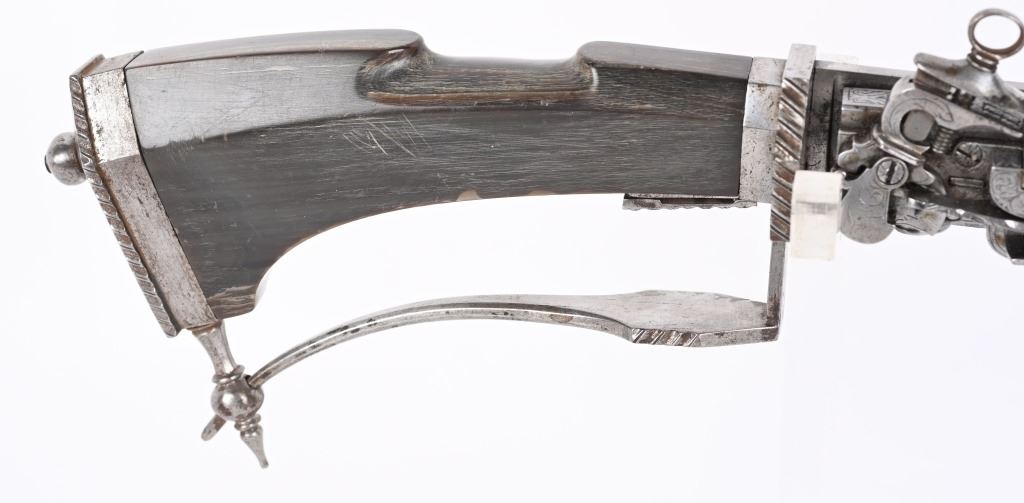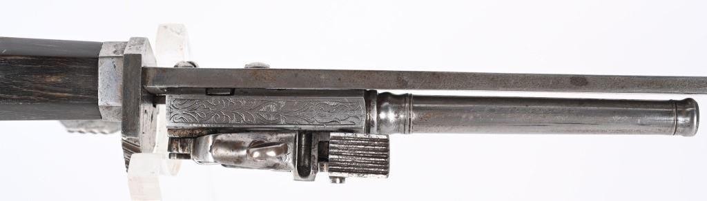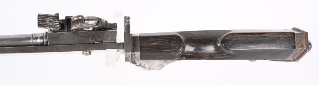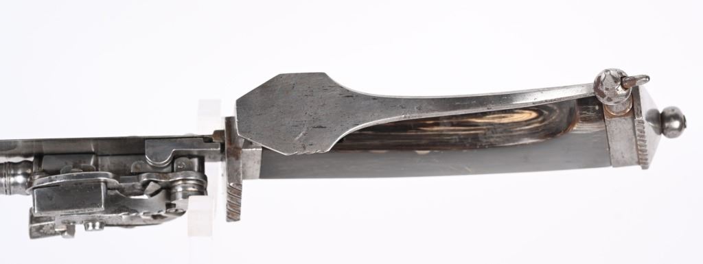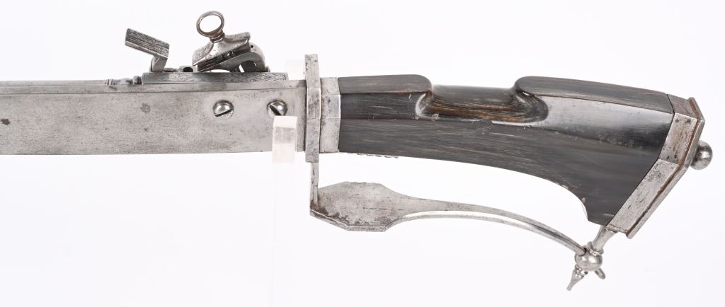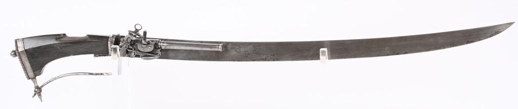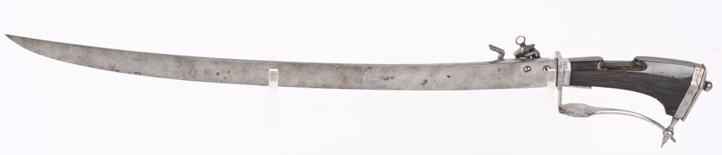 SERIAL NUMBER N/A BARREL 3 3/4" CALIBER .32 BLACK POWDER MANUFACTURED CIRCA VICTORIAN ERA. Large German hunting sword with 23" swept blade. buffalo horn handle with chiseled iron but and ornate filed guard. Mounted is a Miquelet exposed lock single shot pistol. Trigger is concealed in the handle / grip of the sword. No markings or proofs are evident. The Lock is lightly scroll engraved. CONDITION, Very fine with slight spotting on blade from age and use. The Miquelet action is good condition but needs adjustment to stay at full cock. Handle is very fine with a very few minor scratches. The guard is equally fine. ANTIQUE