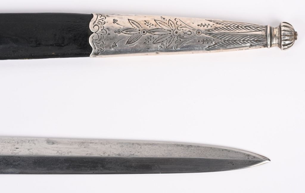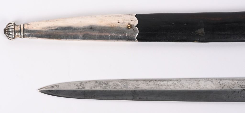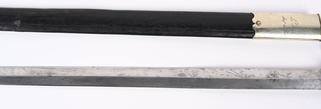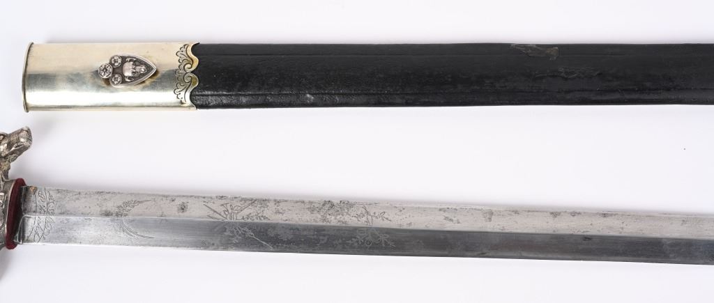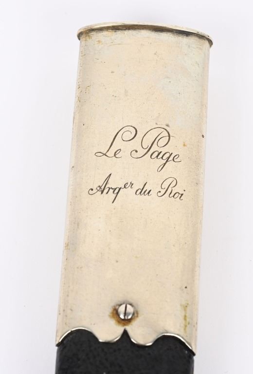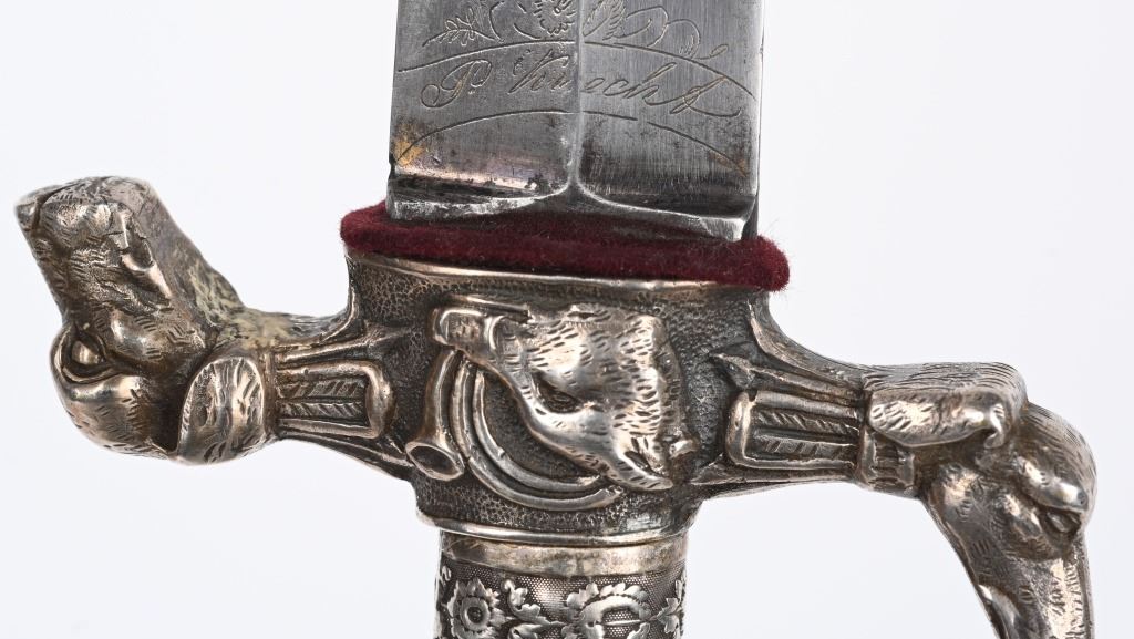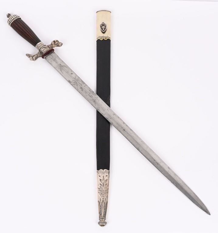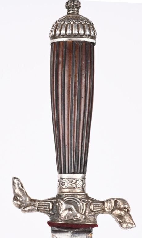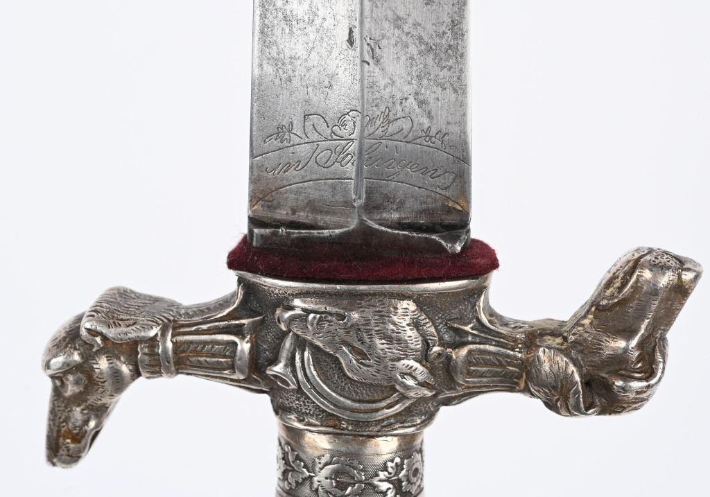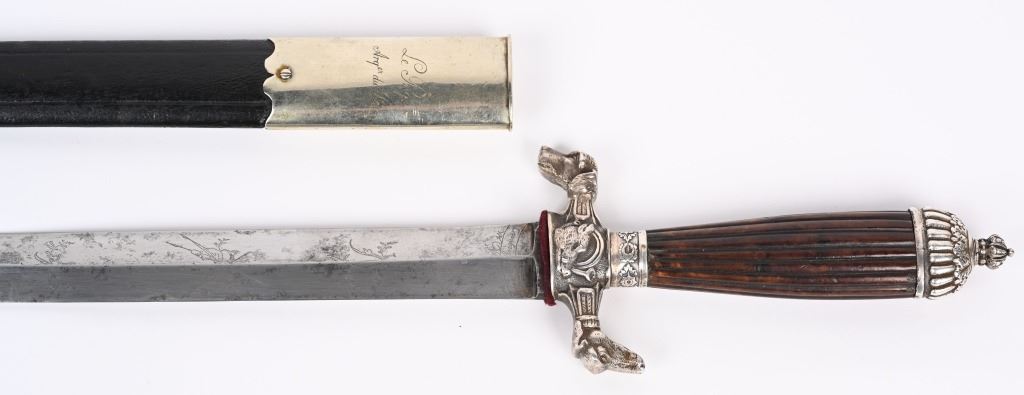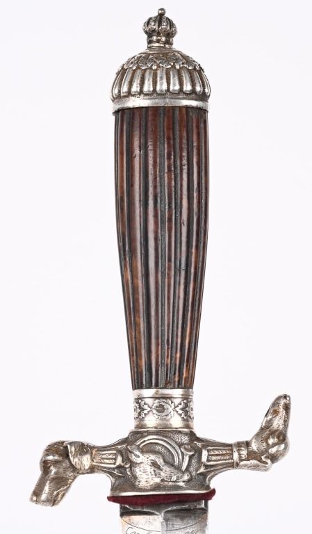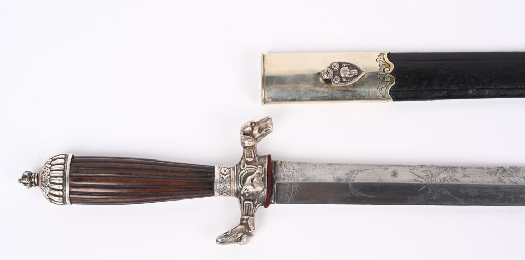Classic European hunting sword with 22 inch double edged blade with engraved scenes of stands of arms and florettes. Marked at ricasso "P. Knecht" and on opposite ricasso "in Sologens". Guard is silver mounted with hunting dog heads and a central boars head with hunting horn in background. A floral embossed collar is above guard. Handle is of burl wood and is finely fluted. But and cap are of silver and is done in oval flutes and a royal crown as the retaining nut. Sword is housed in a silver mounted black leather scabbard. The tip is engraved with splays of floral with geometric designs at base. The throat is solver with the hanger stud embossed with a hunting hounds head with flower above it. Back side is engraved. "LePage Arqer du Roi". The black leather is very rigid. CONDITION, Very good with blade showing signs of an earlier cleaning. The handle ,guard and butt cap are excellent. The throat and scabbard tip are very fine. The leather has evidence of a prior expert repair. ANTIQUE