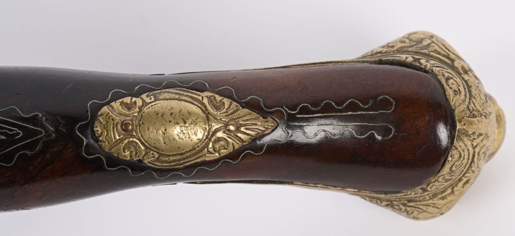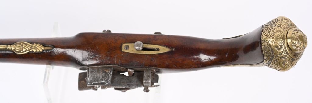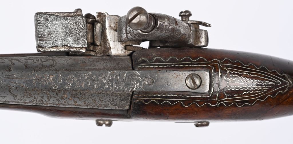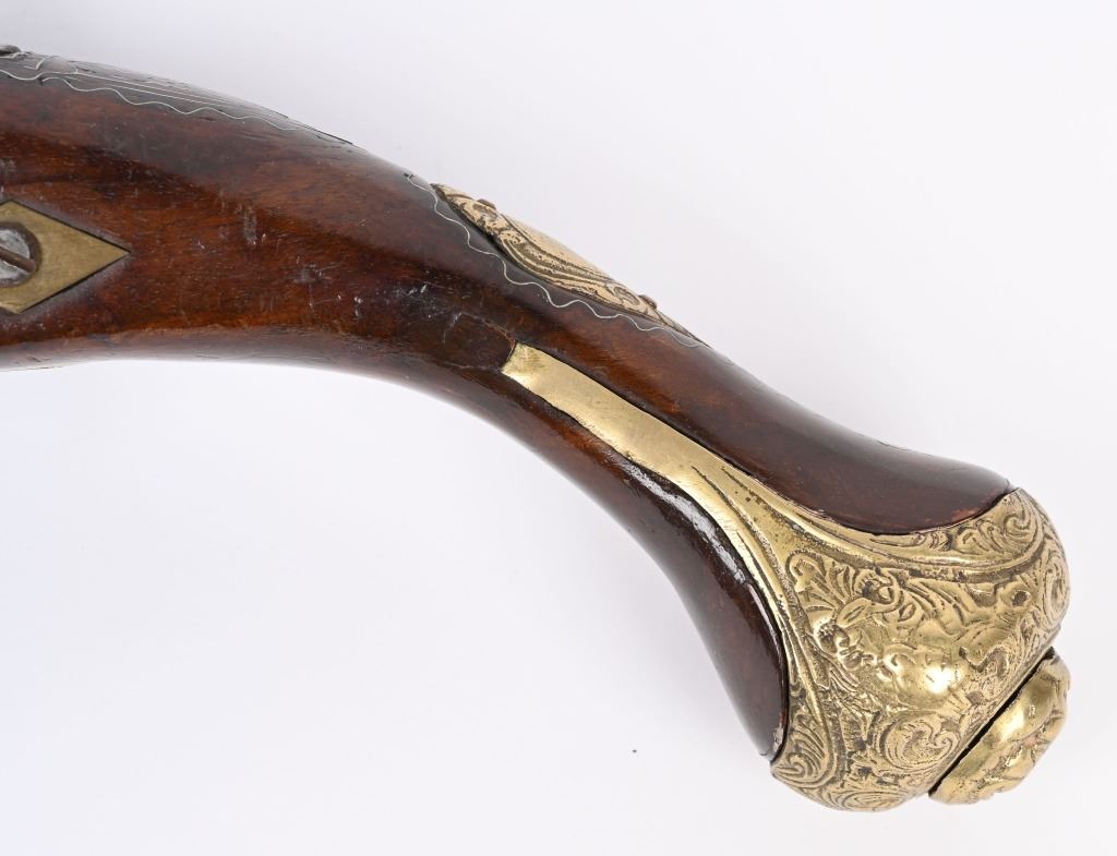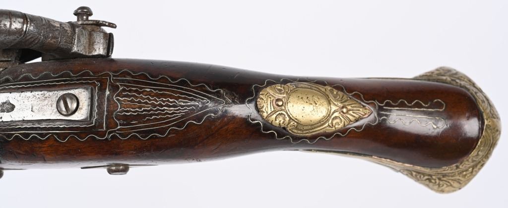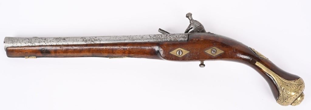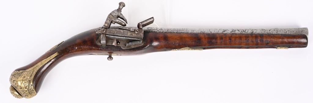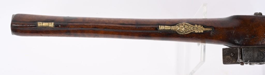 SERIAL NUMBER N/A BARREL 11 3/8" CALIBER 65 SMOOTHBORE MANUFACTURED CIRCA 1840'S. Ornate chisel engraved swamped round barrel with inset front sight. One piece striped walnut stock with elaborate cast brass butt cap with ugly face and medium stirrups. Numerous wire inlays to rear of tang and surrounding brass name plate on top of wrist. Miquelet lock is moderately engraved with brass wire inlay and moderate scroll engraving. CONDITION, Good as uncleaned. Action operates properly. Stock is good and full sized with small impressions and bruises. No cracks or material losses. Metal is a dove grey from use and age.ANTIQUE