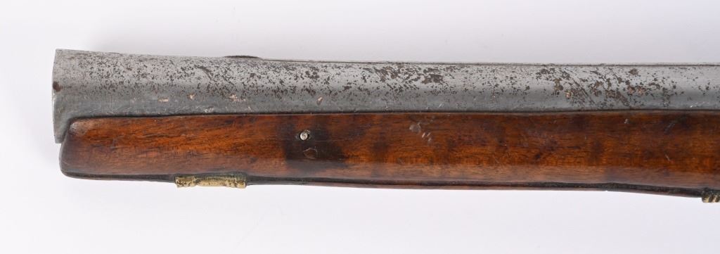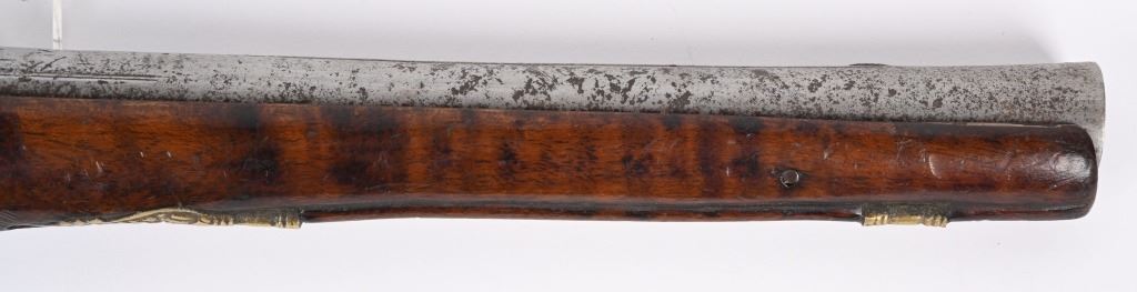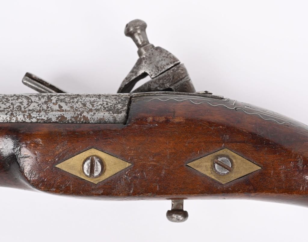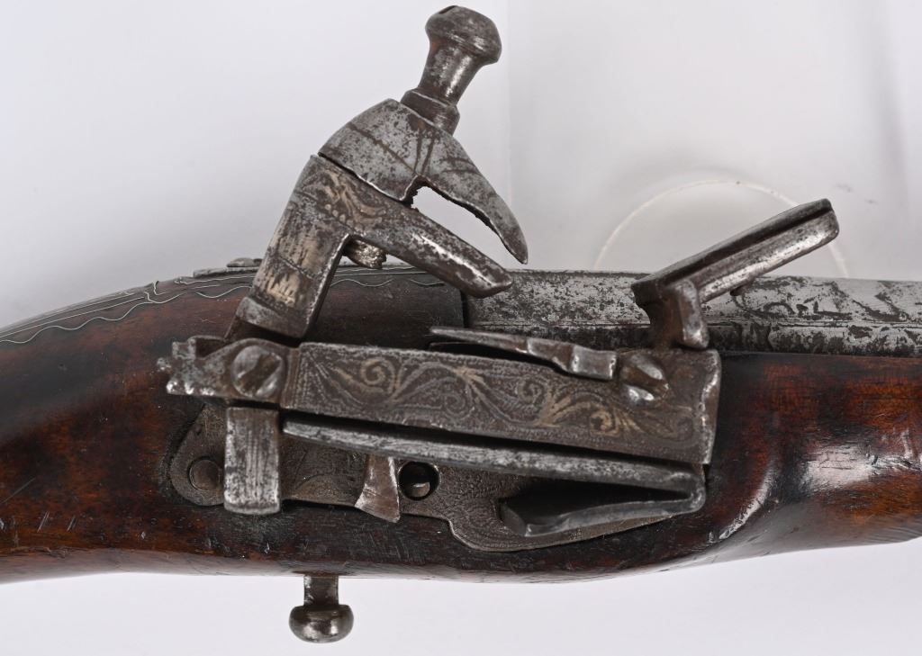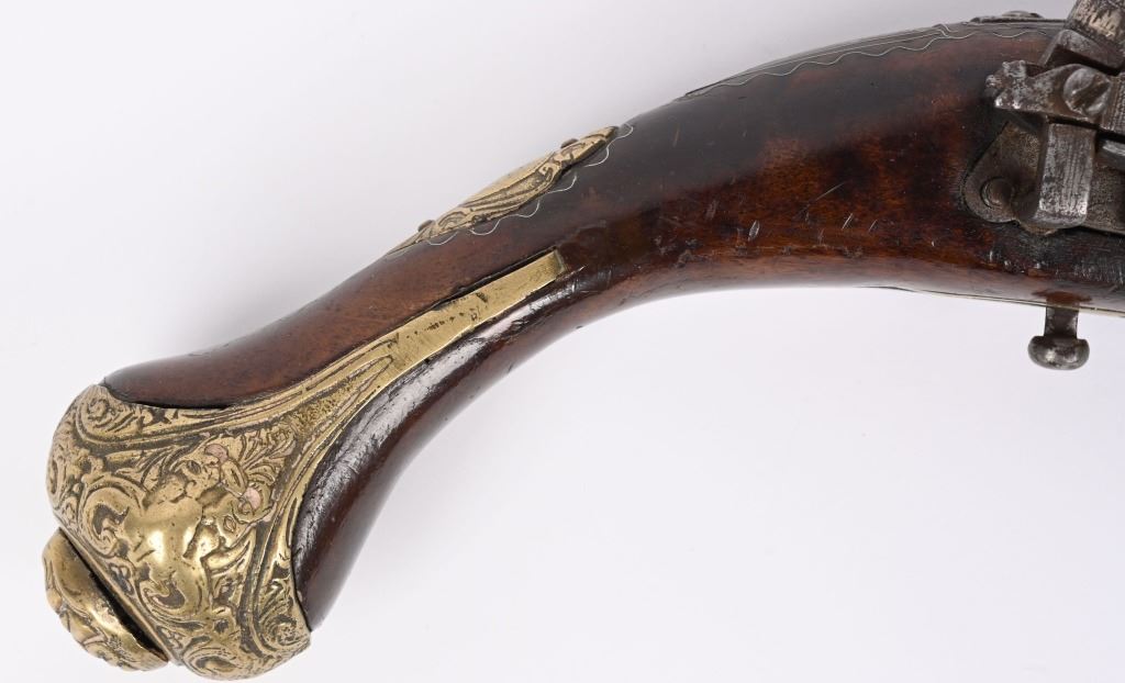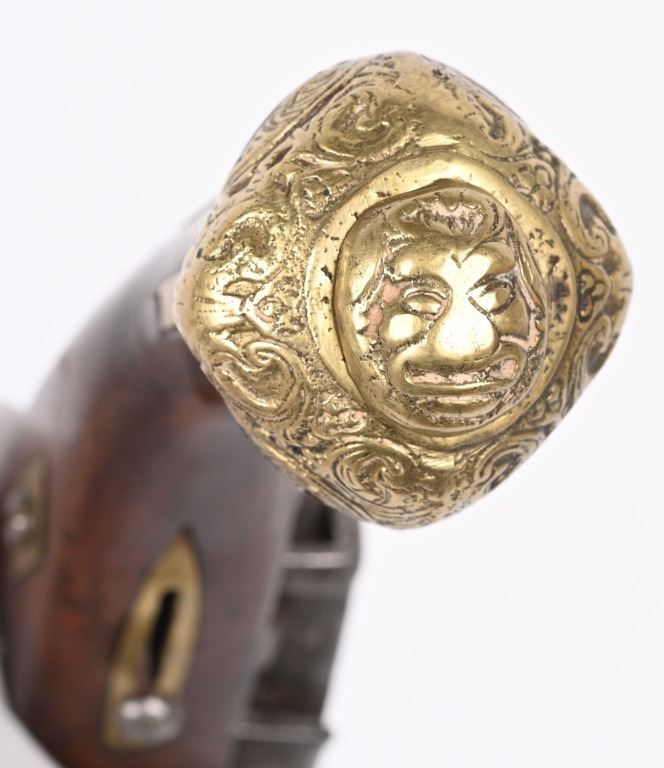 SERIAL NUMBER N/A BARREL 11 3/8" CALIBER 65 SMOOTHBORE MANUFACTURED CIRCA 1840'S. Ornate chisel engraved swamped round barrel with inset front sight. One piece striped walnut stock with elaborate cast brass butt cap with ugly face and medium stirrups. Numerous wire inlays to rear of tang and surrounding brass name plate on top of wrist. Miquelet lock is moderately engraved with brass wire inlay and moderate scroll engraving. CONDITION, Good as uncleaned. Action operates properly. Stock is good and full sized with small impressions and bruises. No cracks or material losses. Metal is a dove grey from use and age.ANTIQUE