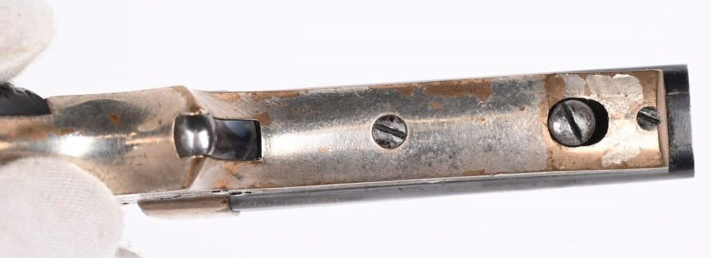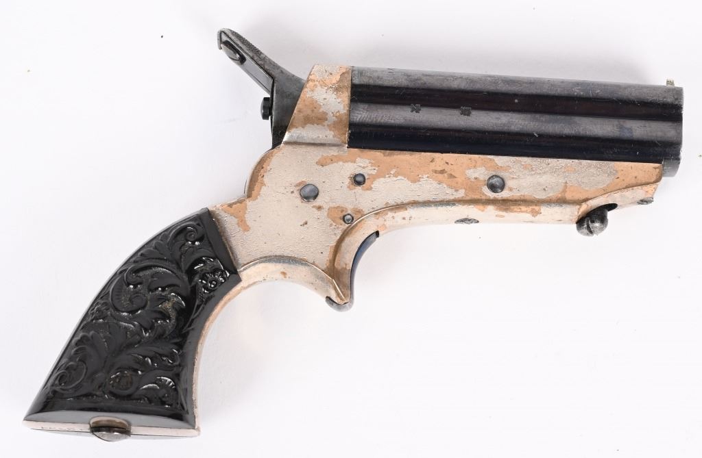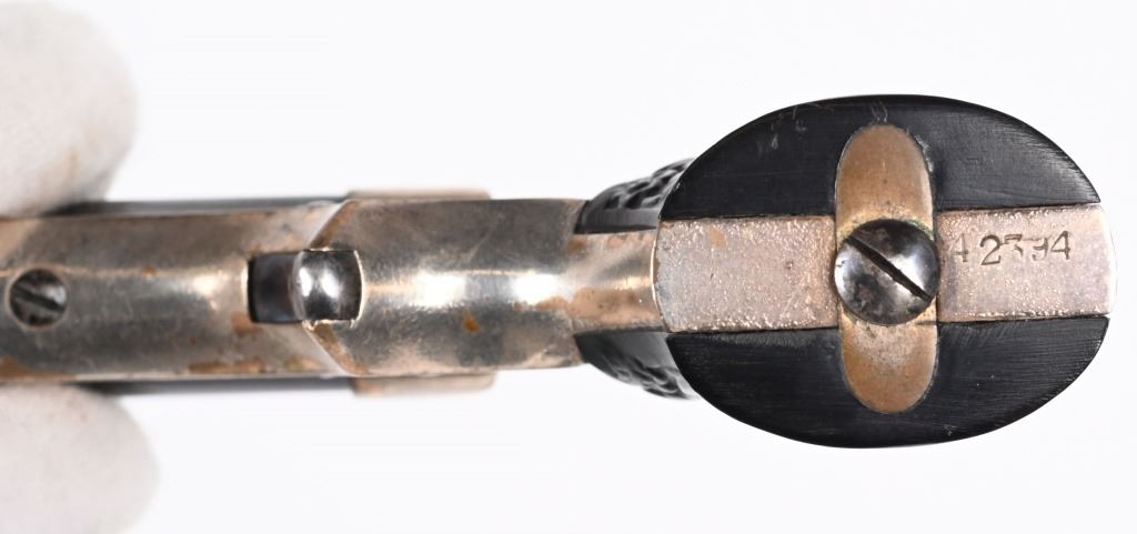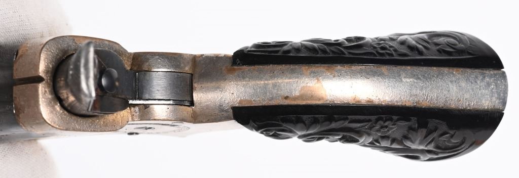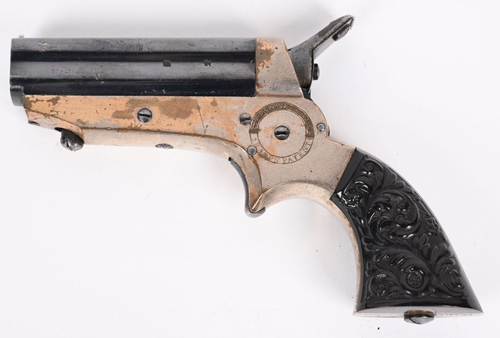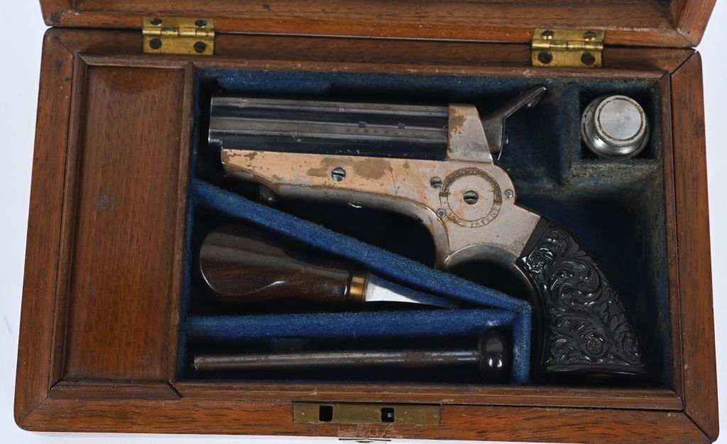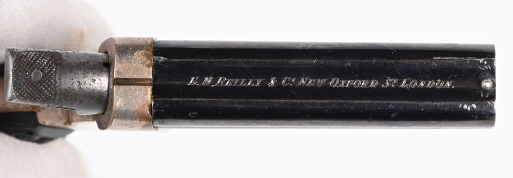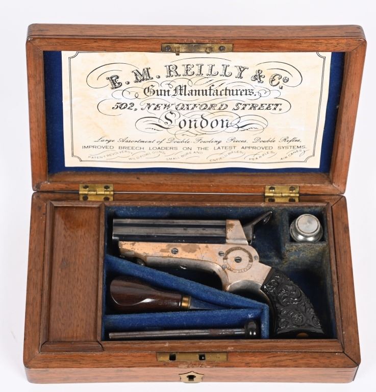 SERIAL NUMBER 42394 BARREL 2 1/2" CALIBER .22 RIM FIRE MANUFACTURED CIRCA 1865-70. high polished blue 4 shot barrel cluster with top channel retailer marked "E.M.RILEY & CO, OXFORD LONDON" Silver plated brass frame with floral embossed gutta percha 2 piece grips. Serial numbered on bottom of grip. Pistol is housed in English Oval , partitioned case with oiler, turn screw and wiping rod. Interior of lid has Riley label. CONDITION, Very fine with most all blue finish remaining on barrel cluster. Frame retains 65% silver with balance toned to mellow mustard patina. Grips are very fine with no chipping or material loss. Case is extremely fine with excellent lining and fine accessories. Label is contemporary. Exterior of case is very fine with some small period of use imperfections. ANTIQUE